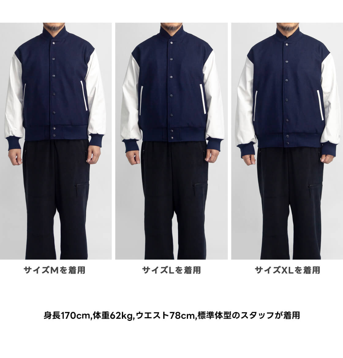 M / 着丈64 / 身幅61 / 肩幅51 / 袖丈57 モデル着用 170cm/62kgでLサイズ 素材 表地(ウール50% ポリエステル50%) カラー展開 ネイビーホワイト 生産国 中国 モデル着用コメント Lサイズを着用しました。身幅や肩幅、アームホールに余裕があり、ゆったり目なシルエットで着こなせます。メルトン・レザー・中綿のスタジャンとしては比較的着心地も軽いです。Lサイズだと袖丈は少しだけ長めさですが、気になるほどではありません。正直Mサイズでも、身幅はゆったりと着用できますので、僕くらいの身長の方であればMサイズで良いかと思います。個人的にオーバー目に着用したいのでLを着用しています。 スタッフ着用コメント LとXLサイズを着用しました。XLでは身幅はゆったりとした余裕があり厚手のニットやスウェットなども着込めます。Lサイズでもゆったりしていますし、正直XLでもLサイズでも、全然着用出来ます。全体的にゆったりオーバー目ならXL、ジャスト目に近いサイズ感ならLサイズといった感じです。 |
