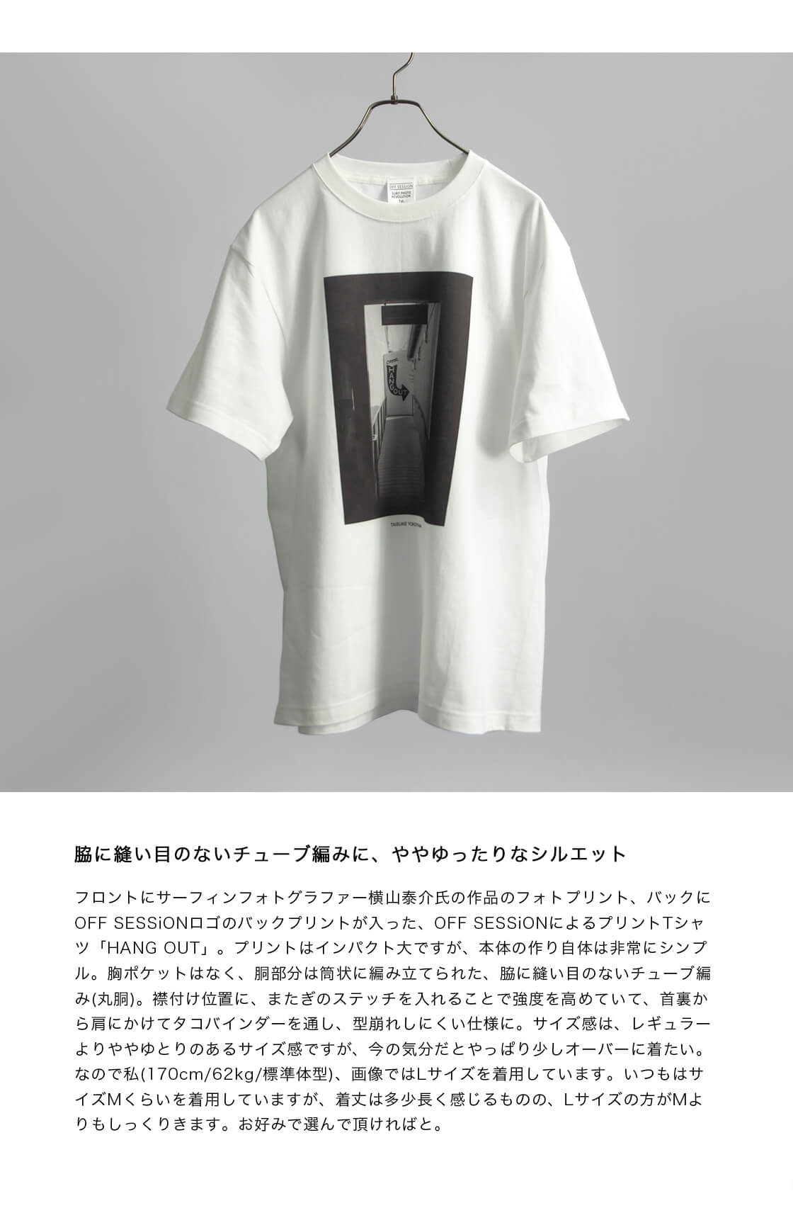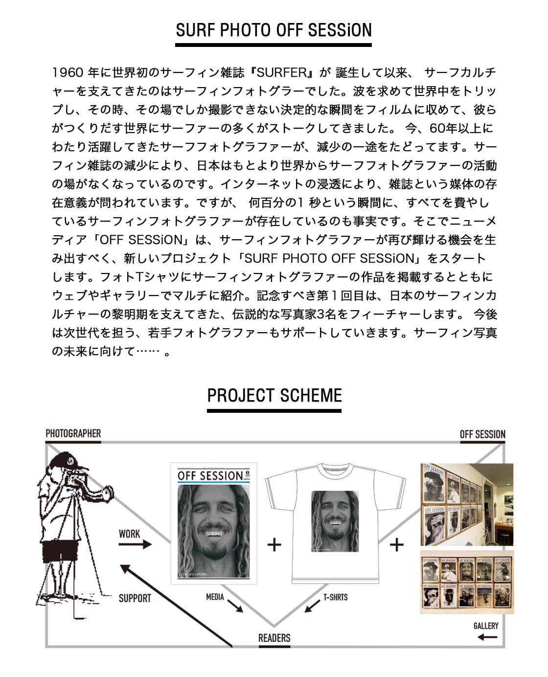 1960 年に世界初のサーフィン雑誌『SURFER』が 誕生して以来、 サーフカルチャーを支えてきたのはサーフィンフォトグラーでした。波を求めて世界中をトリップし、その時、その場でしか撮影できない決定的な瞬間をフィルムに収めて、彼らがつくりだす世界にサーファーの多くがストークしてきました。 今、60年以上にわたり活躍してきたサーフフォトグラファーが、減少の一途をたどってます。サーフィン雑誌の減少により、日本はもとより世界からサーフフォトグラファーの活動の場がなくなっているのです。インターネットの浸透により、雑誌という媒体の存在意義が問われています。ですが、 何百分の1 秒という瞬間に、すべてを費やしているサーフィンフォトグラファーが存在しているのも事実です。そこでニューメディア「OFF SESSiON」は、サーフィンフォトグラファーが再び輝ける機会を生み出すべく、新しいプロジェクト「SURF PHOTO OFF SESSiON」をスタートします。フォトTシャツにサーフィンフォトグラファーの作品を掲載するとともにウェブやギャラリーでマルチに紹介。記念すべき第1回目は、日本のサーフィンカルチャーの黎明期を支えてきた、伝説的な写真家3名をフィーチャーします。 今後は次世代を担う、若手フォトグラファーもサポートしていきます。サーフィン写真の未来に向けて......。