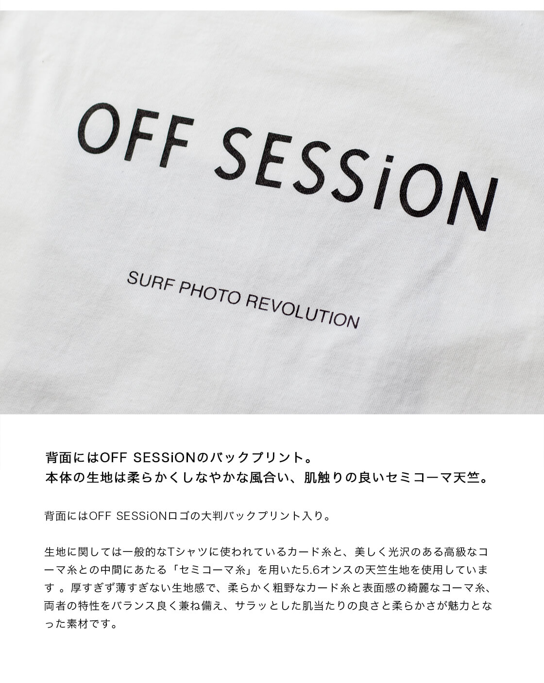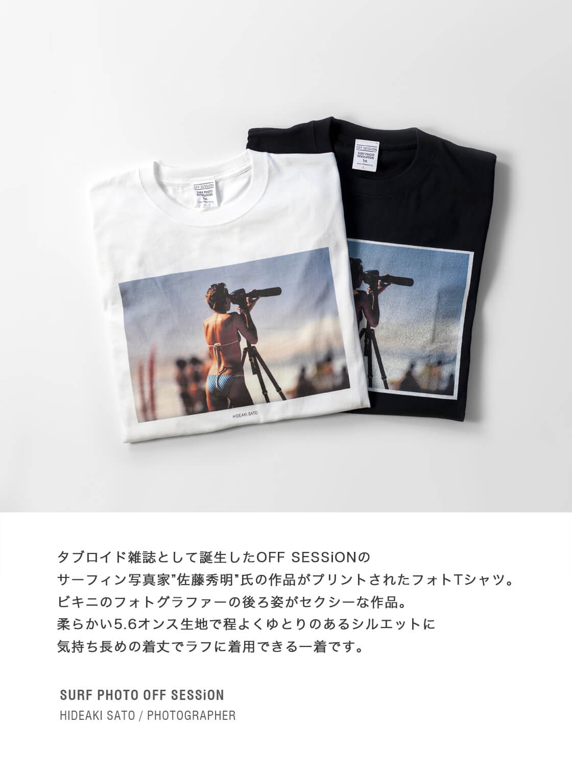 1960 年に世界初のサーフィン雑誌『SURFER』が 誕生して以来、 サーフカルチャーを支えてきたのはサーフィンフォトグラーでした。波を求めて世界中をトリップし、その時、その場でしか撮影できない決定的な瞬間をフィルムに収めて、彼らがつくりだす世界にサーファーの多くがストークしてきました。 今、60年以上にわたり活躍してきたサーフフォトグラファーが、減少の一途をたどってます。サーフィン雑誌の減少により、日本はもとより世界からサーフフォトグラファーの活動の場がなくなっているのです。インターネットの浸透により、雑誌という媒体の存在意義が問われています。ですが、 何百分の1 秒という瞬間に、すべてを費やしているサーフィンフォトグラファーが存在しているのも事実です。そこでニューメディア「OFF SESSiON」は、サーフィンフォトグラファーが再び輝ける機会を生み出すべく、新しいプロジェクト「SURF PHOTO OFF SESSiON」をスタートします。フォトTシャツにサーフィンフォトグラファーの作品を掲載するとともにウェブやギャラリーでマルチに紹介。記念すべき第1回目は、日本のサーフィンカルチャーの黎明期を支えてきた、伝説的な写真家3名をフィーチャーします。 今後は次世代を担う、若手フォトグラファーもサポートしていきます。サーフィン写真の未来に向けて......。