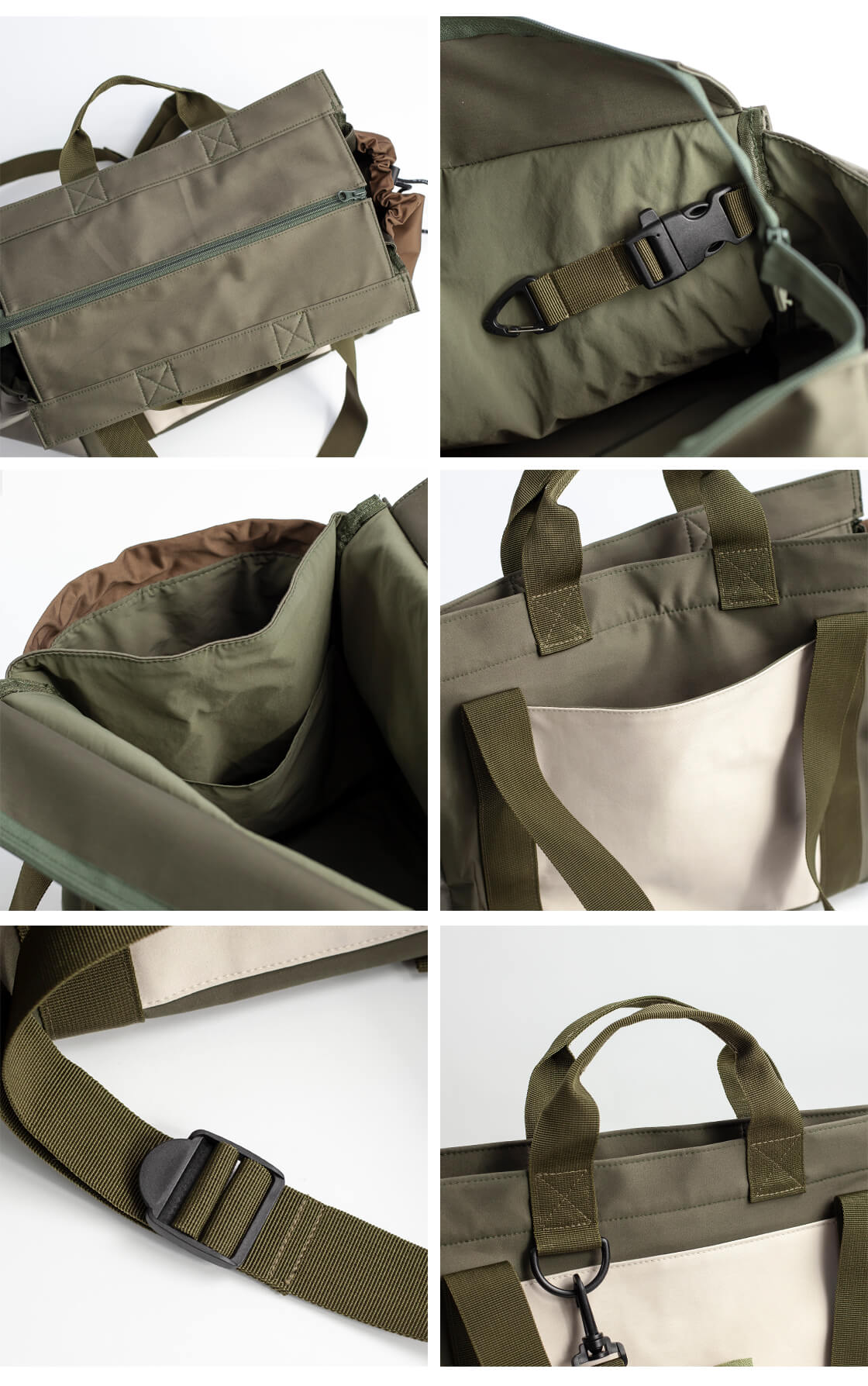 合計6つのポケットに加え、エコバッグやポーチ、着脱可能なキーフックを備えた充実の仕様。
