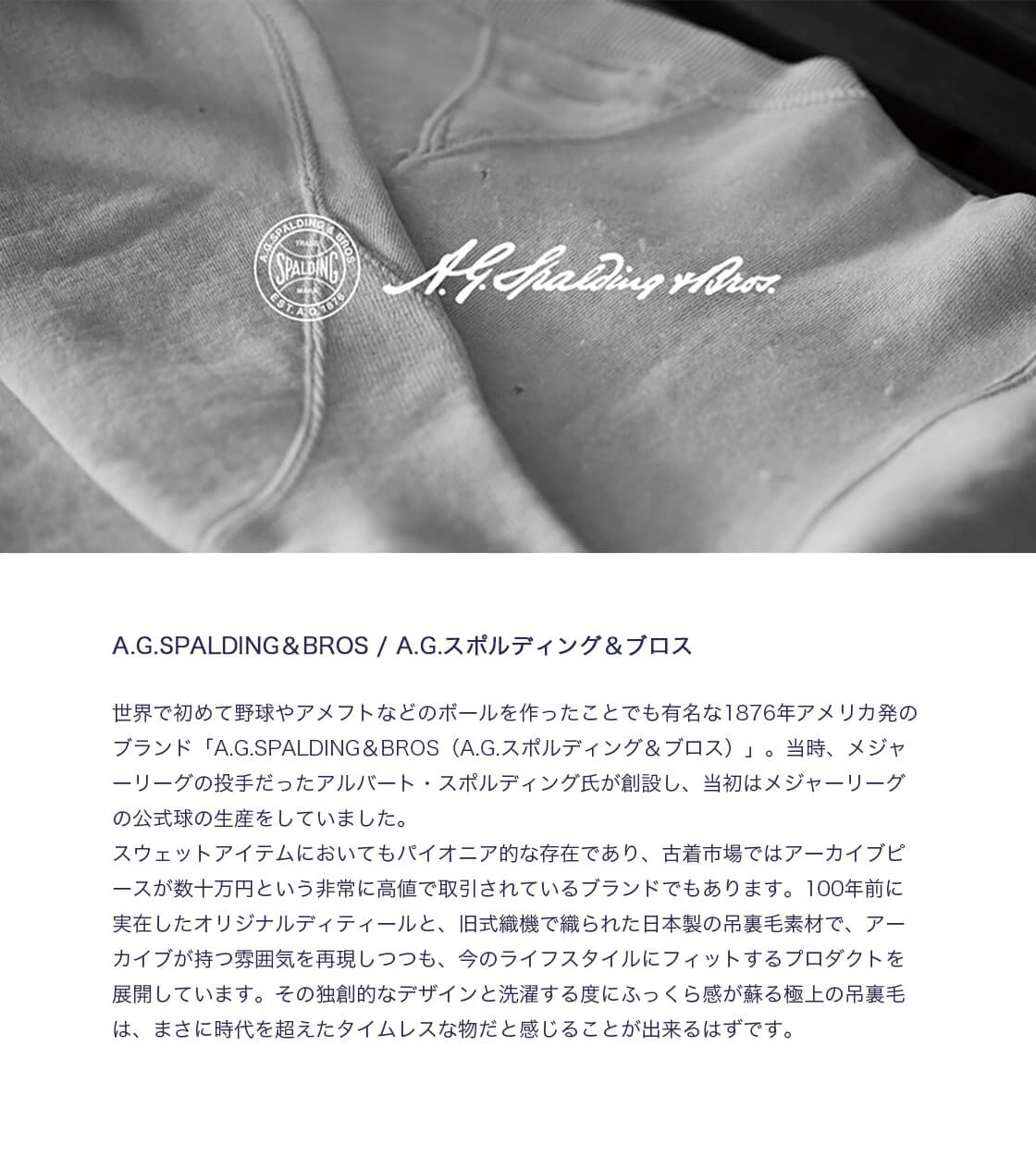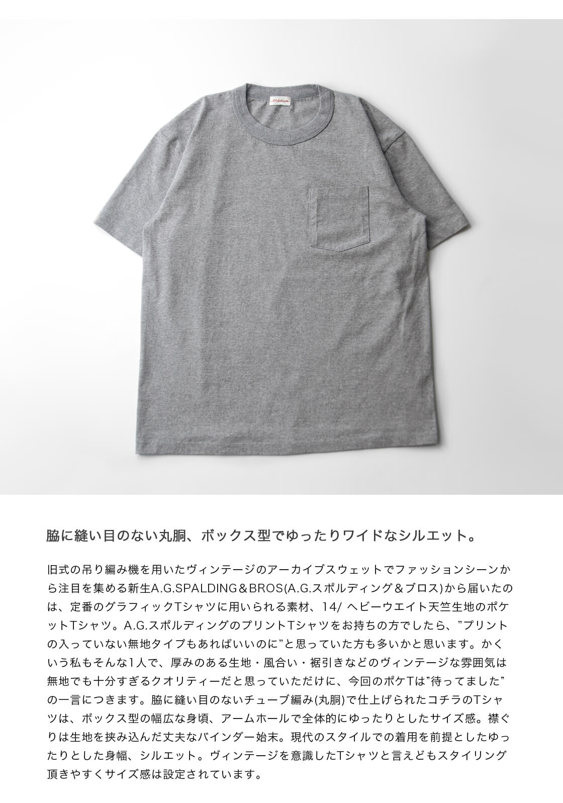 旧式の吊り編み機を用いたヴィンテージのアーカイブスウェットでファッションシーンから注目を集める新生A.G.SPALDING&BROS(A.G.スポルディング&ブロス)から届いたのは、定番のグラフィックTシャツに用いられる素材、14/ ヘビーウエイト天竺生地のポケットTシャツ。