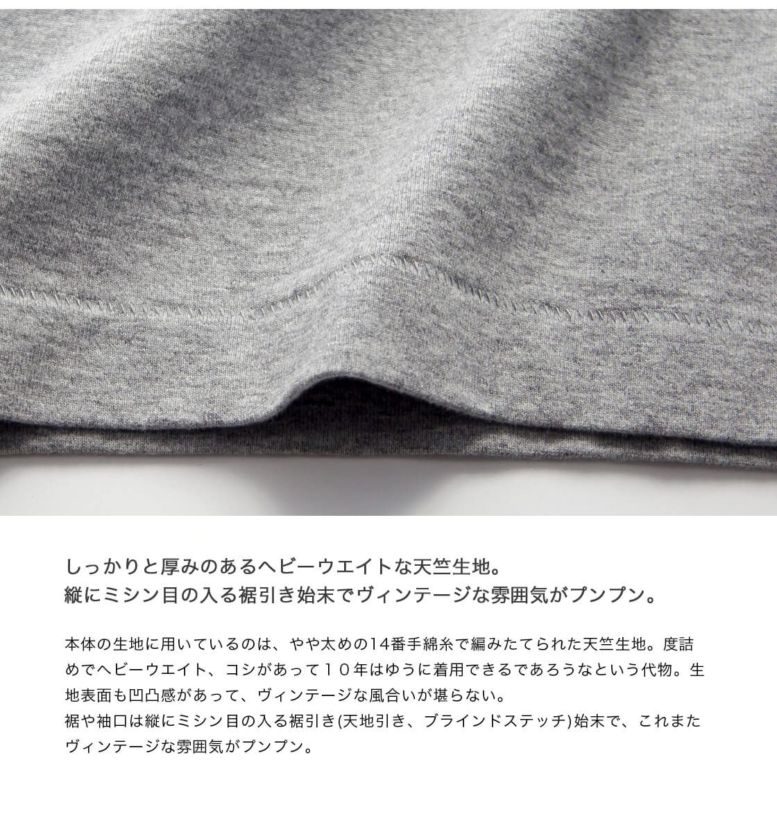 やや太めの14番手綿糸で編みたてられた天竺生地は、度詰めでヘビーウエイト、コシがある。