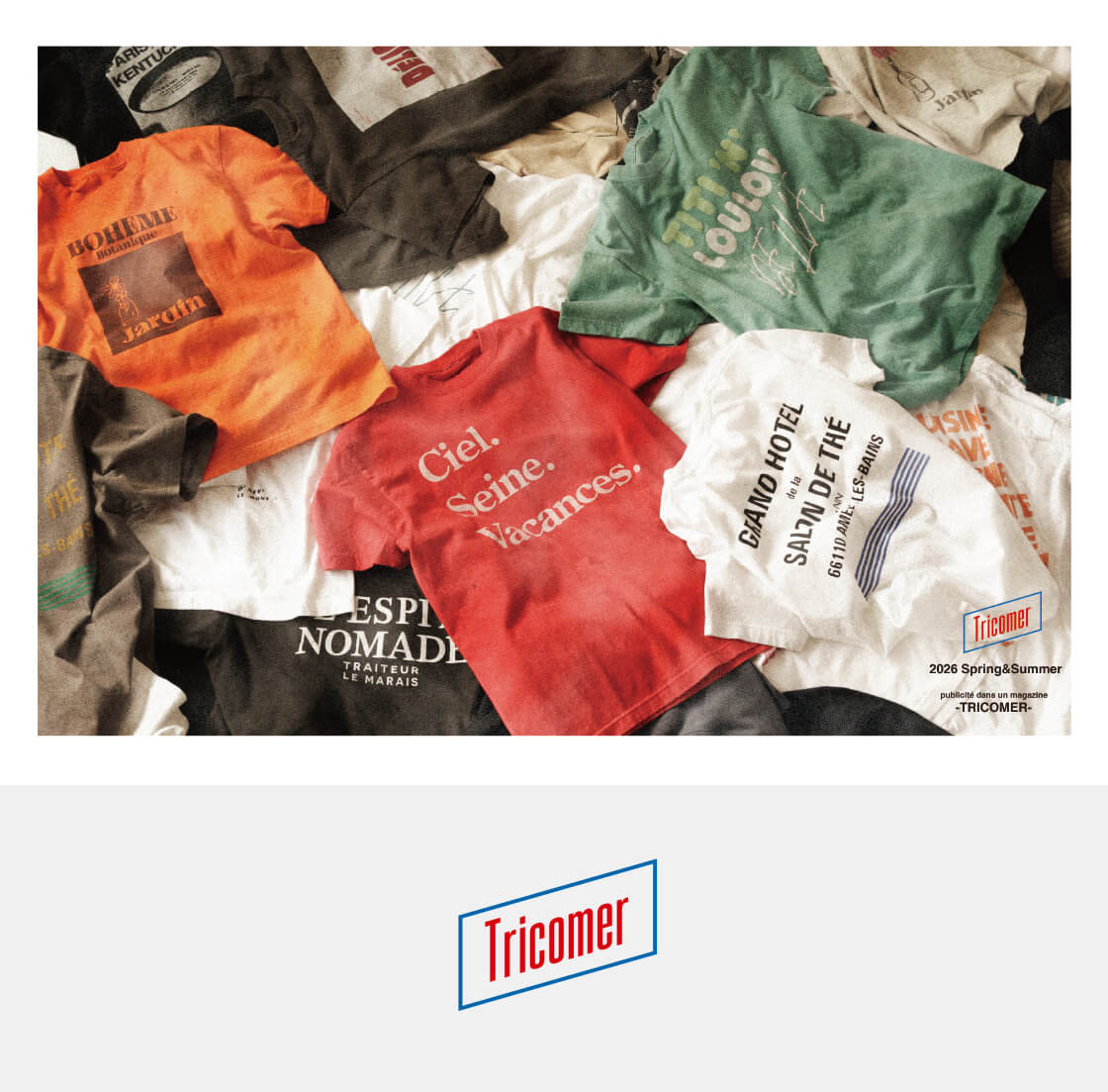 TRICOMERからヴィンテージな風合いとフレンチな空気感を纏うプリントTシャツをご紹介。