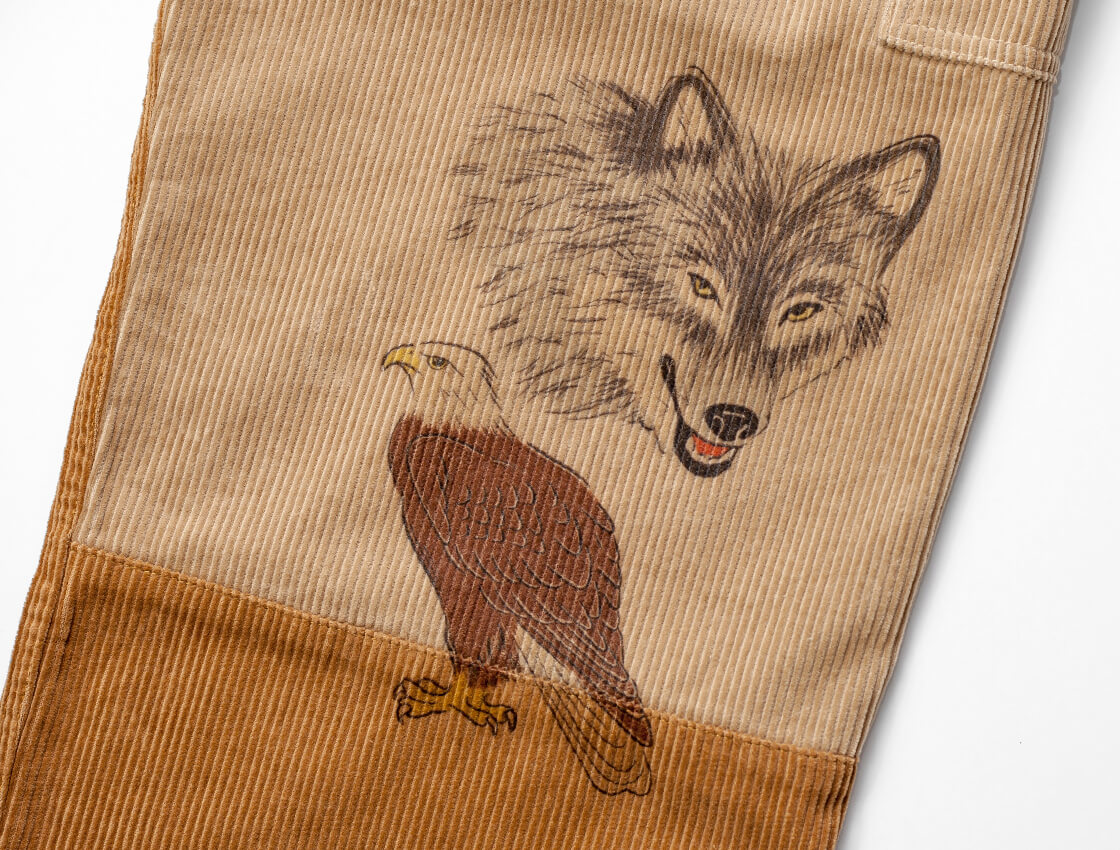 Work of Art Kendaiより、手描きプリントとヒップのワッペンが目を引くコーデュロイハンティングパンをご紹介。 70~80年代のアウトドアパンツをベースに、膝下や後ろ裾の切り替えを施した独特のデザインが特徴。 両サイドにはハンマーループやツールポケットを備え、大きめのバックポケットも実用的です。 シルエットは太めのワイドストレート。 柔らかくくったりとした8ウェールの太畝コーデュロイを使用し、自然な落ち感と快適な履き心地を実現しています。 遠目からでも存在感があり、秋冬らしい重厚な表情を楽しめます。 25AWテーマ「Hunting & Fishing」を反映したプリントには、狩猟犬や鳥、鹿、狼などが描かれ、アメリカンヴィンテージを思わせる雰囲気。 ワッペンとの組み合わせにより独特の世界観を演出します。 プリントやワッペンのインパクトに加え、巻き縫いなど堅牢なディティールも備えた一本です。