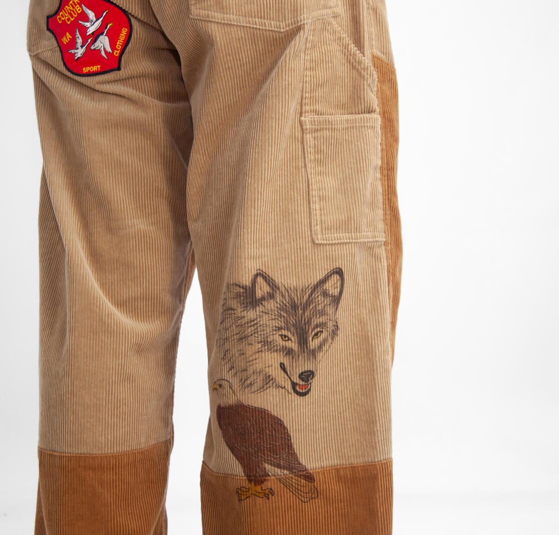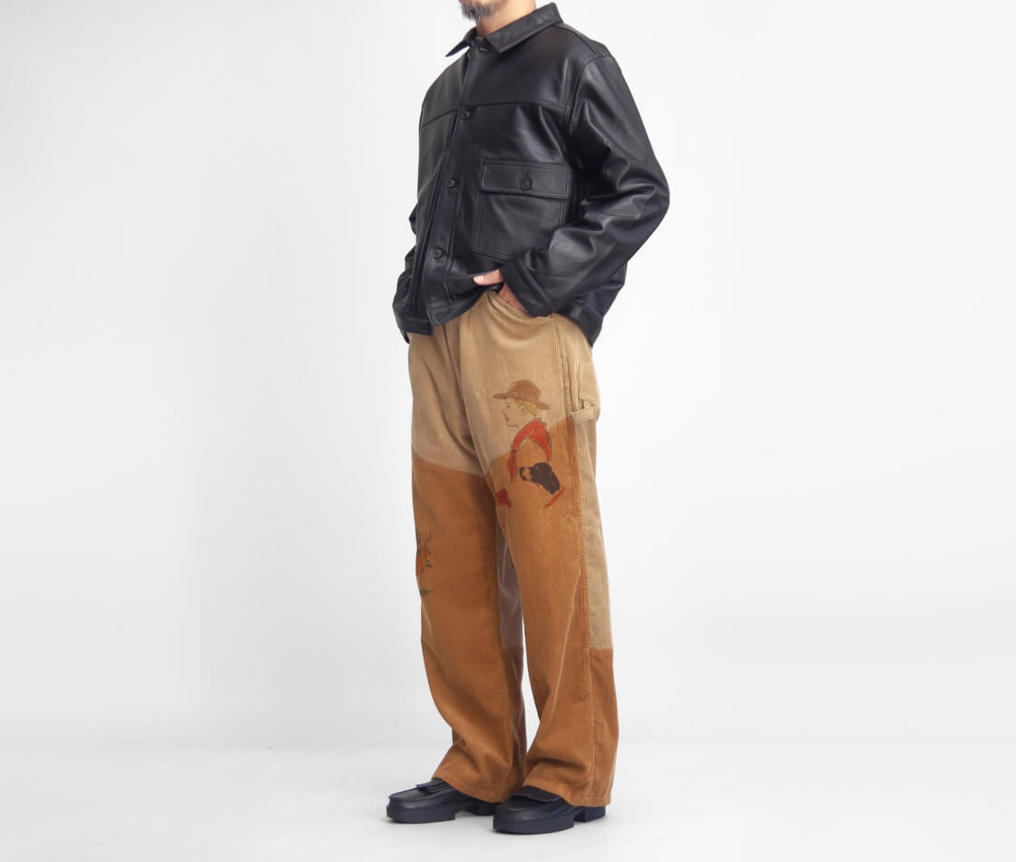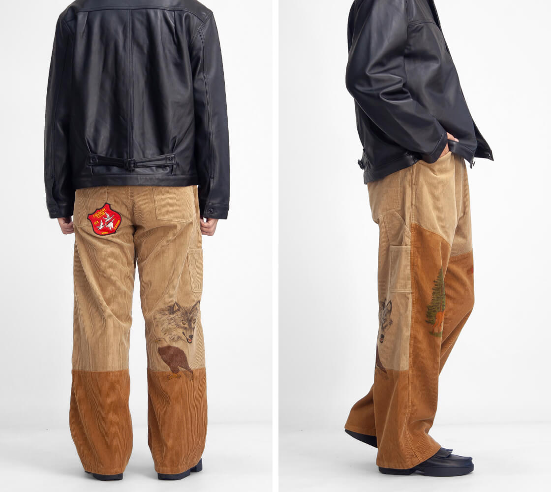 Work of Art Kendaiより、手描きプリントとヒップのワッペンが目を引くコーデュロイハンティングパンをご紹介。