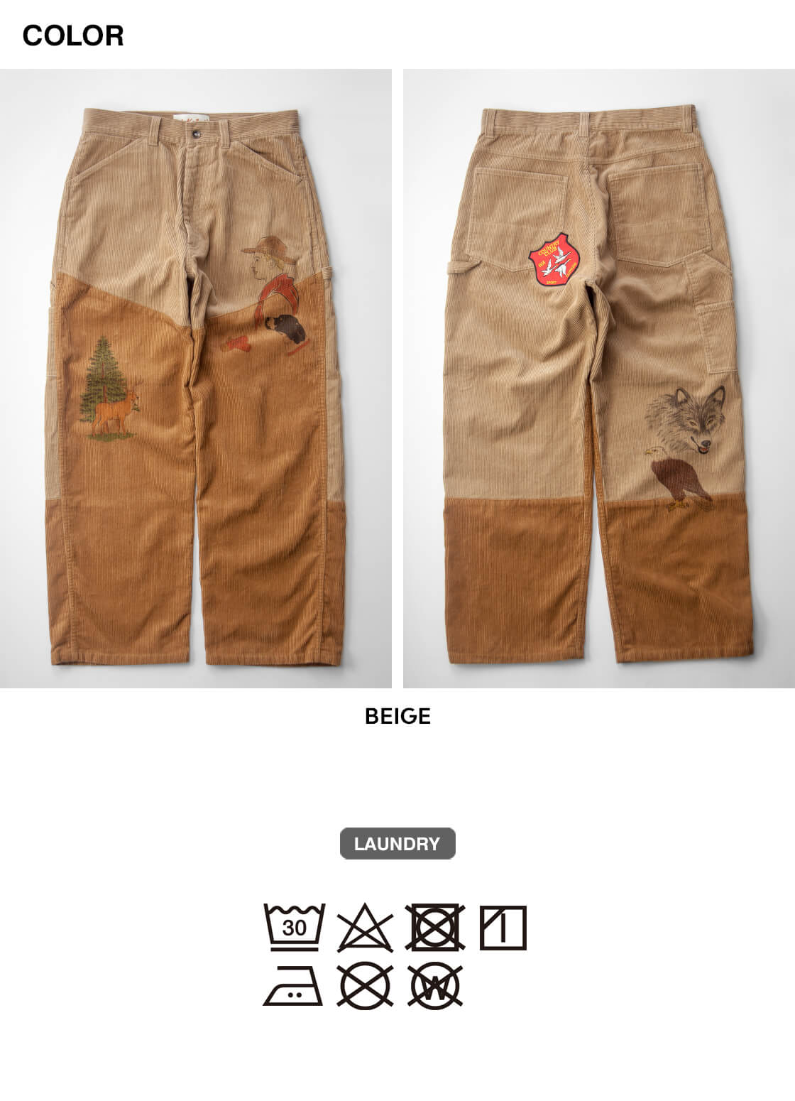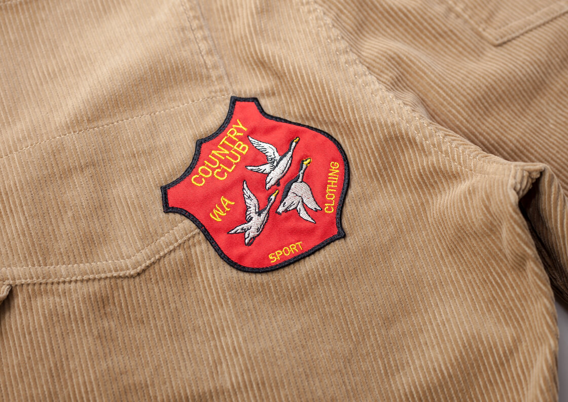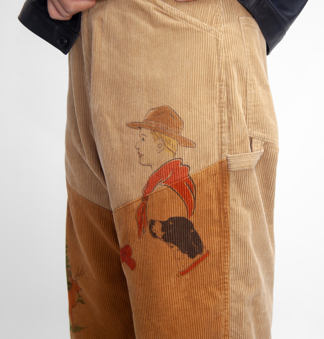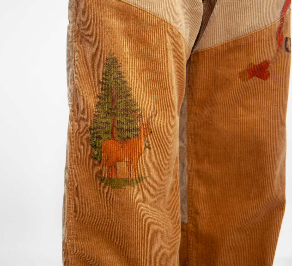 Work of Art Kendaiより、手描きプリントとヒップのワッペンが目を引くコーデュロイハンティングパンをご紹介。