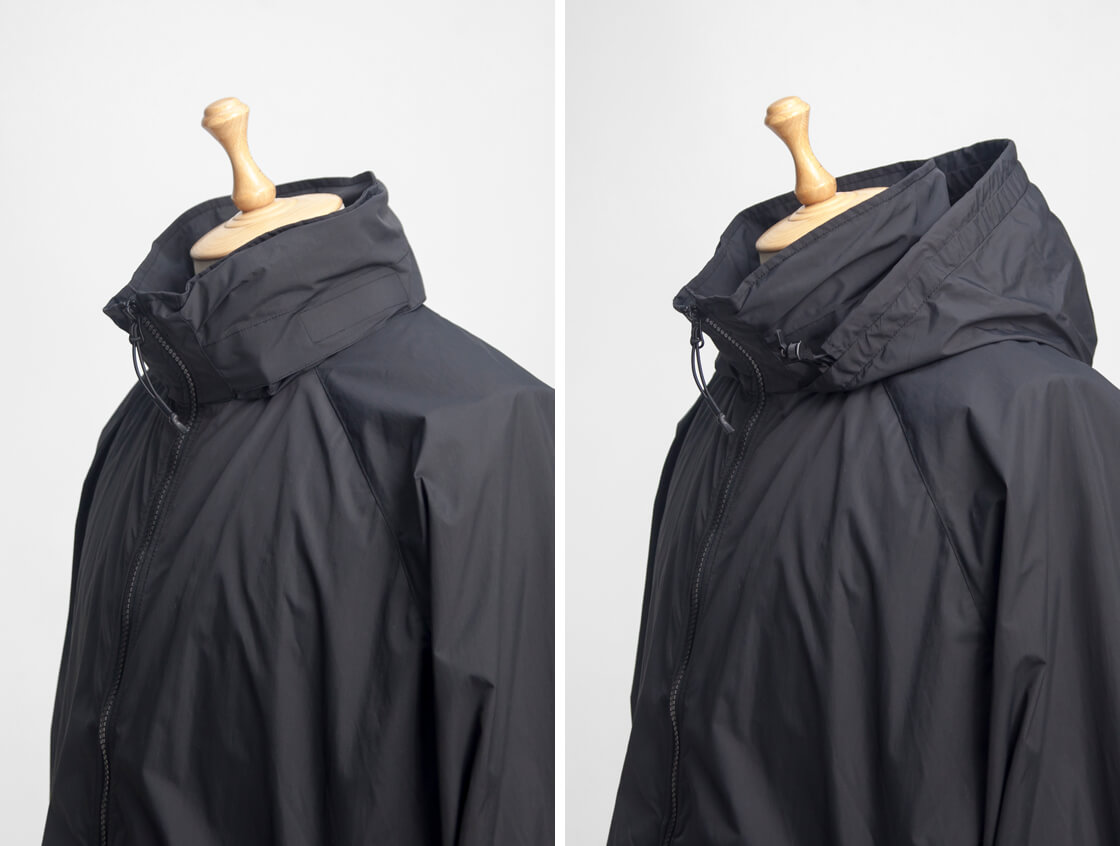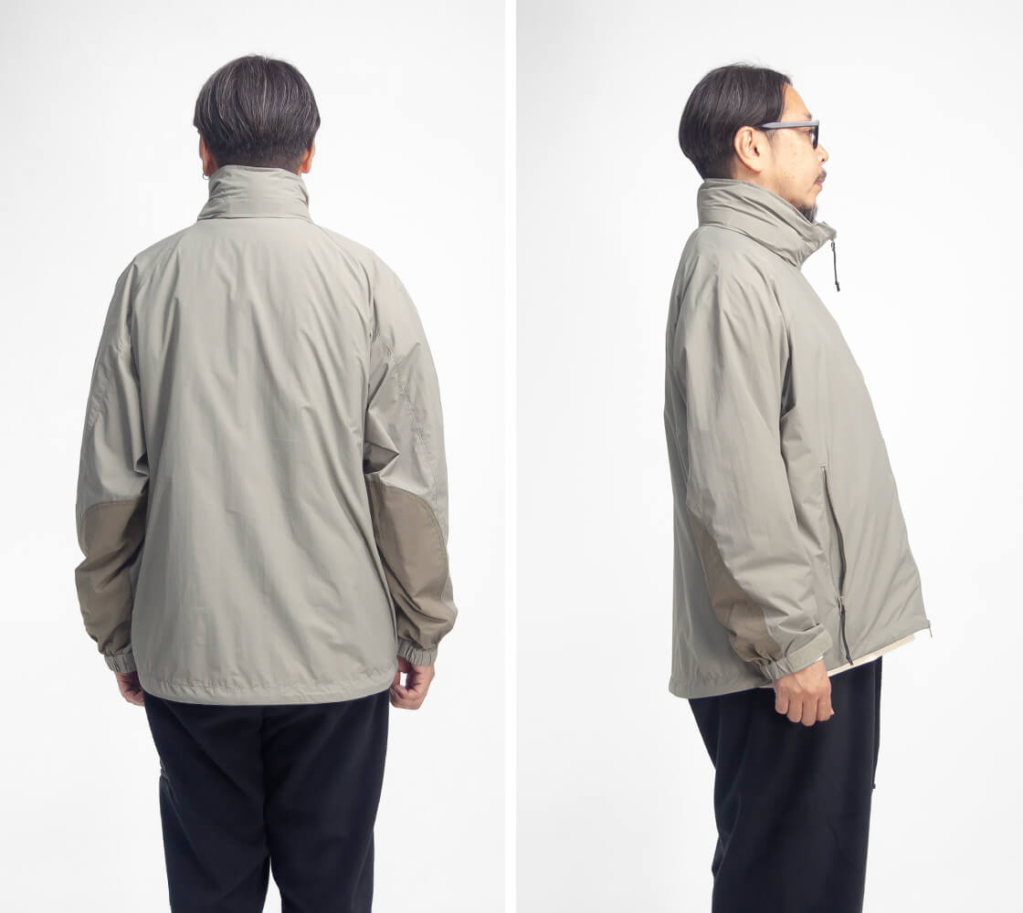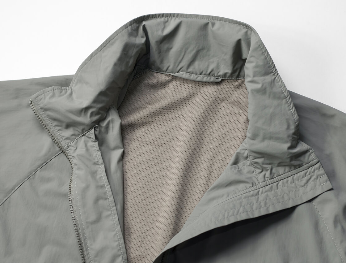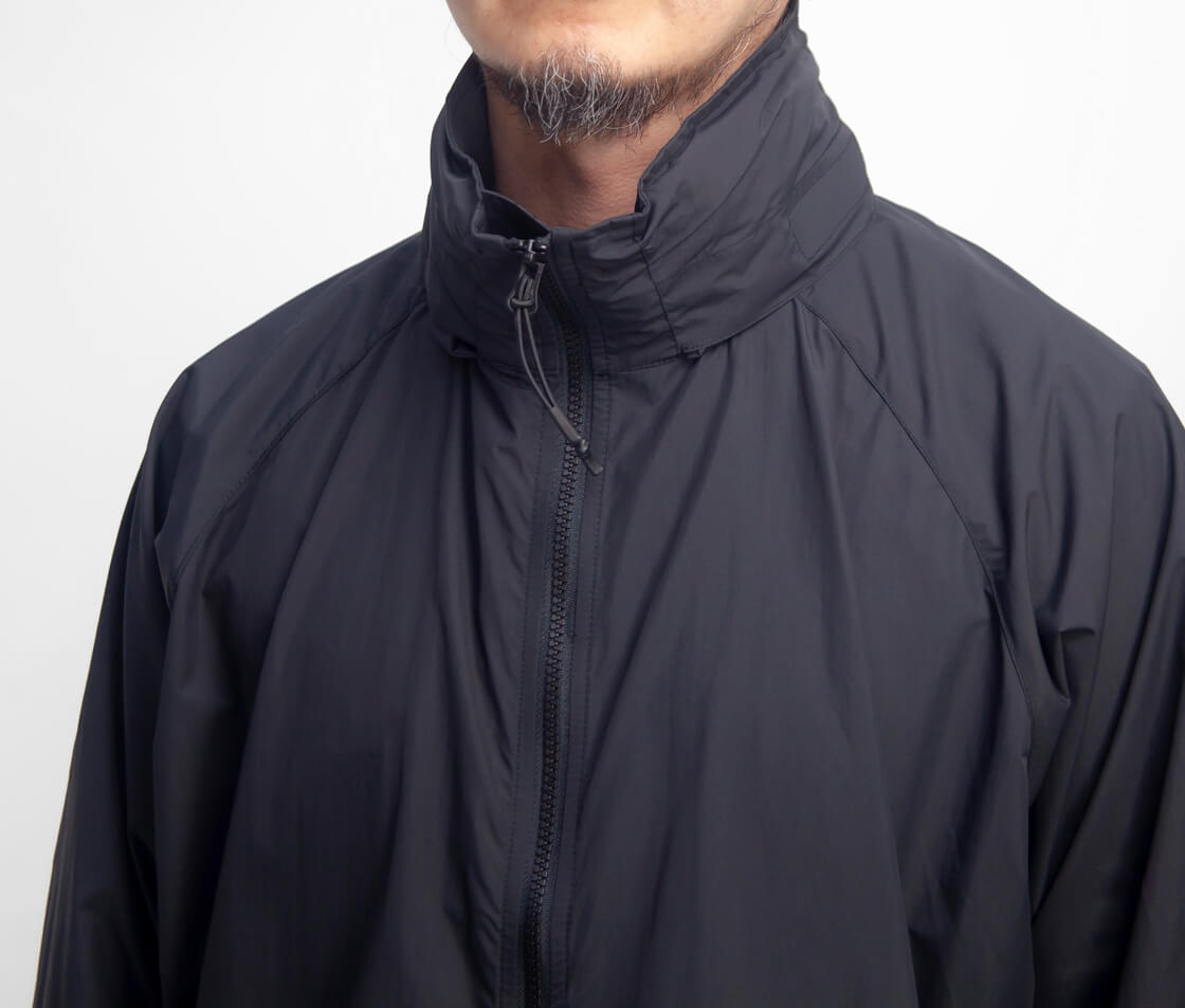 米軍のプリマロフトジャケットから中綿を抜いたような軽快なデザインで、フード収納型のスタンドカラー仕様。