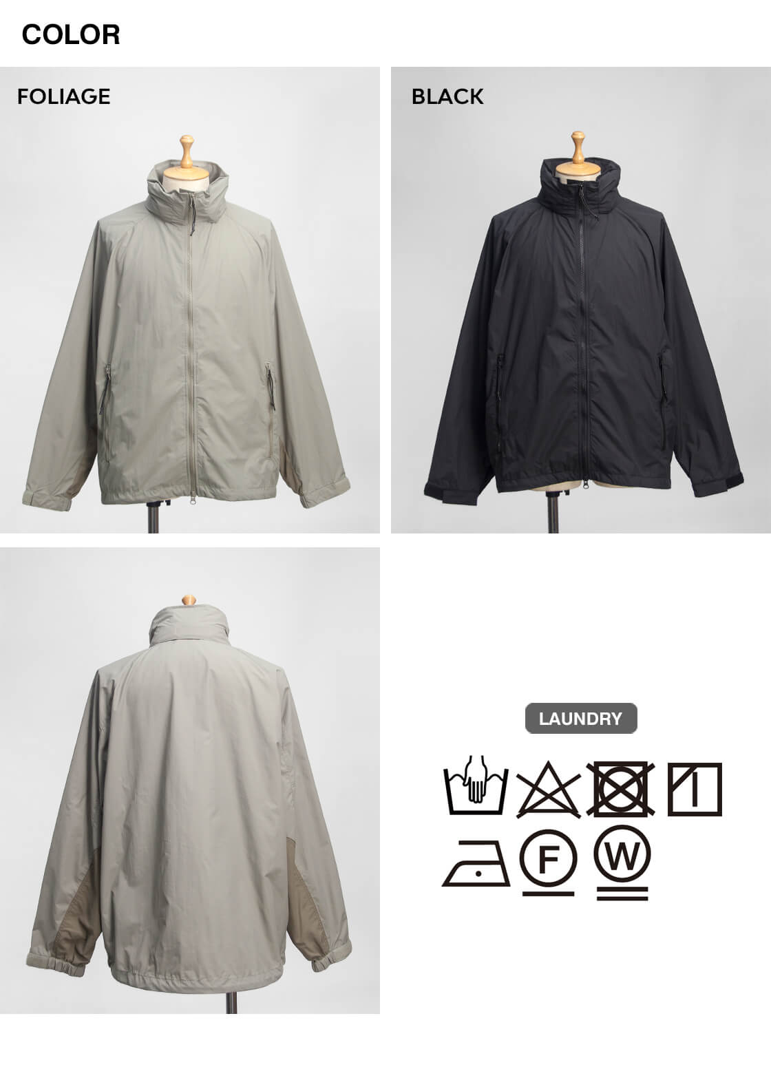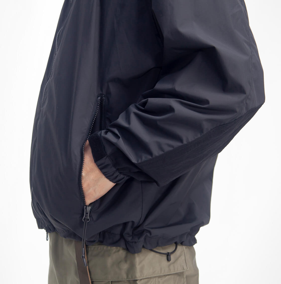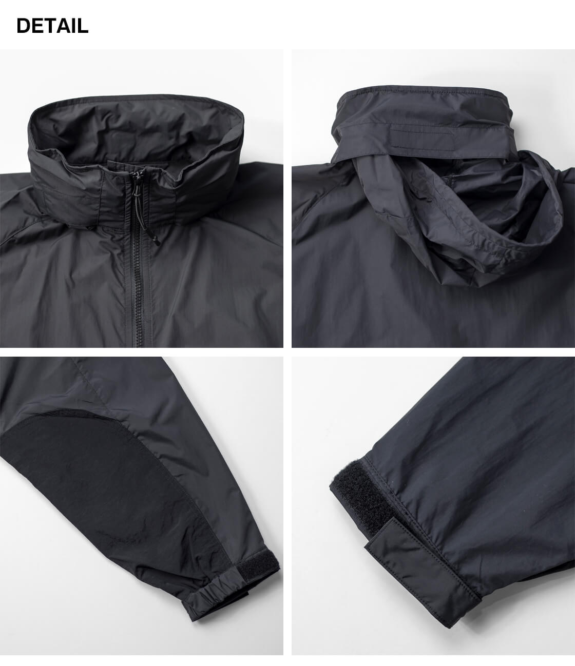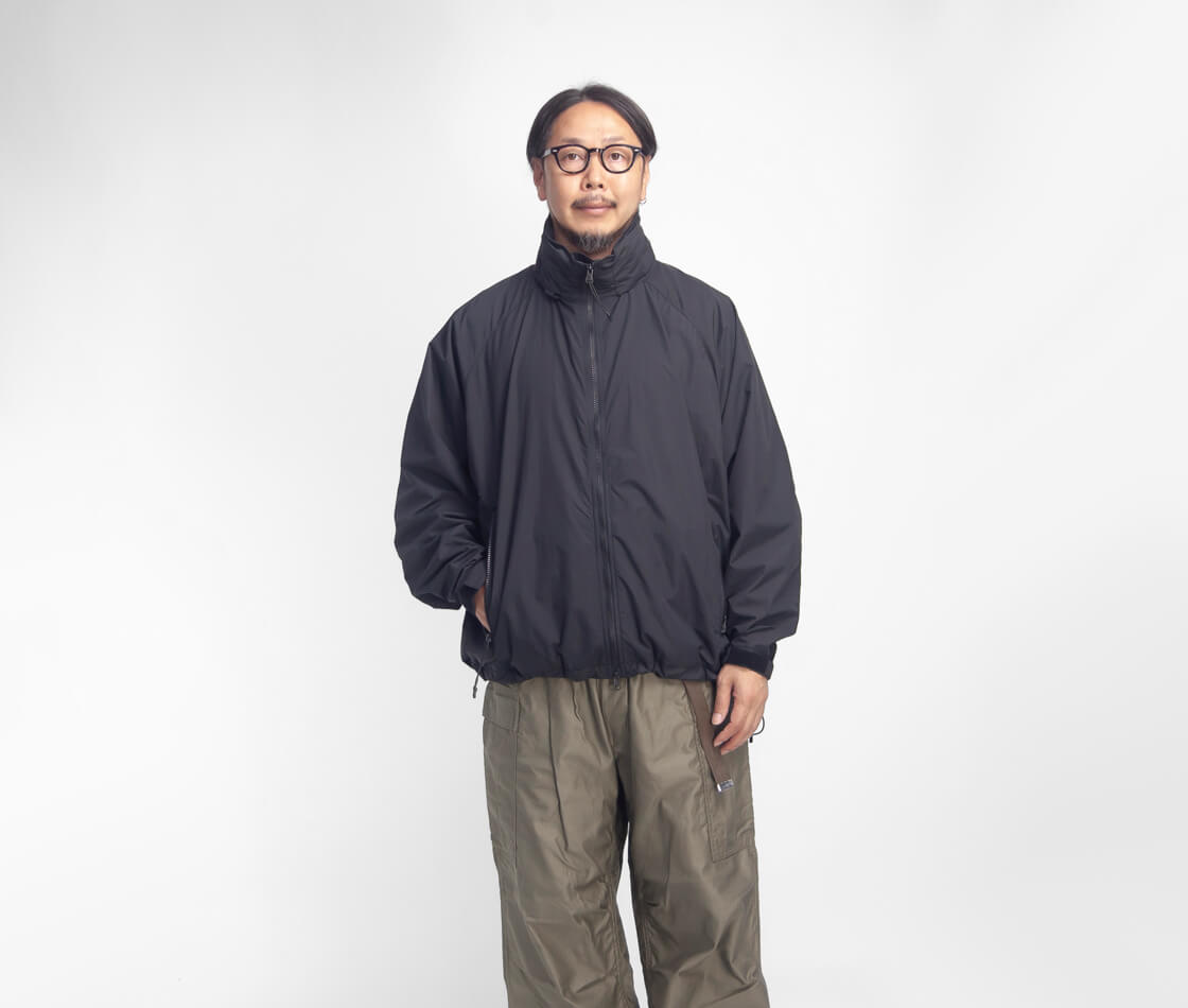 米軍のプリマロフトジャケットから中綿を抜いたような軽快なデザインで、フード収納型のスタンドカラー仕様。