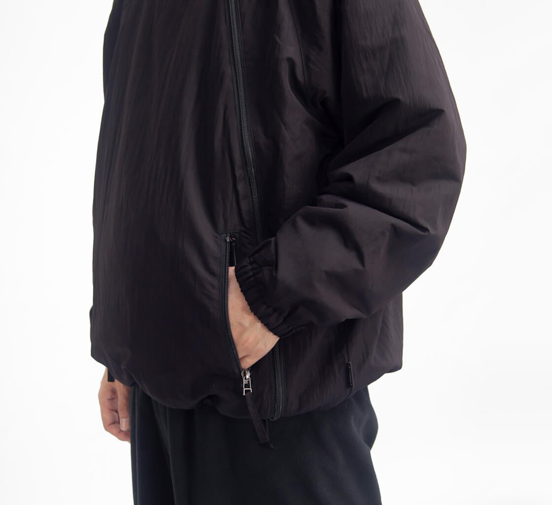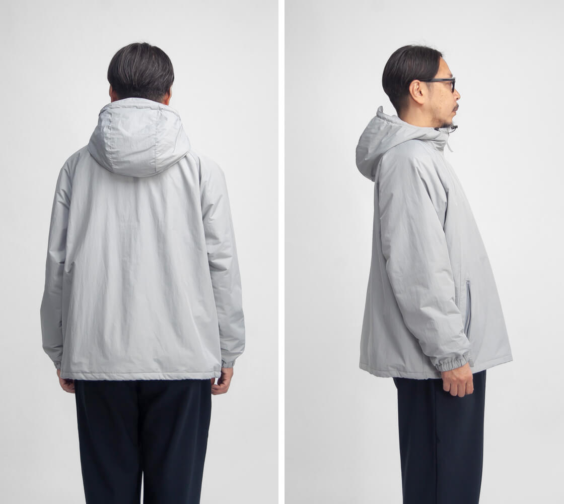 胸元のジップは開閉の仕方で表情が変わり、裾のドローコードを絞れば丸みのあるシルエットに調整可能です。