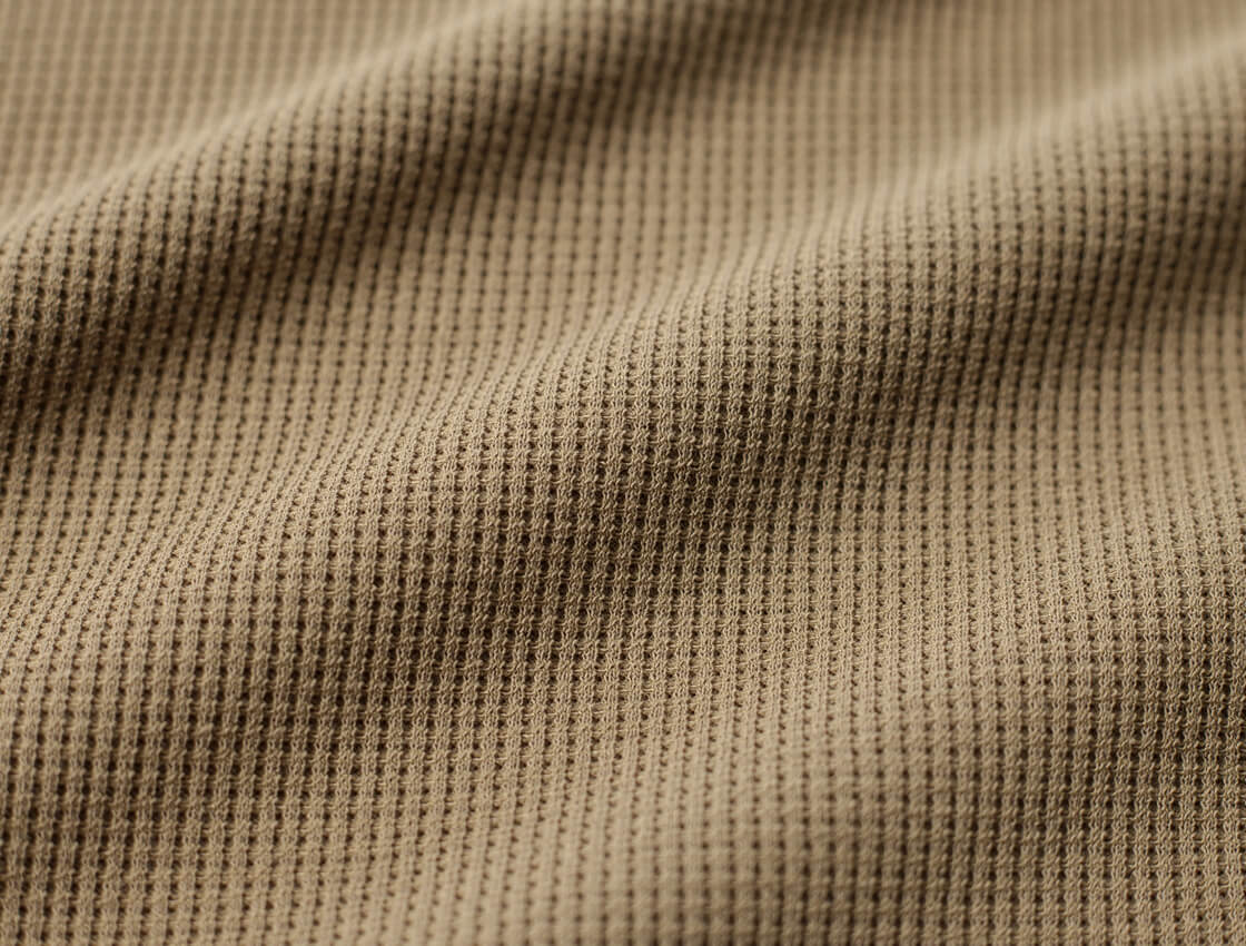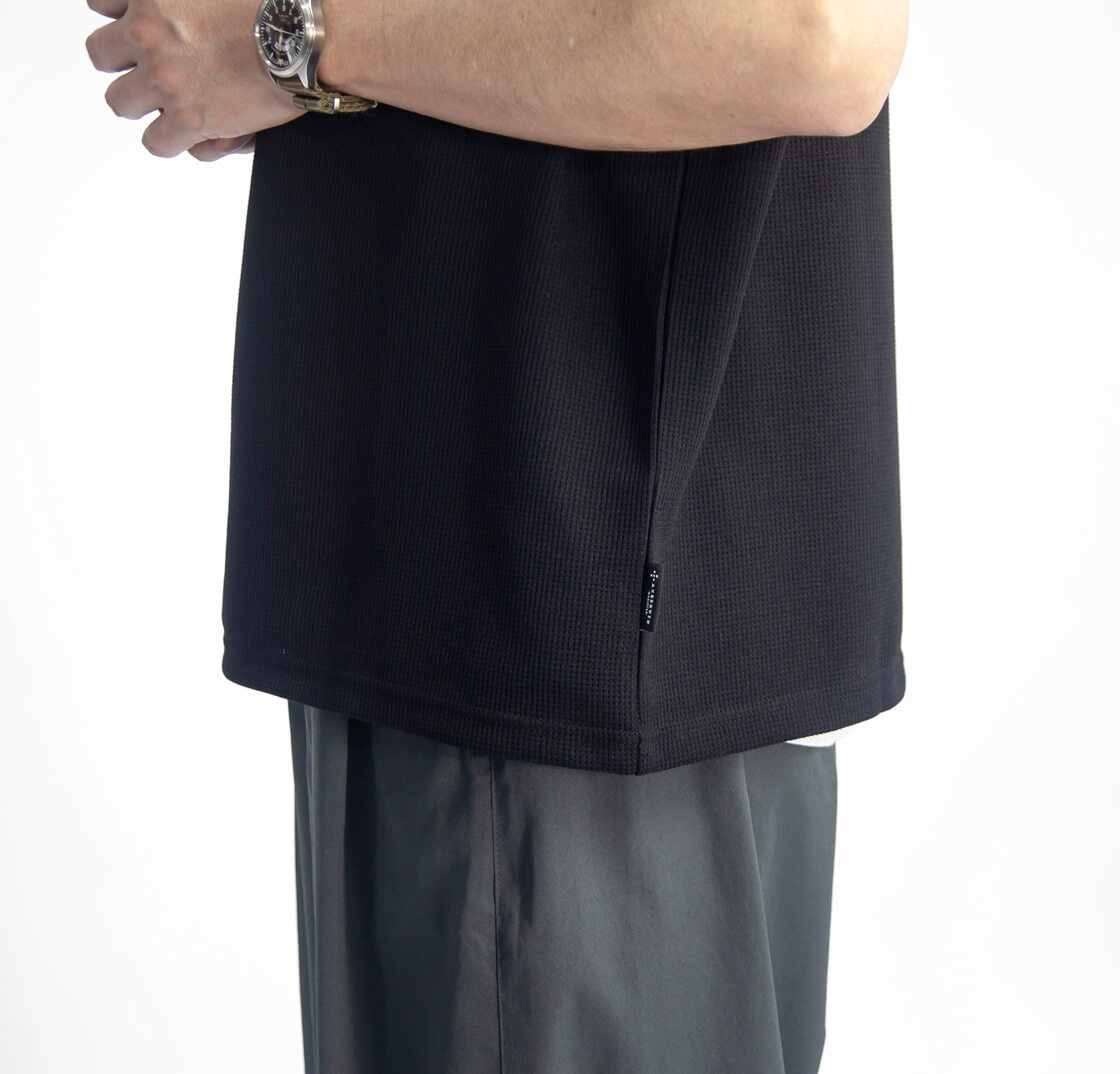 素材は凹凸のあるポリエステルワッフル素材で肌離れが良く、ドライな着心地。
