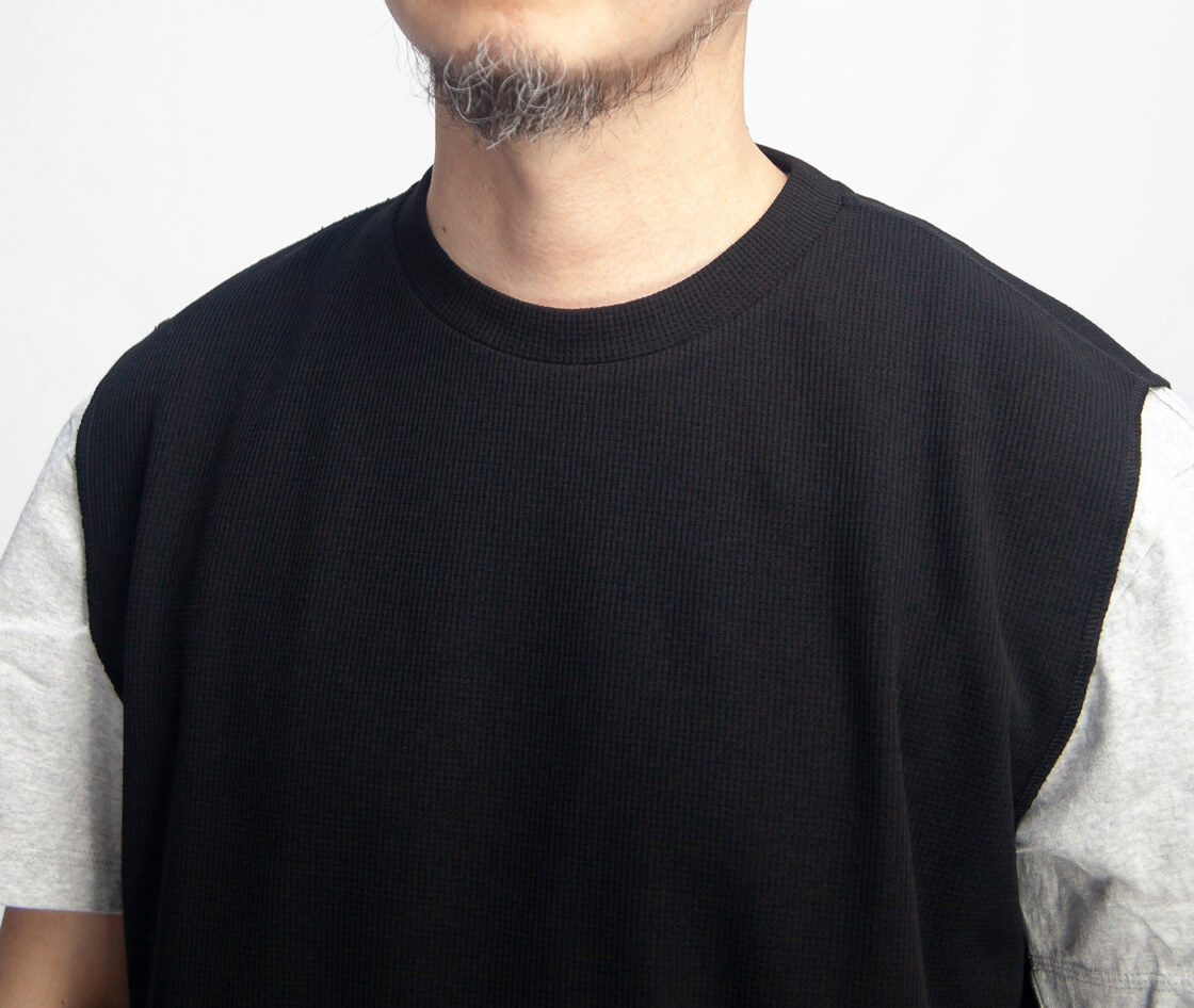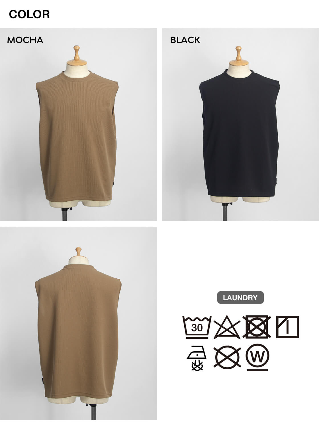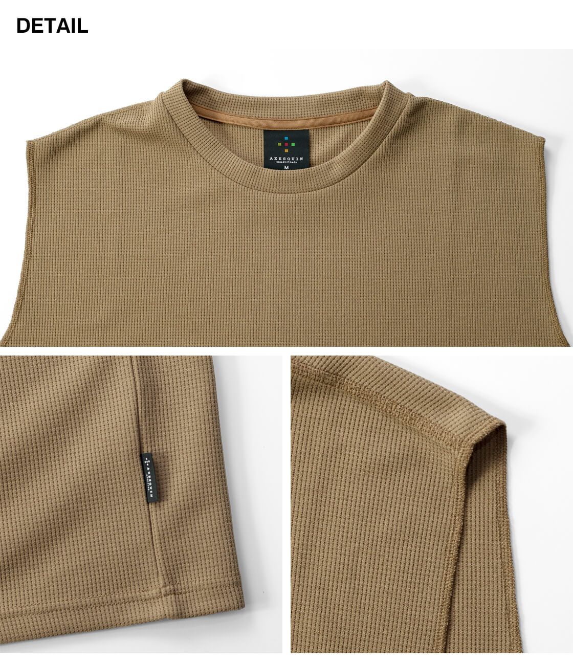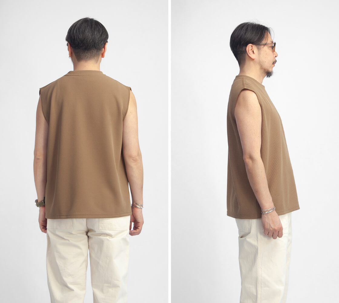 AXESQUINから高い通気性と速乾性を兼ね備えたノースリーブTEEをご紹介。 深めのアームホールにより可動域を確保し、肩をしっかり覆う設計で一枚でも着やすい仕上がり。 シルエットはゆとりのある身幅と広めのアームホールで、風抜けの良い軽快さ。 肩幅を確保することでインナー感を抑えた、大人が着やすく仕上がっています。 素材は凹凸のあるポリエステルワッフル素材で肌離れが良く、ドライな着心地。 速乾性に加えUVカット機能も備え、再生ポリエステルを使用したサステナブルな点も魅力です。 暑い季節に一枚でも重ねても活躍する、快適さと実用性を兼ねた一着です。