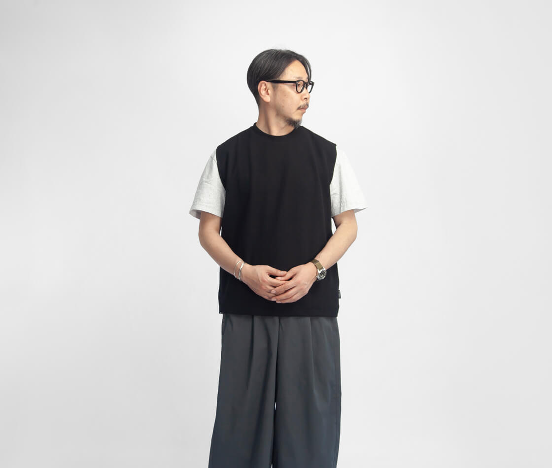 深めのアームホールにより可動域を確保し、肩をしっかり覆う設計で一枚でも着やすい仕上がり。