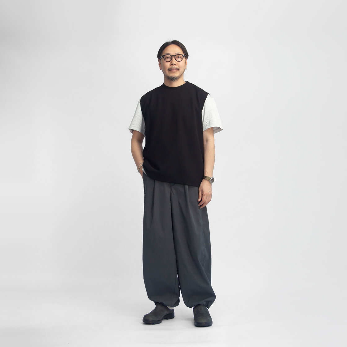 シルエットはゆとりのある身幅と広めのアームホールで、風抜けの良い軽快さ。