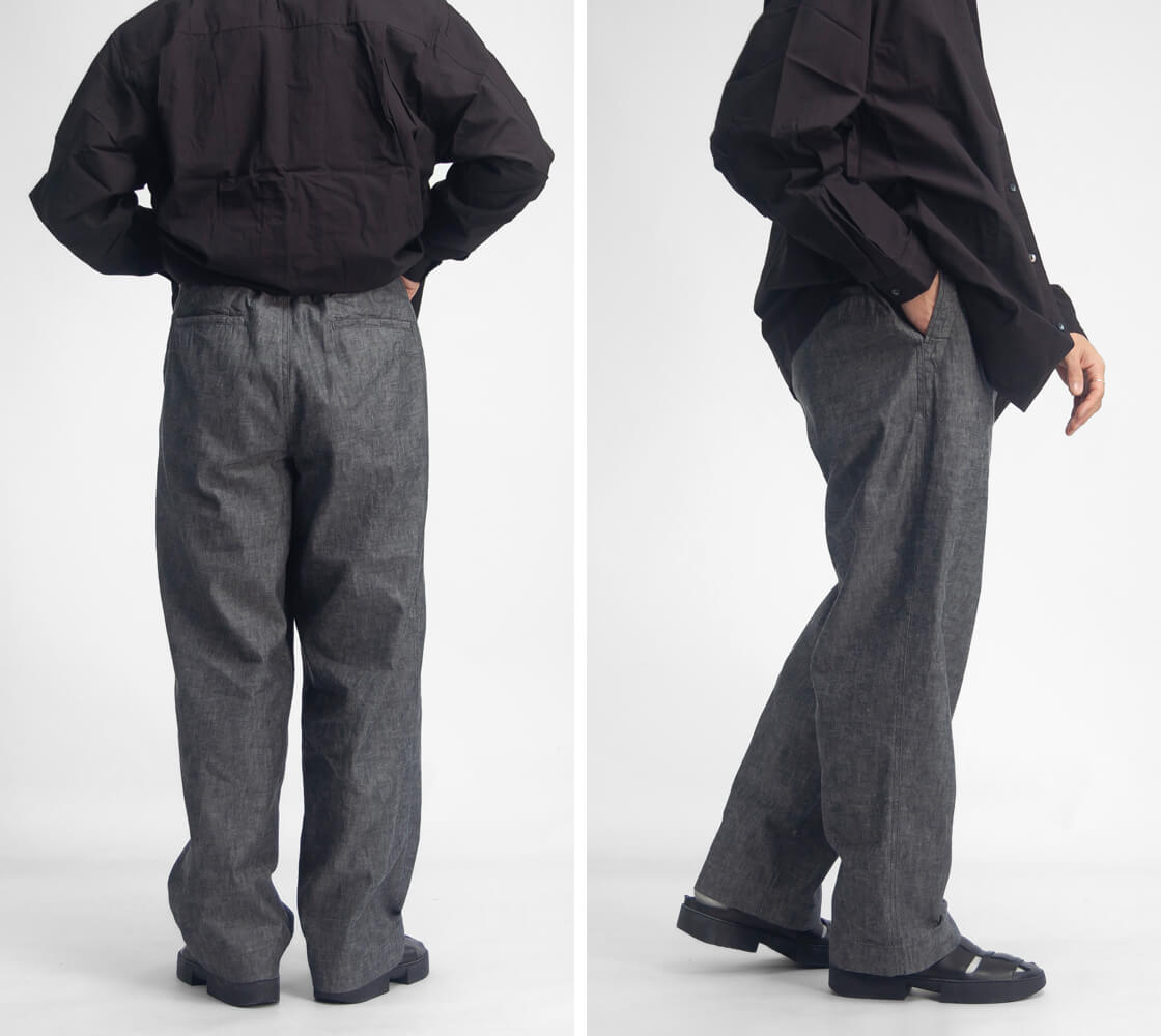 44 / ウエスト66-84 / レングス75 / 股上31 / ワタリ36 / 裾幅23 モデル着用 168cm/65kgで44サイズ 素材 綿100% カラー展開 ブラック、ブルー 生産国 日本 モデル着用コメント 44サイズを着用しました。ウエストゴムがしっかりしているので、苦しくないくらいのぴったりとしたフィット感で履くことができました。レングスはしっかり股上分を上げて履いてワンクッションくらいなので、裾上げかロールアップをしてジャストで履くときれいめにも合わせられるかなと思います。ウエストは紐もありますし、太さもいい塩梅なので44サイズで問題ないです。 スタッフ着用コメント 46サイズを履きました。ウエストはまだまだゆとりがあり、ベルトもしないで済みますが、レングスがツークッション入るくらいの長めに感じました。個人的には46サイズでぴったりに感じますが、できれば裾上げをしたいなと思いました。色で生地が違うので、ブルーの柔らかい生地なら丈はゆったり着たくて、ブラックのしっかりした生地ならジャストめの丈にして履きたいですね。 |