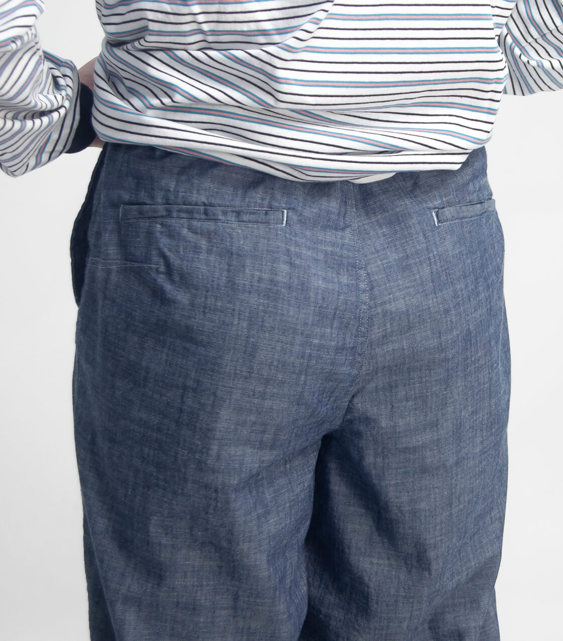 ![]() BRENA - COQ PANTS / VINTAGE FRENCH CHAMBREY ![]() フランスの50年代のコックパンツをオマージュしたBRENAの顔ともいえるパンツ。今作は60年代に織られたフレンチシャンブレーを用いた希少性の高い一着に。 ![]() BRENA(ブレナ) テーラードを基軸としたカジュアル、ユニセックスで提案する日本のブランド「BRENA (ブレナ)」。ワーク、ミリタリー、ヴィンテージを独自の解釈により再構築し、オーセンティックな製品を提案しています。さらに現在では希少となった、裁断から縫製、仕上げまでの全行程を1人の職人が仕上げる「丸縫い」のジャケットを製作しているなど、レディメイドでありながら、ビスポークにも近いモノ作りをしているという点も大きな特徴。普遍的なアイテムだからこそ真摯に丁寧に、熟練の職人と共に良質なアイテムを提案しています。 ![]() ヒップ部に独特の膨らみを持たせ、クライミングパンツの様に動きやすいディティールで仕上げられた一本。 BRENA設立時から展開されている、フランスの50年代のコックパンツをオマージュしたBRENAの顔ともいえるイージーパンツ「COQ PANTS」。今作は60年代に旧式織機で織られたデッドストックのフレンチシャンブレーを用いた、限定生地の希少な一本。簡易な作りが多いコックパンツとは一線を画すのが、BRENAのコックパンツ。フロントはファスナー開閉で、ウエストにゴム・ドローコードが内蔵されたイージー仕様。特徴的なのは、動きやすいようヒップ部分に独特の膨らみを持たせたダーツ(バルーンプリーツ)、そして股部分に設けられたガゼット。クライミングパンツやミリタリーパンツ、ヴィンテージのフレンチワークパンツなどに用いられる180度近い開脚を可能にするディティールで、自転車やバイクに乗る際にもまたぎやすいのです。さらに脇の縫製に関しては、一度インターロックで縫い合わせてから、2本針でさらに縫い上げていくという2回の工程を踏んでいたりで、決して簡易な作りではないというのがBRENAらしさ。イージーパンツ仕様なのに、ベルトループも付いているので、タックインしたい時なんかにはベルトを活かせるというのもポイント。シルエットは、ややワイドな腿周りから、裾に向かって緩やかに細くなるストレートに近いテーパードライン。 ![]() 180度近い開脚を可能にする股部分のガゼット。 ![]() ロマンをはせずにはいられない、旧式織機で製作された60年代のフレンチシャンブレー生地。 本体に用いているのは、60年代に旧式織機で織られた希少なフレンチシャンブレー生地。テーラードや高級ユニフォームなどを製作していたフランスのアトリエに眠っていた古き良き時代のデッドストック生地らしく、数も限られているものになります。現行の織物工場で使われているのは、高速化・効率化されたコンピュータ制御の革新織機。風圧やレピアでよこ糸を飛ばし、高速で布を織っていくので、糸は細く均一で、圧力に耐えられるような撚り(より)の強いものが多く生産されます。しかしこちらのシャンブレー生地は、旧式織機ならではの手織りに近いスローで昔ながらのゆったりとしたテンションの糸で織られているためシボ、凹凸感があり、着れば着るほど味がでる経年変化を楽しんで頂けます。BLUEカラーのシャンブレーは6オンス、BLACKカラーは7.5オンスで、BLACKカラーの方がやや厚みとハリ感があります。ただこの独特のハリのある手触りは着ていくごとに柔らかくなり落ち感が出てきます。フランスが起源と言われるシャンブレーということに加え、60年以上も前のヴィンテージ生地という事で、ロマンをはせずにはいられない、そんな素材です。薄手で、春夏に心地よい生地厚になります。 ![]() ![]() 身長168cm、体重65kgの男性が44サイズ着用。