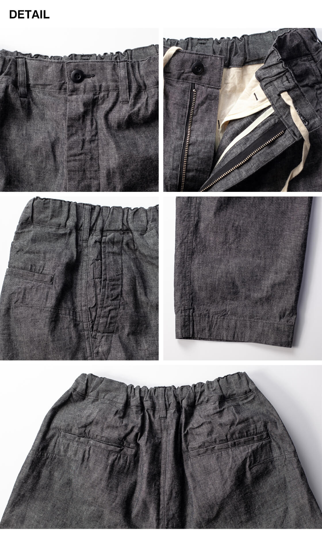 ファスナーに、ウエストゴムとドローコードを内蔵したイージー仕様。