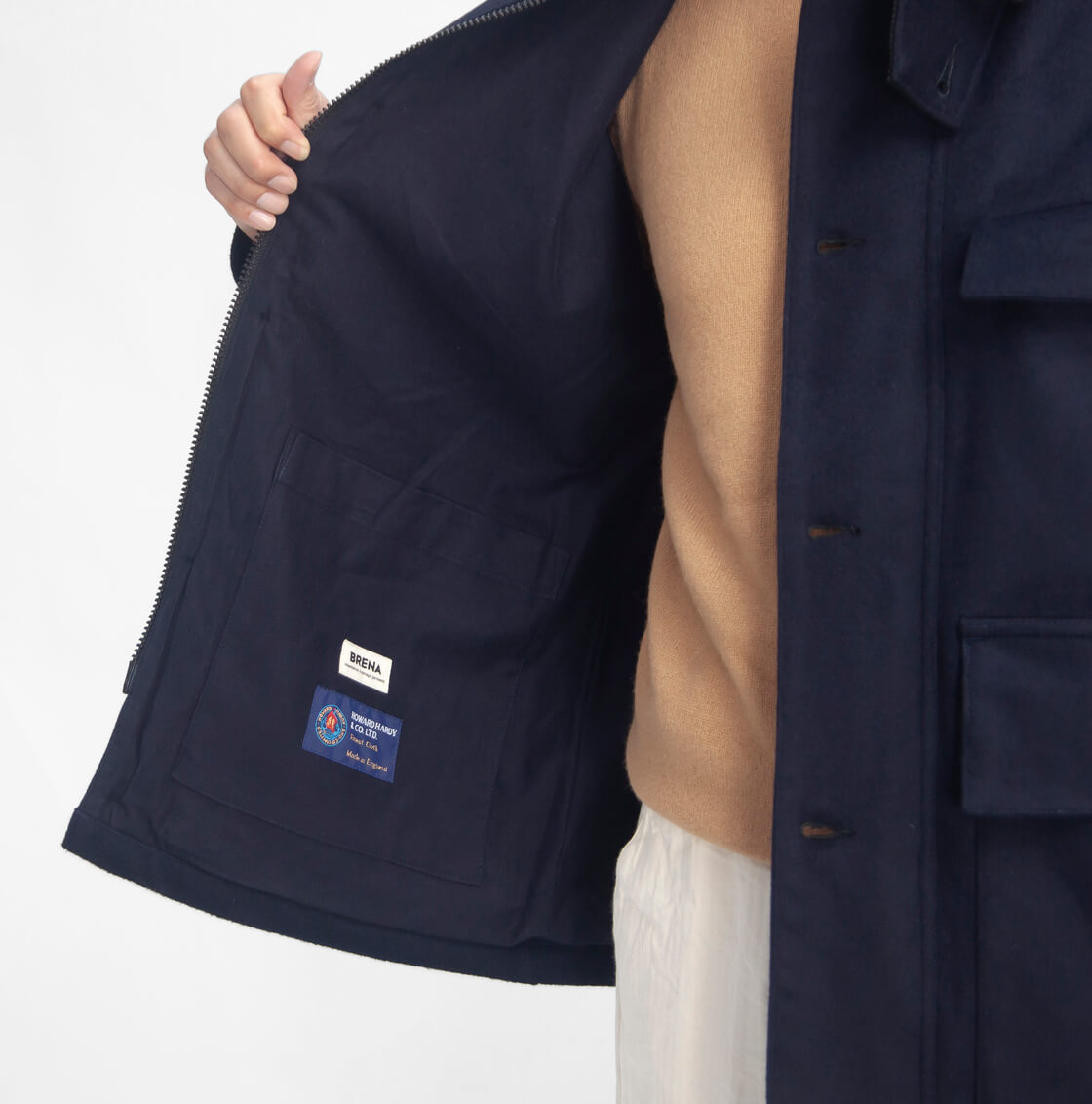 BRENAからハワード・ハーディのフラノ生地を使ったハンティングジャケットをご紹介。 60年代フランス製をオマージュして、大ぶりな襟やフラップポケットを採用しています。 チンストラップや襟裏・袖裏のコーデュロイ、脇から手を入れられるハンドウォームなど機能面も充実。 程よくゆとりのあるボックス型で、羽織るとテーラードを感じる自然に馴染む仕上がり。 素材はハワード・ハーディ社のデッドストックカシミヤ混フラノで、毛足の長い艶と滑らかさが魅力。 まとめとして無骨さと上質さを併せ持つ大人のためのジャケットです。