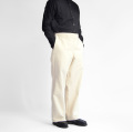 3サイズを着用しました。ウエストはボタンで1段階絞ることができます。全体的にゆったりとしたワイドシルエットでリラックスした着用感です。股上が深めなので、ウエストを固定する位置にも寄りますが、僕の場合レングスはハイウエスト気味で穿いてワンクッションするぐらいの長さで程よく抜け感があります。レングス、ウエストの大きさ的にも個人的には3サイズでばっちりかなと思います。 |