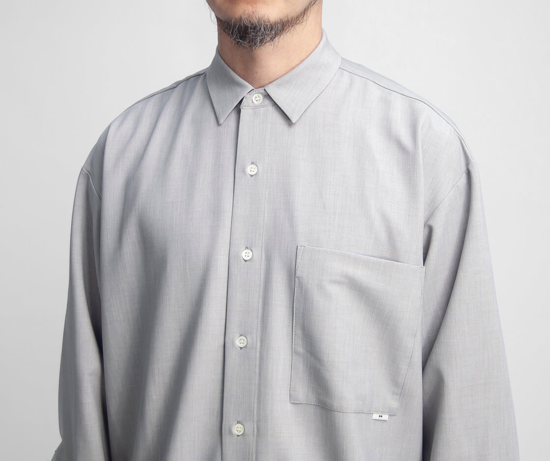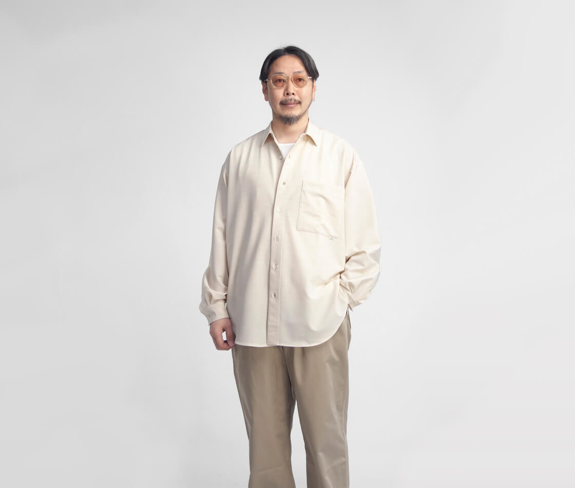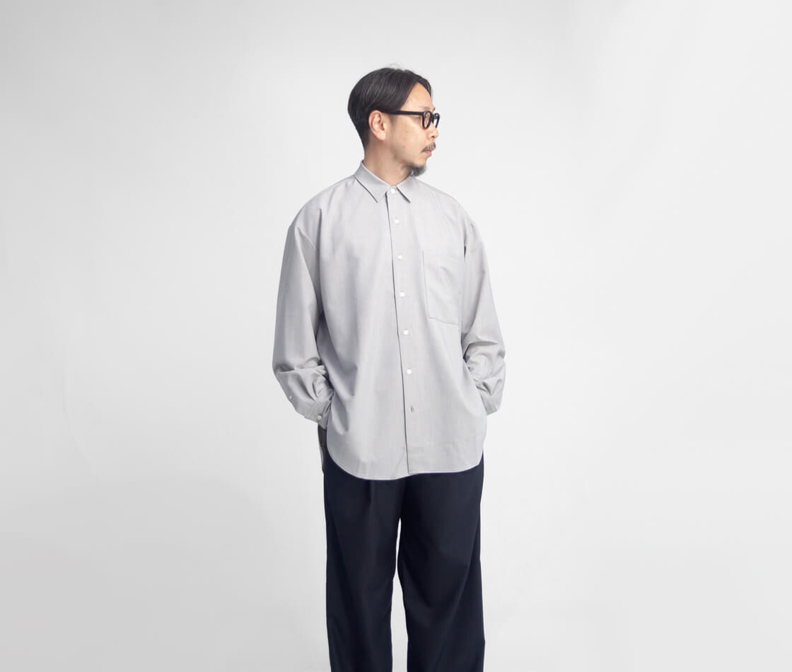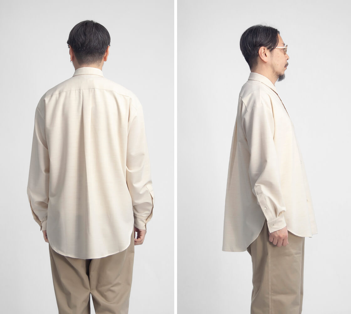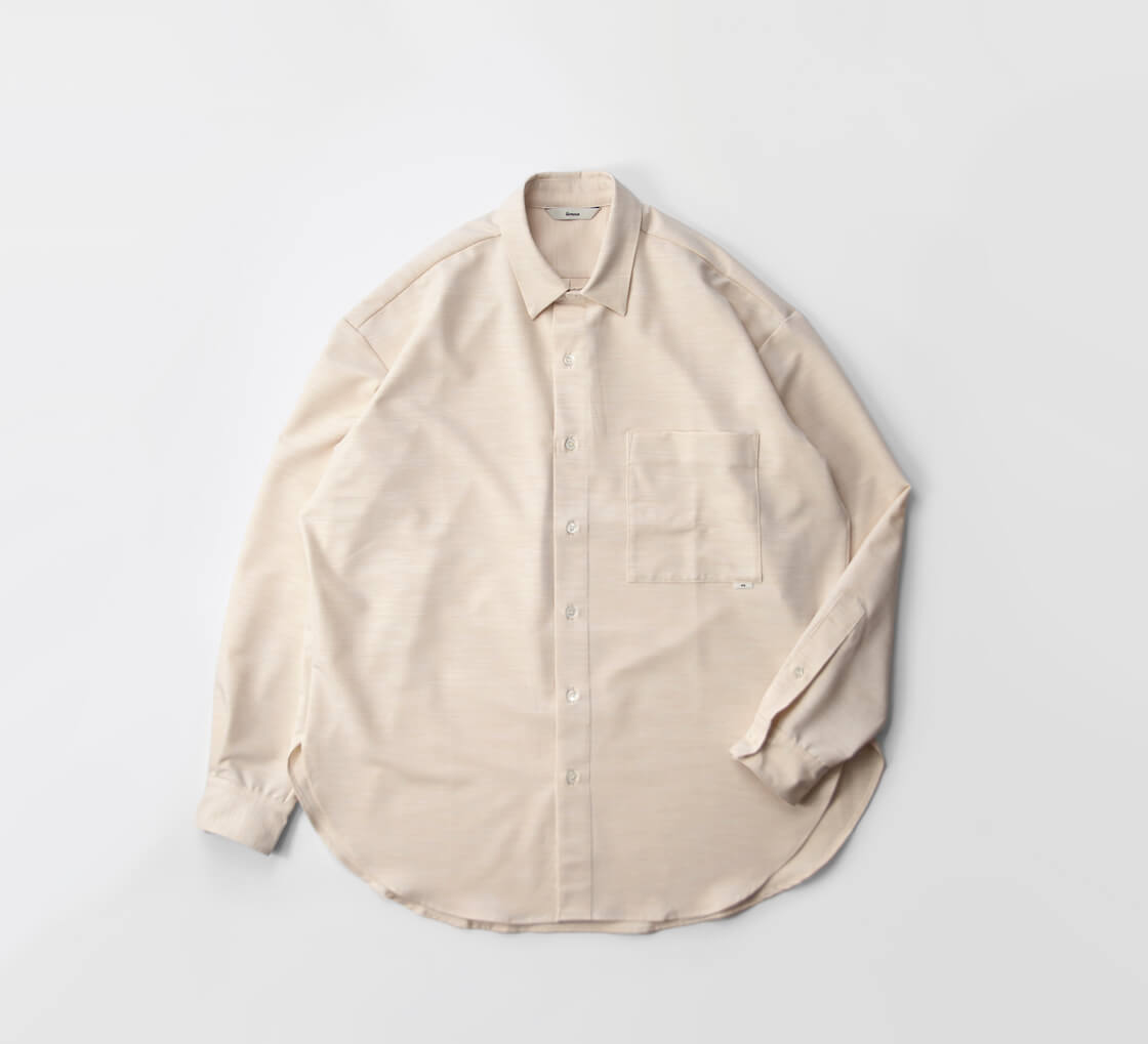 amneのファーストシーズンから途切れることなく作り続けられてきた、ブランドを象徴する定番「クラシックシャツ」。その普遍的な佇まいに、今回はハリとストレッチ性を備えたポリエステル・トロピカル素材を用い、清涼感をまとった一着「TROPICAL classic shirts」として登場。やや小ぶりでステッチを表に出さないミニマルな襟元が品の良さを演出。そして、ゆったりと身体を包み込むオーバーシャツのシルエットが、大人の余裕を感じさせます。裾はラウンド形状で、サイドの切れ上がりは高めに設計。これによりパンツのポケットへスムーズにアクセスでき、手を差し込んだ際にもシルエットが崩れにくいという仕様。さらに、スクエア型の大きめな胸ポケットが、デザインとしてもアクセントに。ミニマルなデザインの中に、機能と品のよさを宿す大人のためのオーバーシャツが、このamneのクシャツなのです。