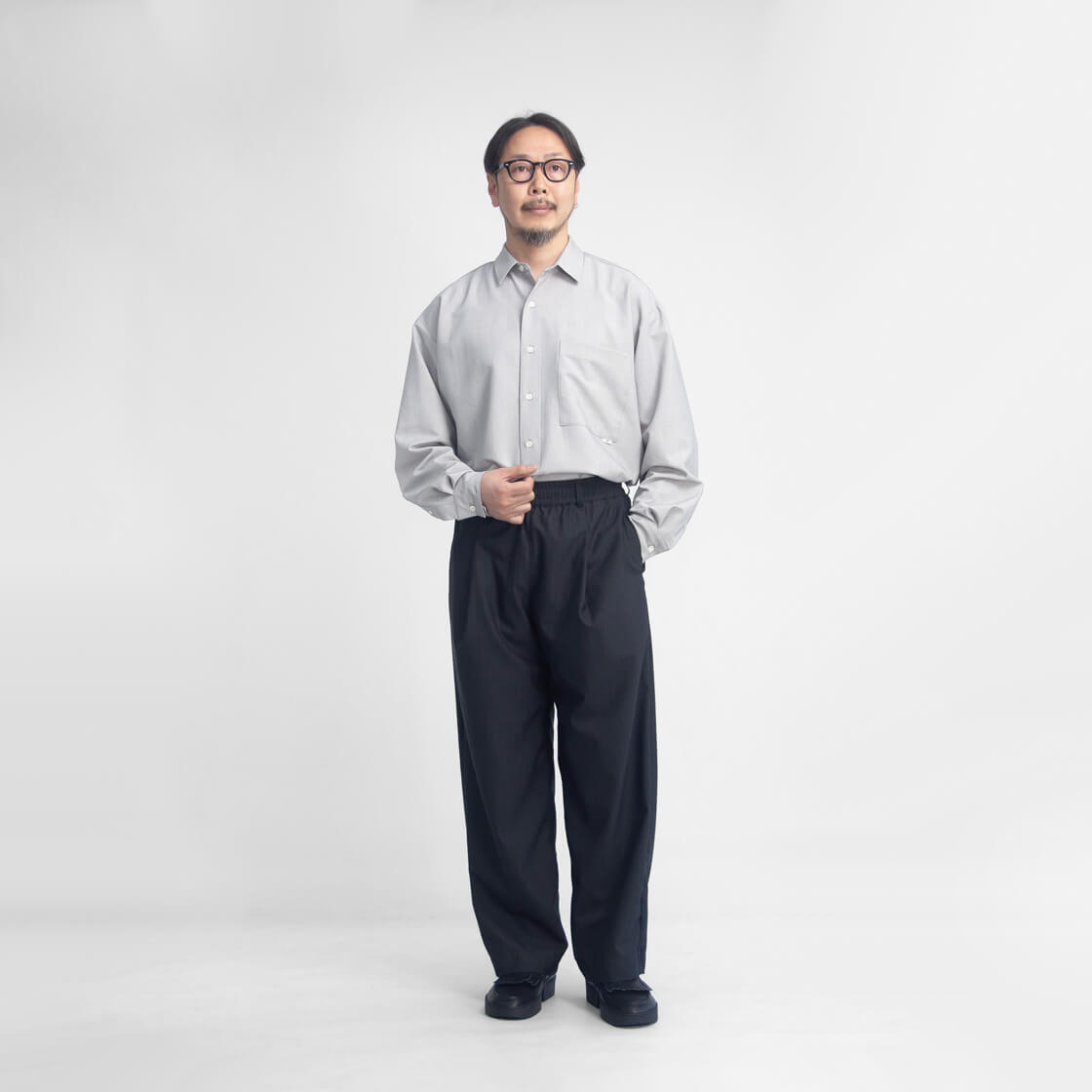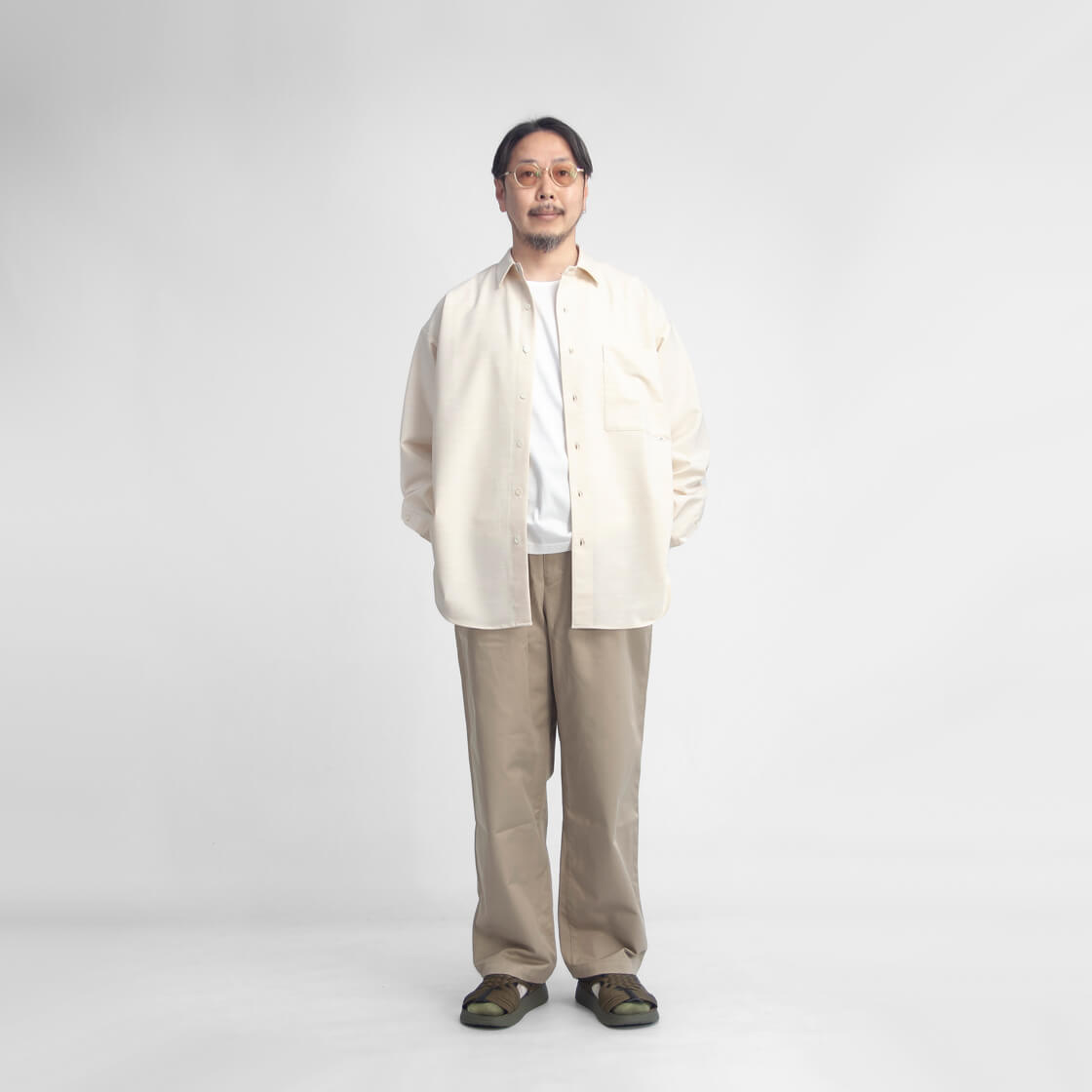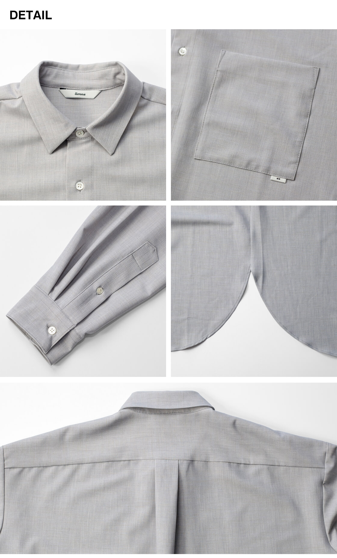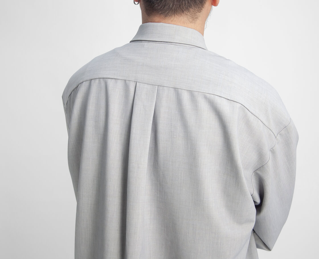 amneのファーストシーズンから途切れることなく作り続けられてきた、ブランドを象徴する定番「クラシックシャツ」。その普遍的な佇まいに、今回はハリとストレッチ性を備えたポリエステル・トロピカル素材を用い、清涼感をまとった一着「TROPICAL classic shirts」として登場。やや小ぶりでステッチを表に出さないミニマルな襟元が品の良さを演出。そして、ゆったりと身体を包み込むオーバーシャツのシルエットが、大人の余裕を感じさせます。裾はラウンド形状で、サイドの切れ上がりは高めに設計。これによりパンツのポケットへスムーズにアクセスでき、手を差し込んだ際にもシルエットが崩れにくいという仕様。さらに、スクエア型の大きめな胸ポケットが、デザインとしてもアクセントに。ミニマルなデザインの中に、機能と品のよさを宿す大人のためのオーバーシャツが、このamneのクシャツなのです。