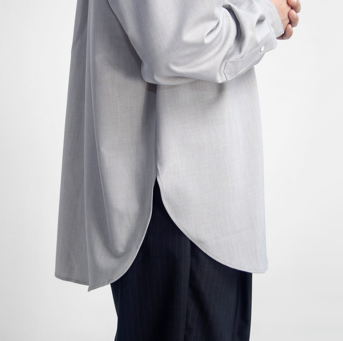 切れ上りが高め・ラウンド形状の裾で手を入れやすい、ゆったりオーバーシャツ。