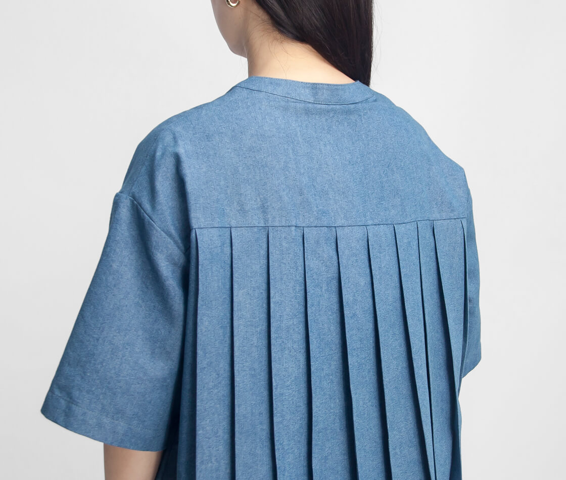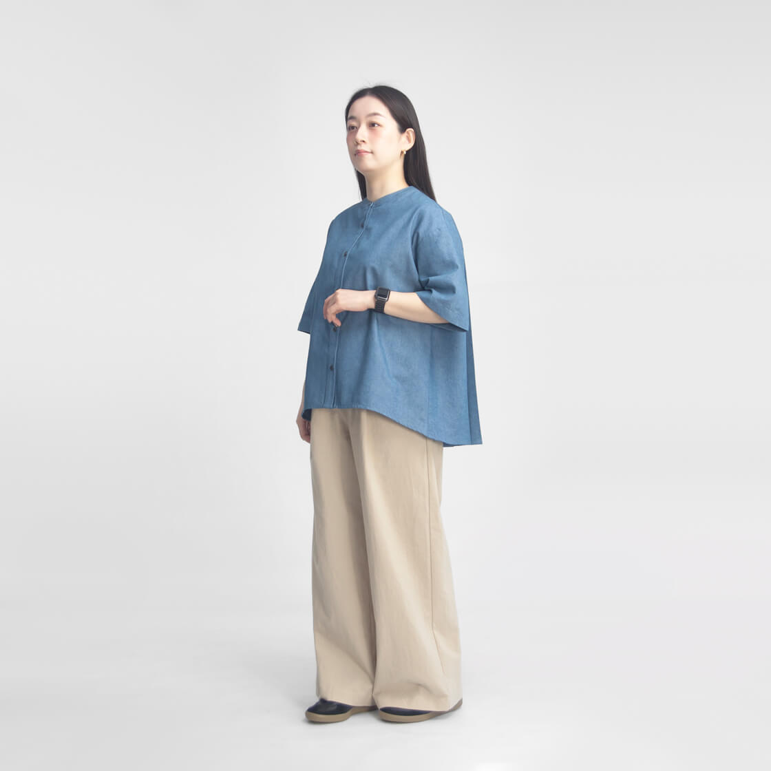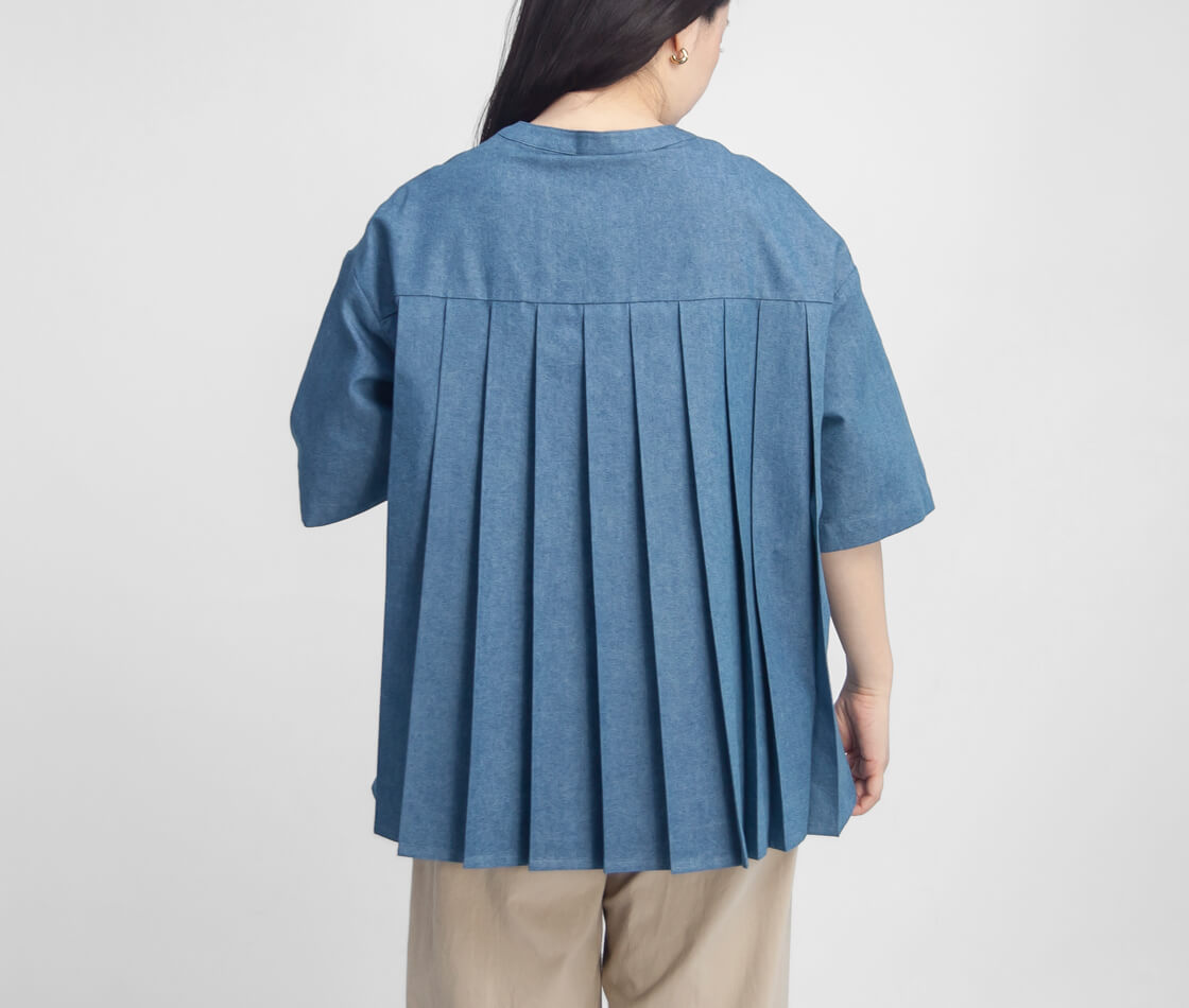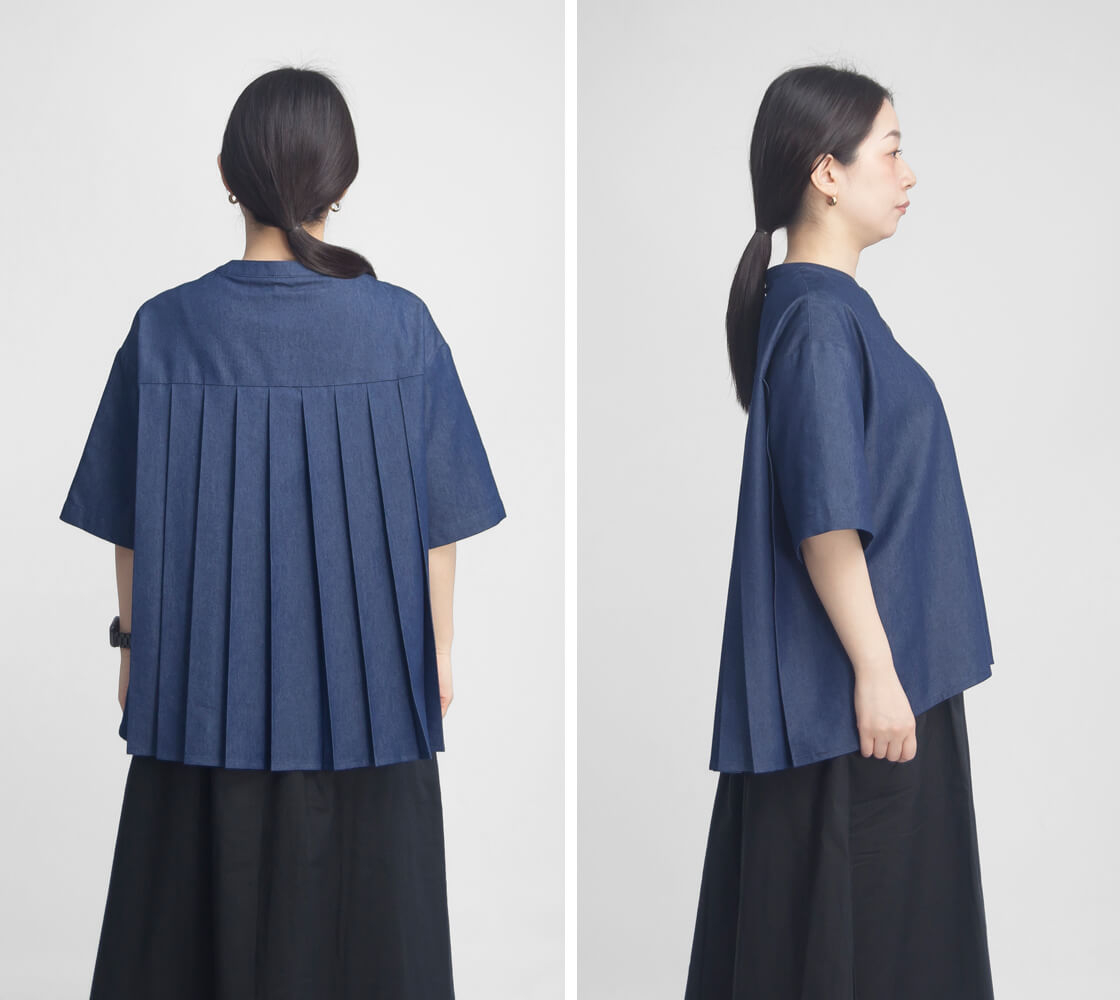 綿とポリエステルを混紡した6.5オンスのライトデニムを使用。見た目以上に軽やかで、ほどよい落ち感のある風合いが魅力です。デニム特有のごわつきを抑えたしなやかな質感で、身体の動きにやさしく馴染み、ストレスフリーな着心地に。 ポリエステルを混紡することで、シワになりにくく乾きやすいイージーケア性もプラス。汗ばむ季節でも快適に過ごせる、頼れる一枚です。 柔らかな生地感が背面プリーツの美しいドレープを引き立て、ポリエステル混素材ならではの形状安定性によりプリーツのラインも崩れにくい仕上がり。動くたびに表情のあるシルエットを演出します。 デイリー使いはもちろん、旅行やお出かけなど長時間の着用にも最適。着るほどに身体に馴染み、デニムならではの経年変化も楽しめる、自然と愛着が深まっていく一着です。