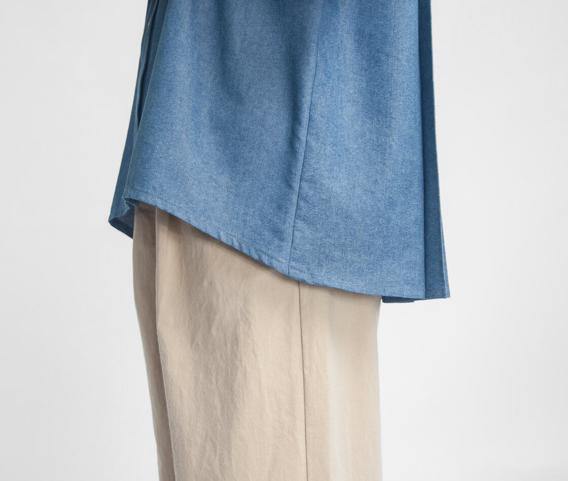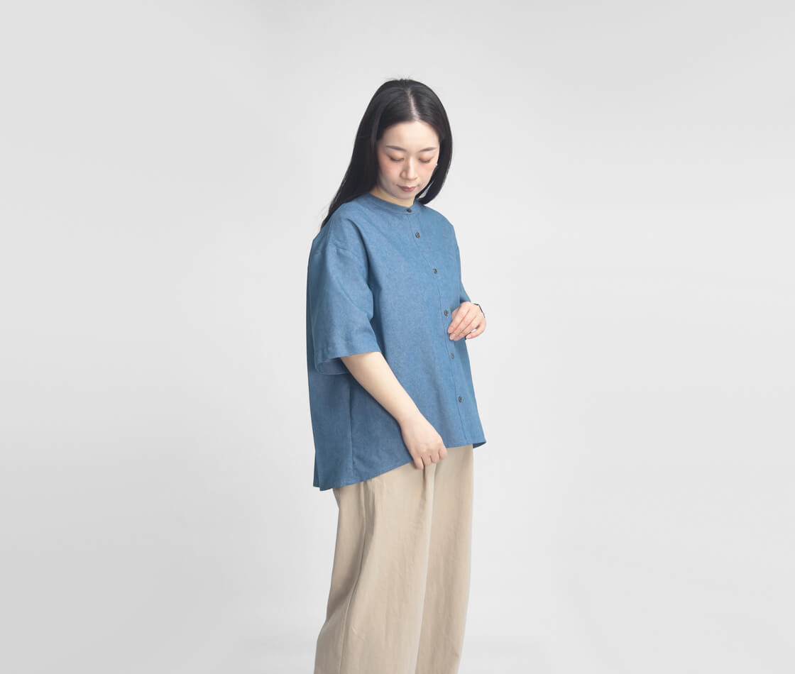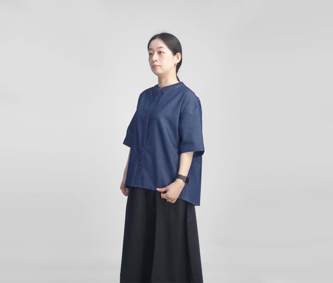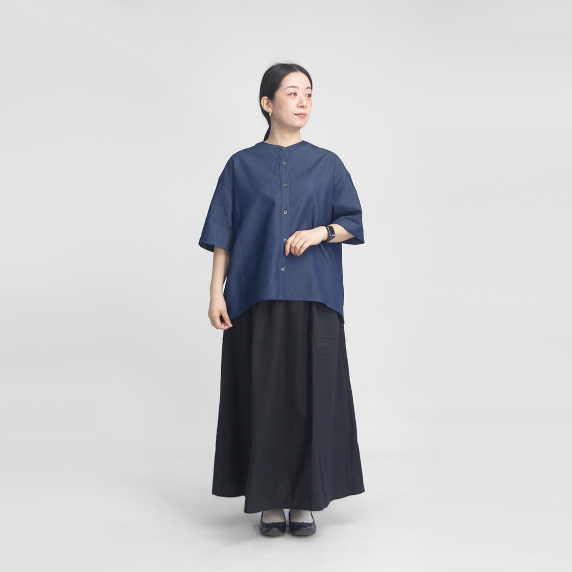 綿とポリエステルを混紡した6.5オンスのライトデニムを使用。見た目以上に軽やかで、ほどよい落ち感のある風合いが魅力です。デニム特有のごわつきを抑えたしなやかな質感で、身体の動きにやさしく馴染み、ストレスフリーな着心地に。 ポリエステルを混紡することで、シワになりにくく乾きやすいイージーケア性もプラス。汗ばむ季節でも快適に過ごせる、頼れる一枚です。 柔らかな生地感が背面プリーツの美しいドレープを引き立て、ポリエステル混素材ならではの形状安定性によりプリーツのラインも崩れにくい仕上がり。動くたびに表情のあるシルエットを演出します。 デイリー使いはもちろん、旅行やお出かけなど長時間の着用にも最適。着るほどに身体に馴染み、デニムならではの経年変化も楽しめる、自然と愛着が深まっていく一着です。