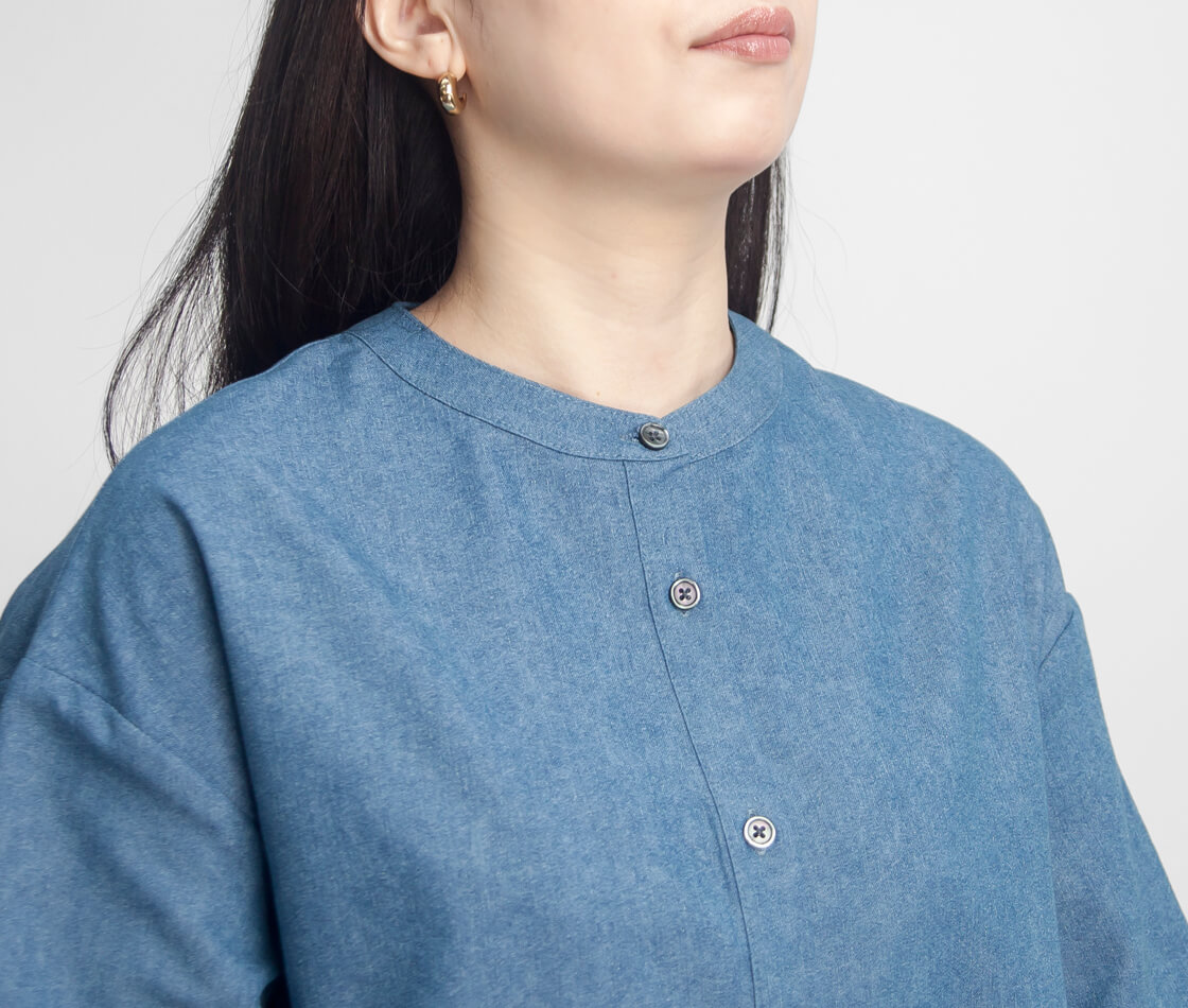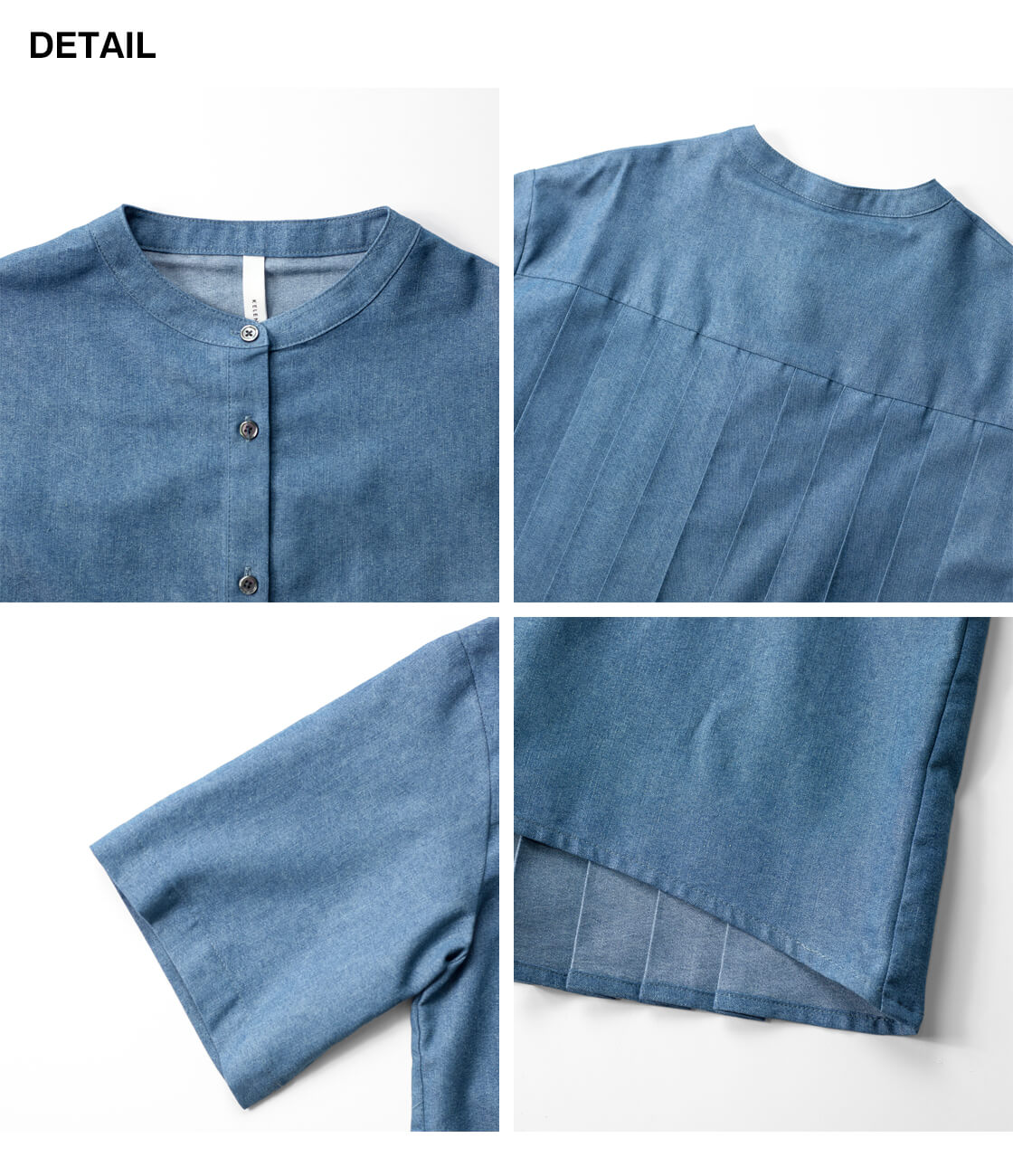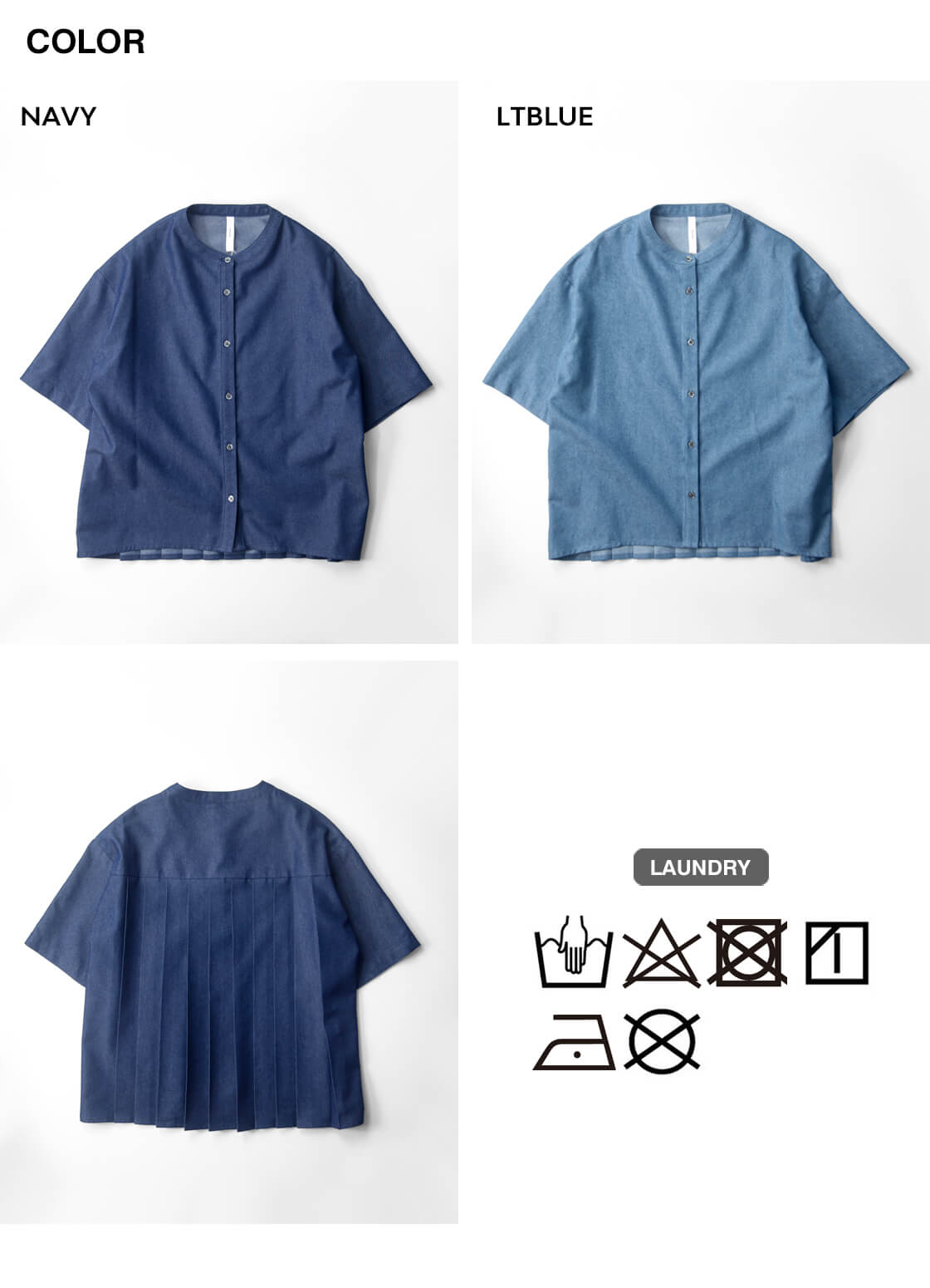 軽やかなデニム素材で仕立てた、リラックス感のあるレディースシャツ。後ろ姿に表情を加えるプリーツデザインが特徴で、シンプルながらも一枚で着映えするアイテムです。後ろ身頃はヒップが隠れる長めの着丈で体型カバーも叶えつつ、カジュアルからきれいめまで幅広いスタイリングに対応。デニムパンツとのセットアップ風コーデや、スラックスやスカートと合わせて抜け感のある大人カジュアルにもおすすめです。