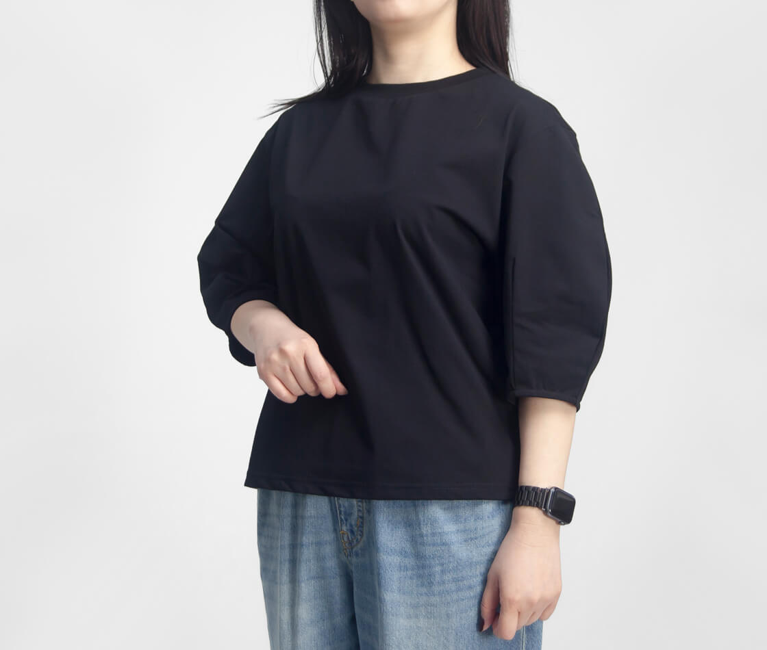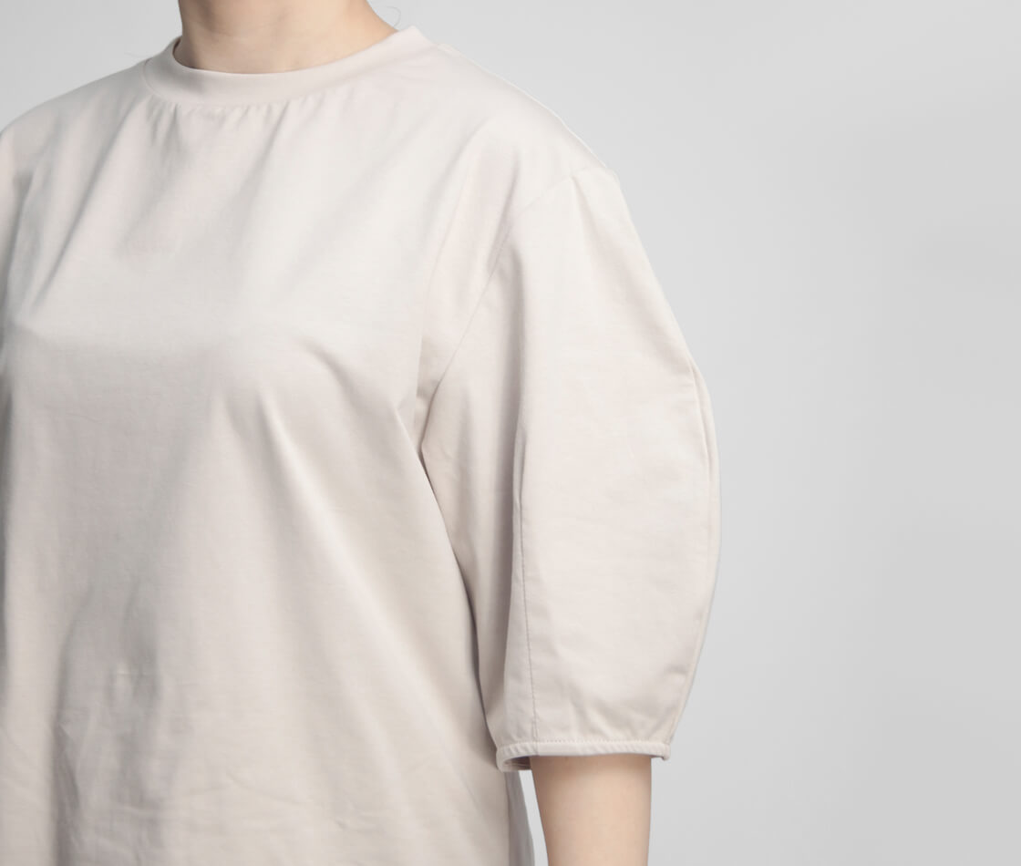アーチ状にふんわりと膨らむ立体的なスリーブが印象的。6分丈で肘下までカバーすることで、気になる腕まわりを自然に包み込みつつ、上品なボリューム感をプラスします。袖の存在感と対照的に身頃はすっきりと仕上げることでメリハリのあるシルエットに。シンプルながら印象に残るデザインに仕上がっています。