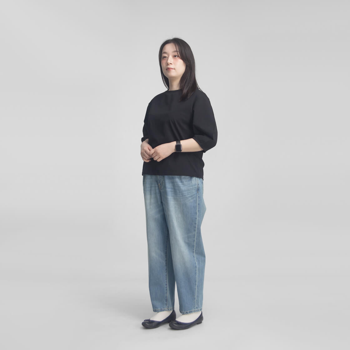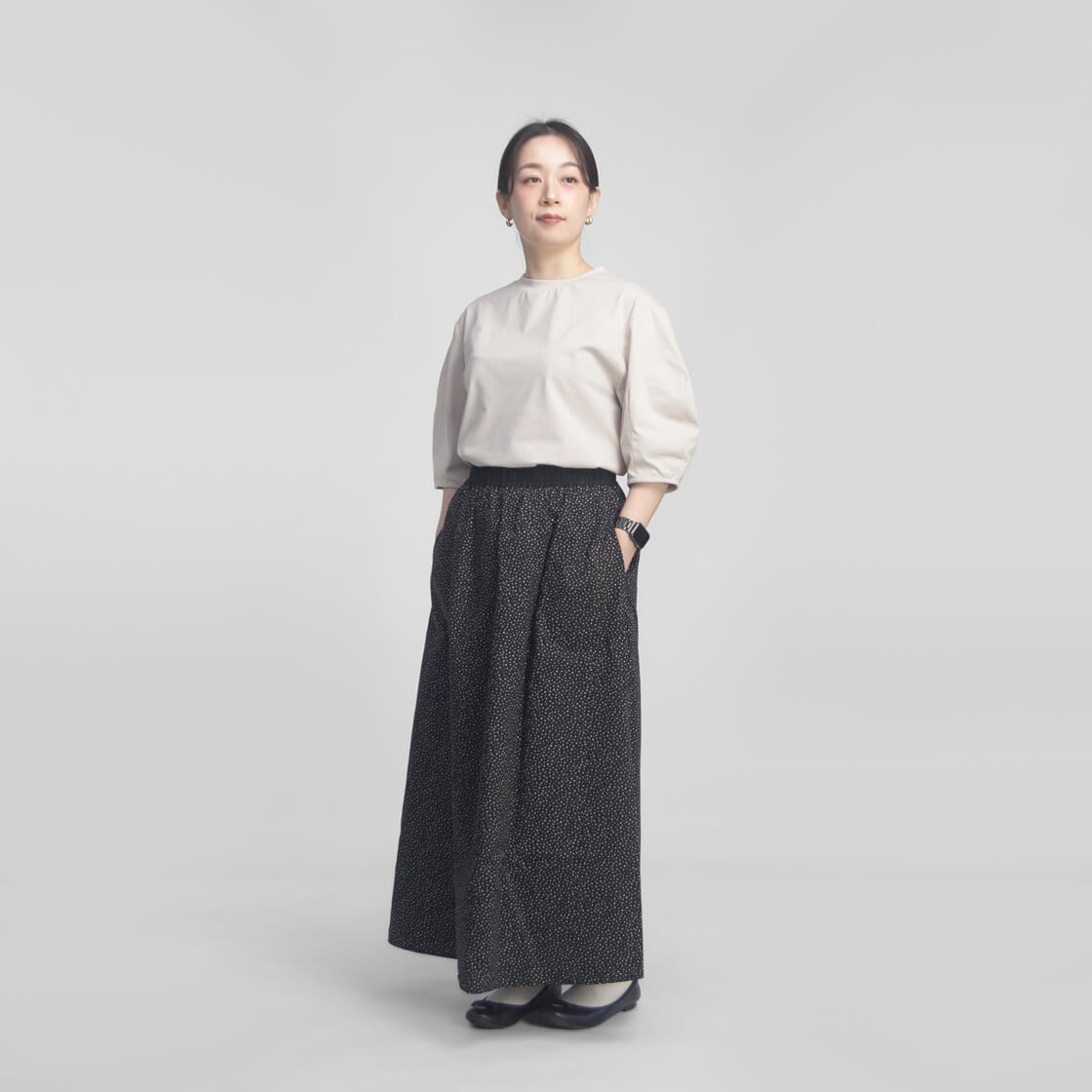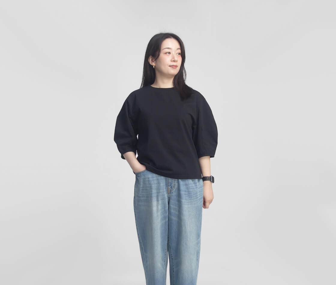 36サイズを着用しました。 程よいハリがありながらも軽やかな着心地で、肌あたりはやさしく快適に着用できます。身体のラインを拾いすぎない適度なゆとりがあり、リラックス感ときちんと感を両立。肘下まである6分丈の袖が、気になる腕まわりもさりげなくカバーします。着丈は腰下あたりのバランスの取りやすい長さで、タックインもしやすく、コーディネートの幅が広がります。