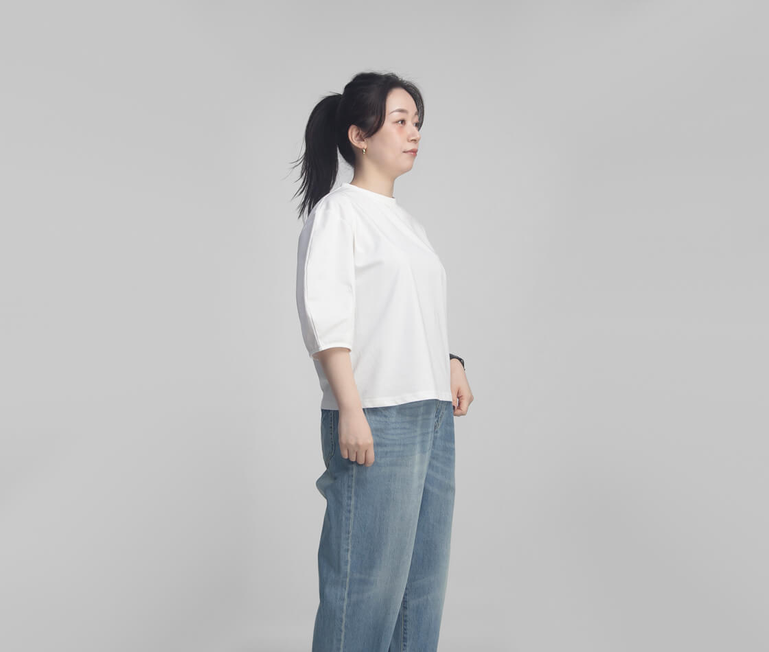 シンプルながらも一枚で着映えする、袖がカーブしたデザインのこちらのTシャツ。程よいハリ感と計算されたシルエットにより、カジュアルすぎず、きちんと感も演出できる一着です。着丈はやや短めに設定されているため、ワイドパンツやハイウエストデニム、フレアスカートともバランスよく合わせやすく、タックインせずに着ても全体がすっきりまとまります。ボトムスや小物の合わせ方によって日常使いからちょっとした外出まで幅広く活躍します。