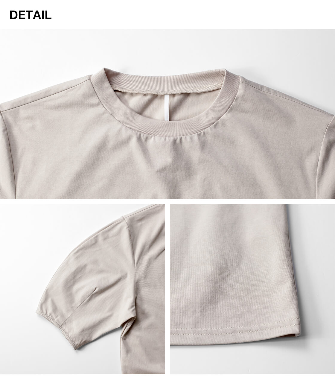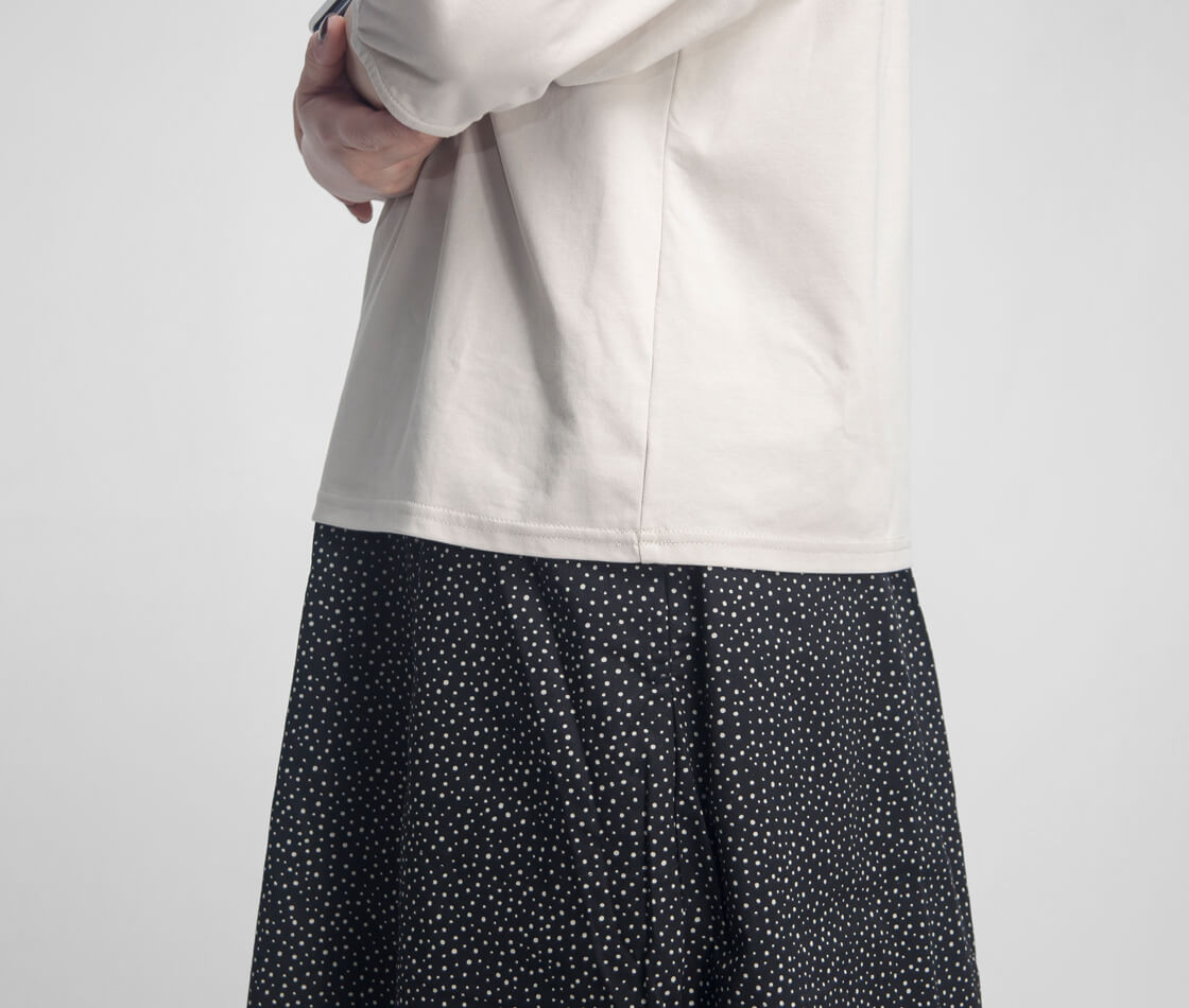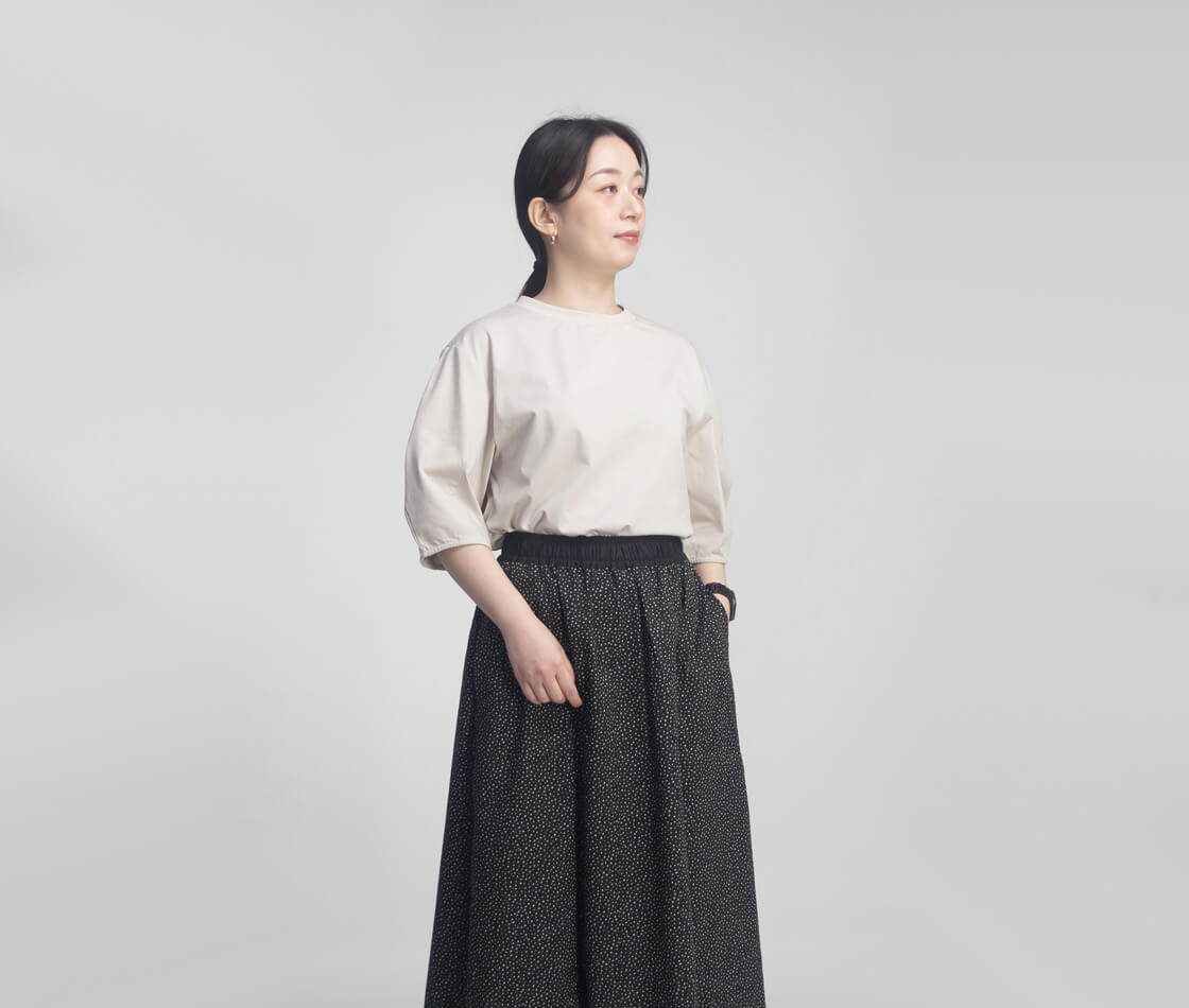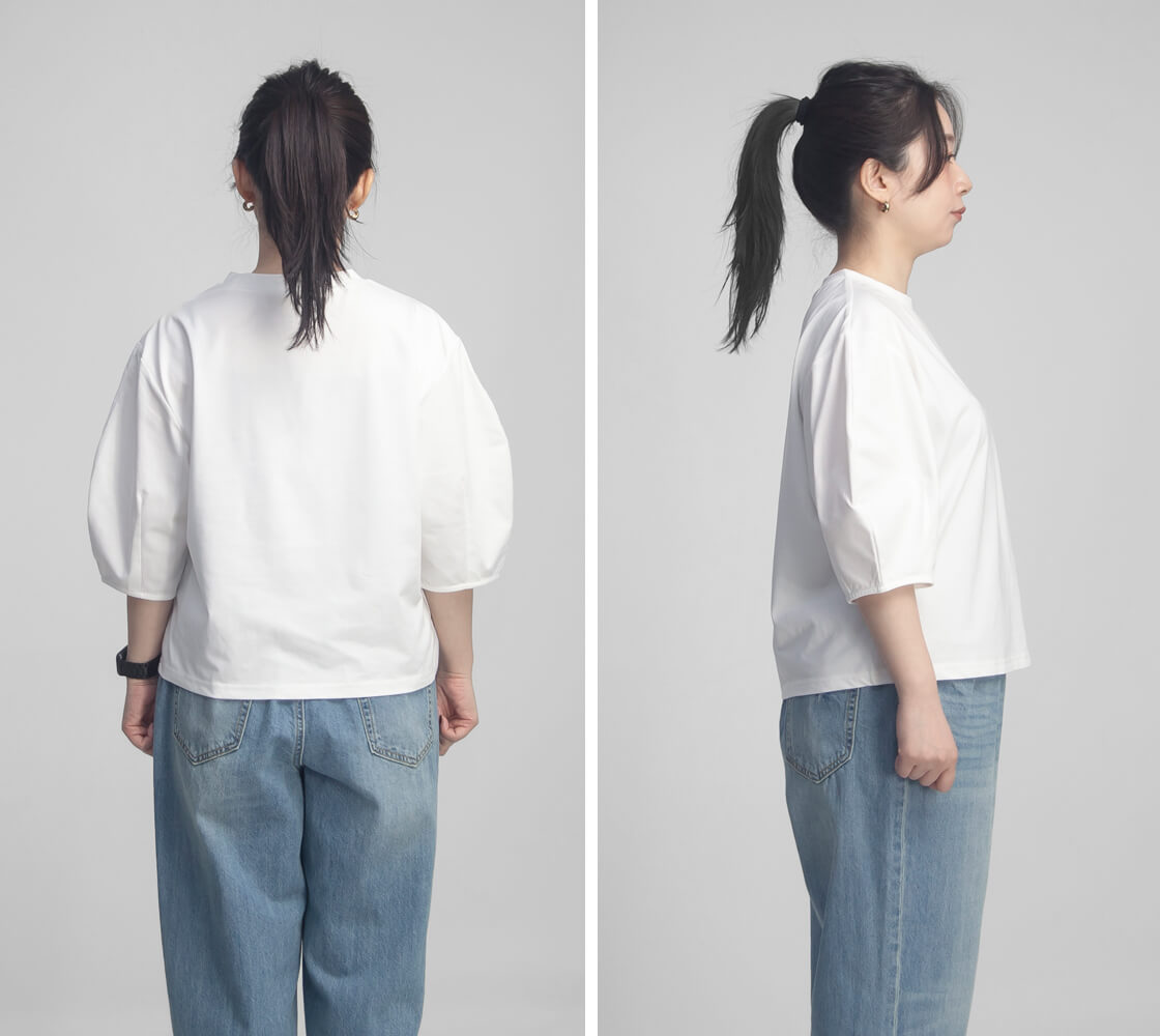 高密度に織り上げた綿ポリエステル素材を使用し、程よいハリ感を持たせた生地が特徴です。このハリによって袖の立体的なフォルムが美しく保たれ、着用時もシルエットをきれいにキープ。動いても形が崩れにくく、自然と整った印象を演出します。コットンのやわらかな風合いに、ポリエステルの軽さと扱いやすさを兼ね備えているため、長時間の着用でもストレスを感じにくく、シワになりにくい点も日常使いに嬉しいポイントです。