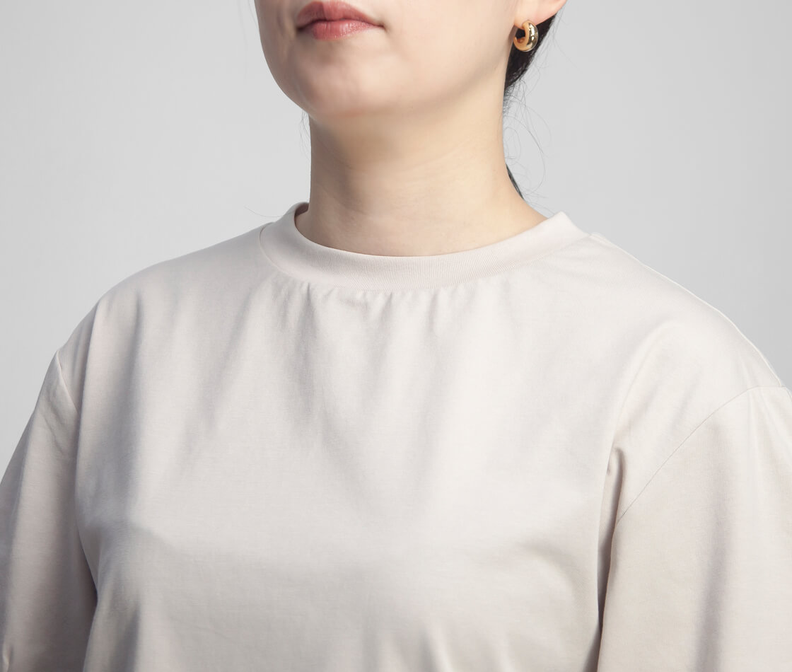 適度な厚みがあり透けにくいため、一枚でさらっと着るだけでも安心感のある着心地に。デニムやワイドパンツと合わせてカジュアルにまとめてもラフになりすぎず、きれいめなスラックスやロングスカートと合わせれば上品な印象に仕上がります。足元をスニーカーにして抜け感を出したり、レザーサンダルやパンプスと組み合わせて女性らしさをプラスするなど、幅広いスタイリングに自然と馴染む万能な素材感です。