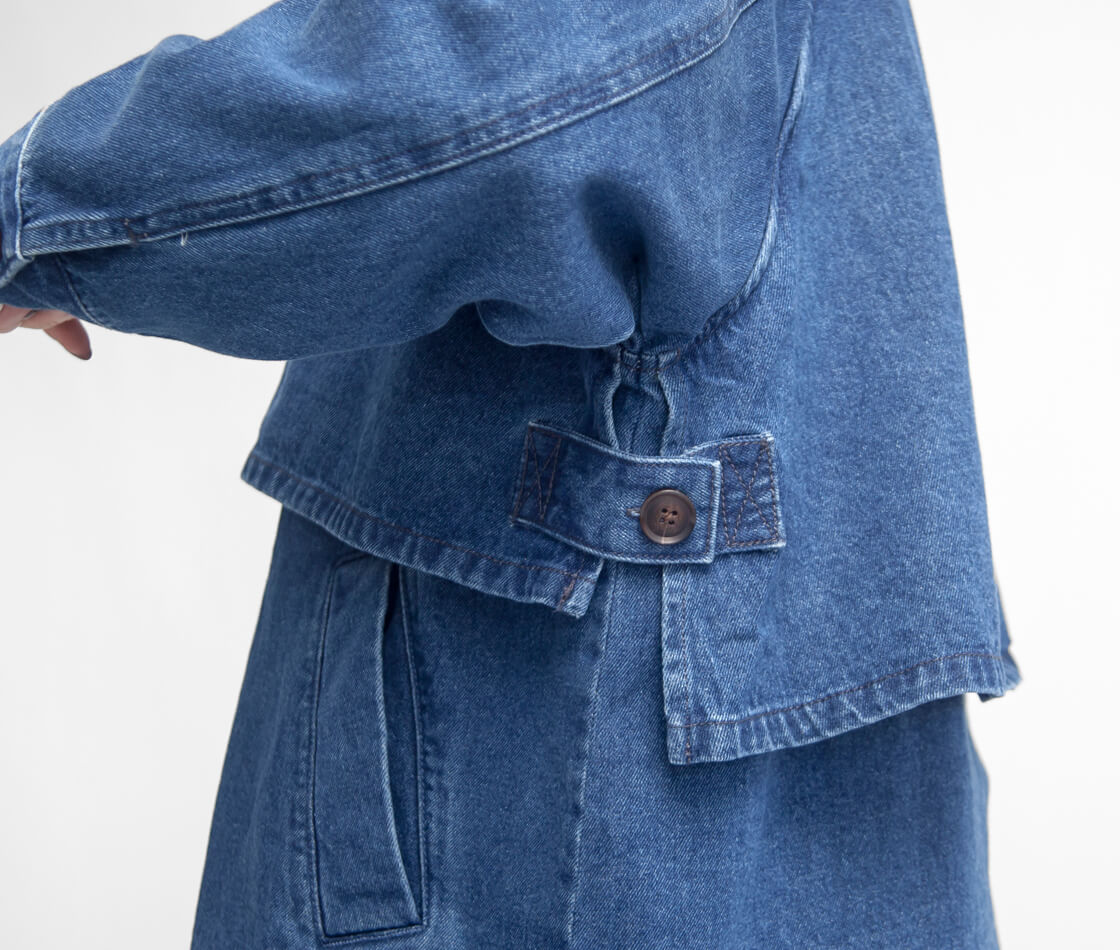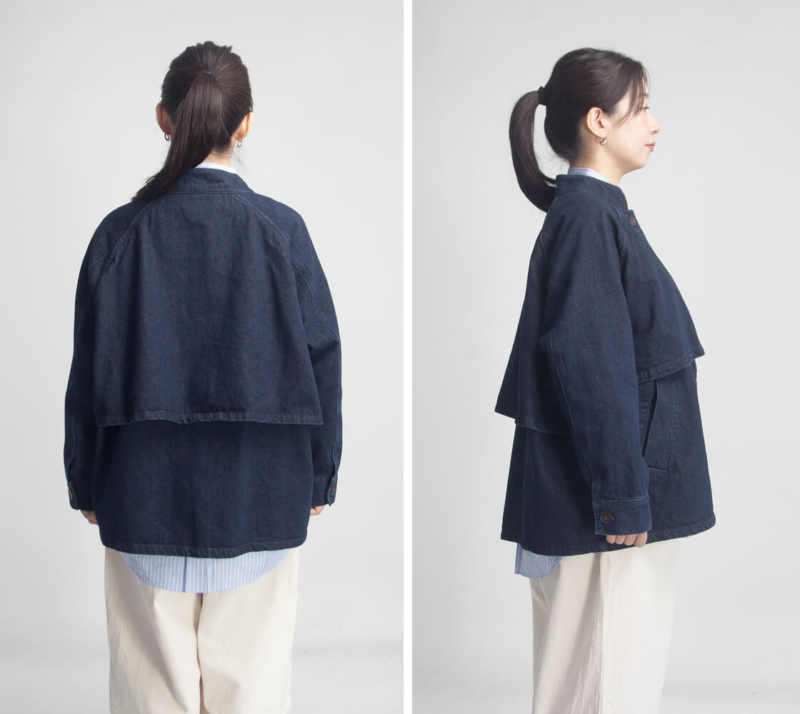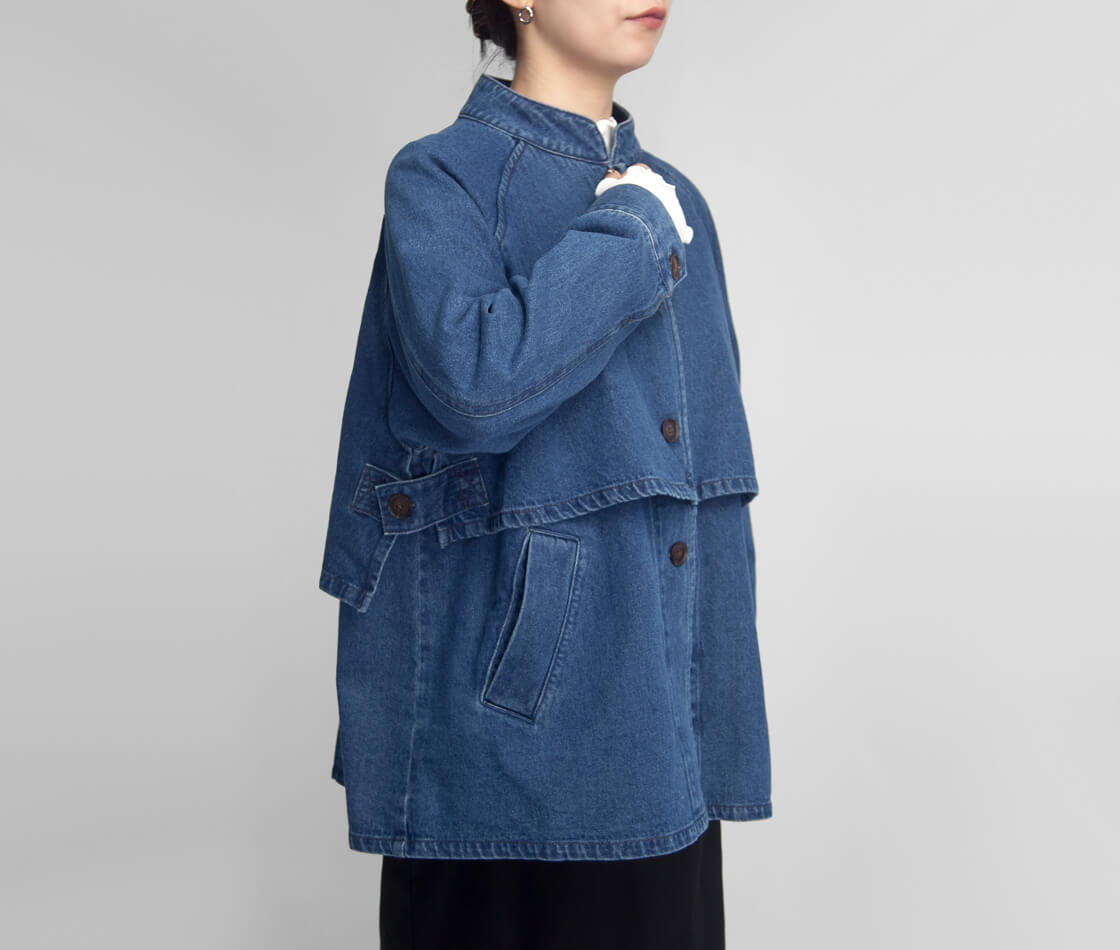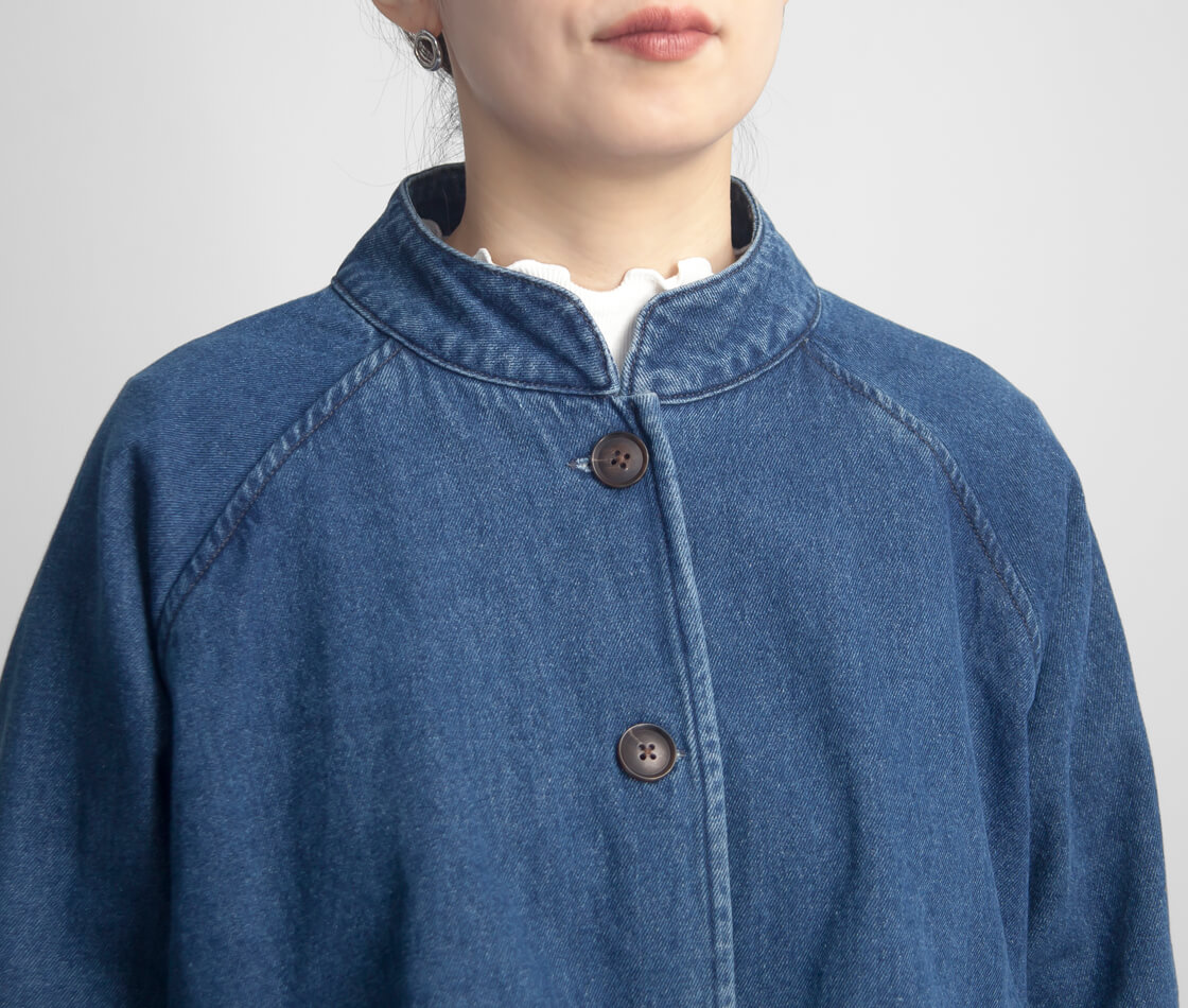 素材には、コットン100%のデニム地を使用。天然素材ならではのやわらかさと通気性の良さが魅力で、肌に触れたときの心地よさを感じられる一着に。ハリ感を抑えたナチュラルな風合いが、デニム特有のカジュアルさをやさしく和らげ、大人の女性に似合う上品な印象を演出します。ほどよい厚みで年間でも長い期間で着まわせるのも嬉しいポイント。