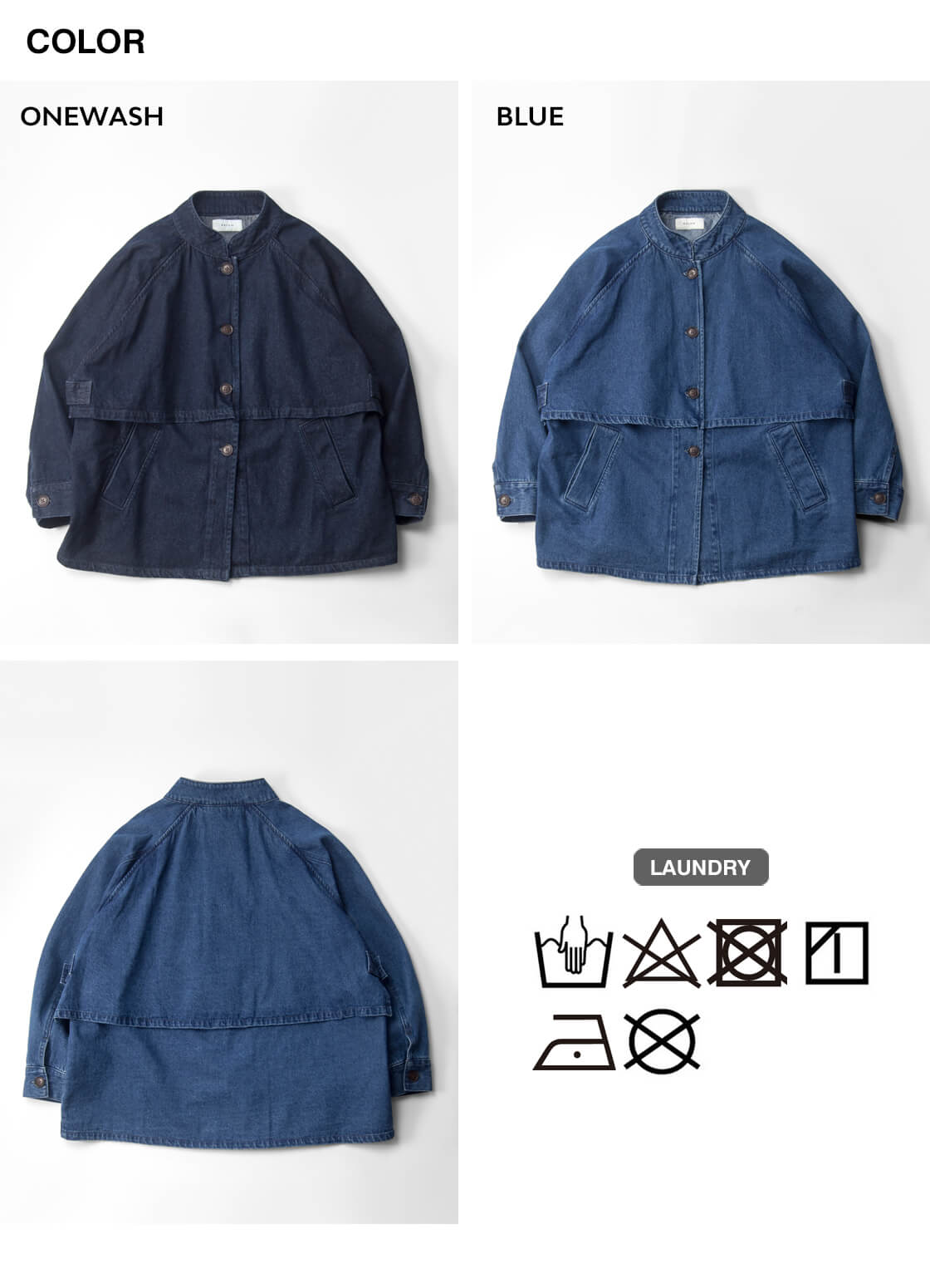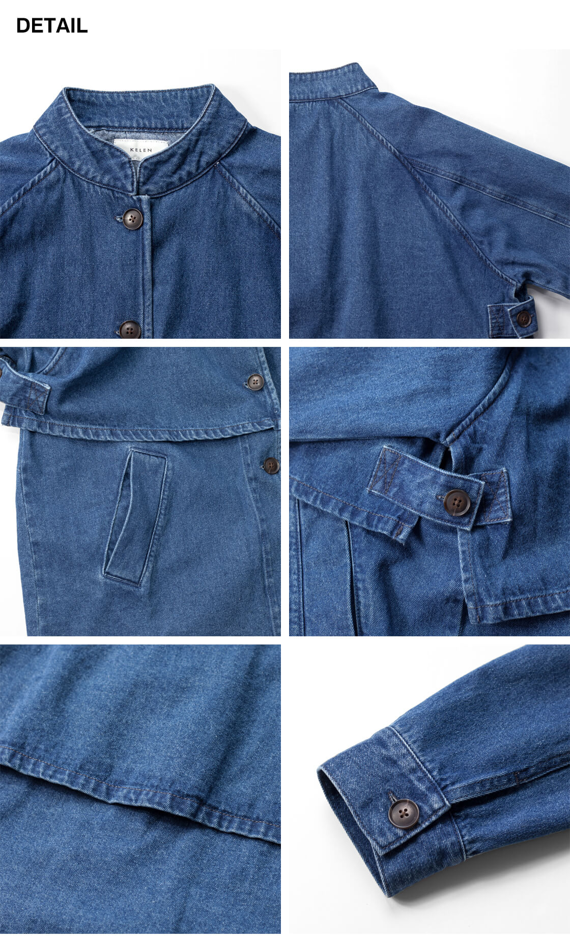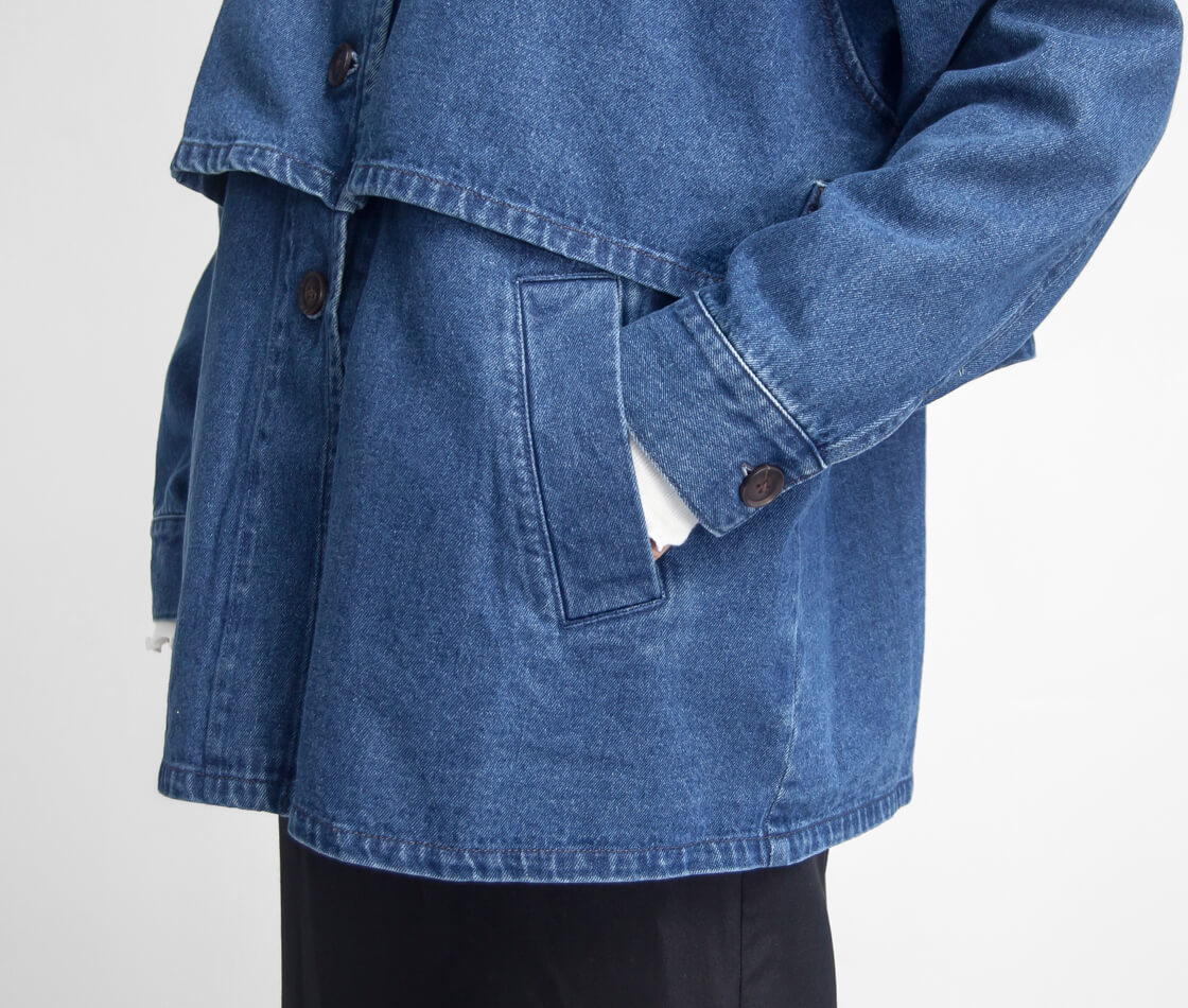 素材には、コットン100%のデニム地を使用。天然素材ならではのやわらかさと通気性の良さが魅力で、肌に触れたときの心地よさを感じられる一着に。ハリ感を抑えたナチュラルな風合いが、デニム特有のカジュアルさをやさしく和らげ、大人の女性に似合う上品な印象を演出します。ほどよい厚みで年間でも長い期間で着まわせるのも嬉しいポイント。