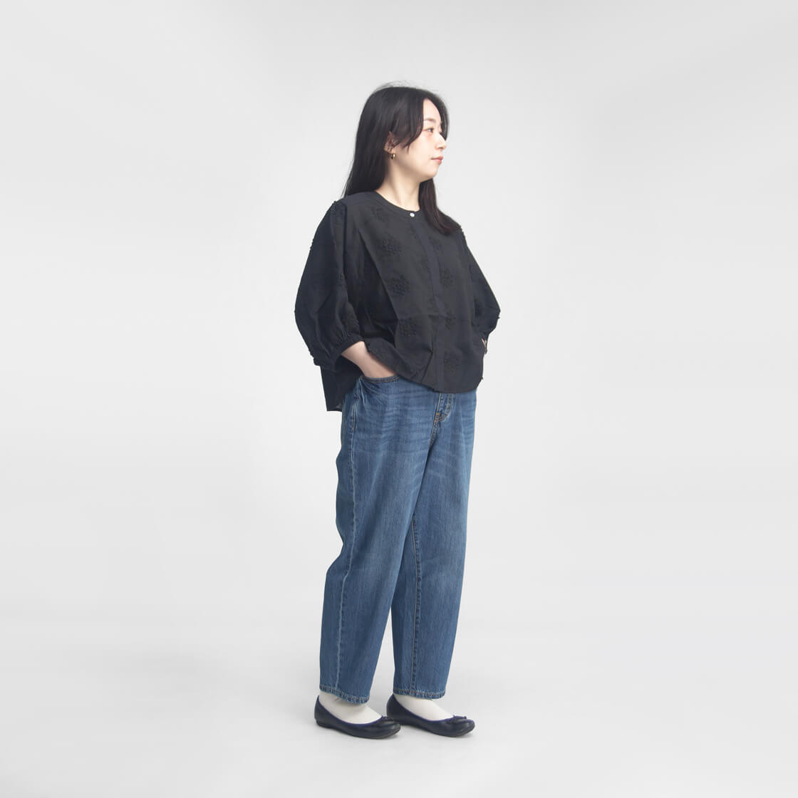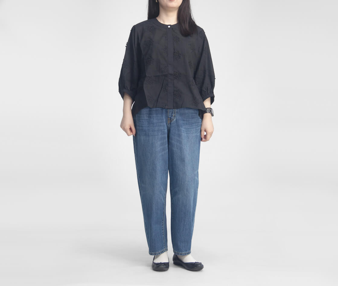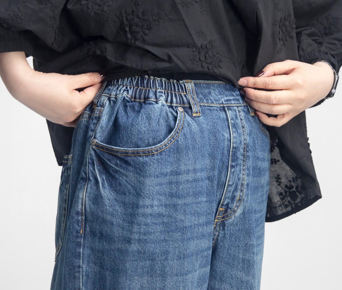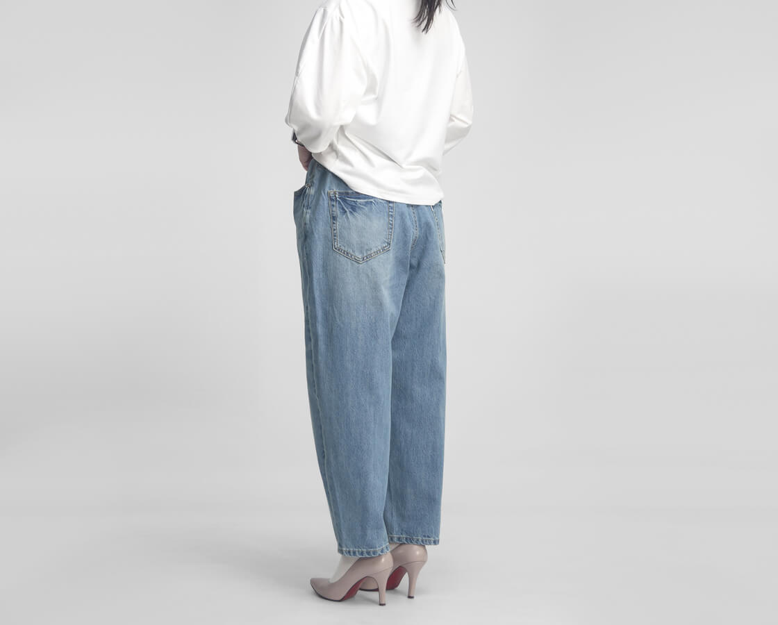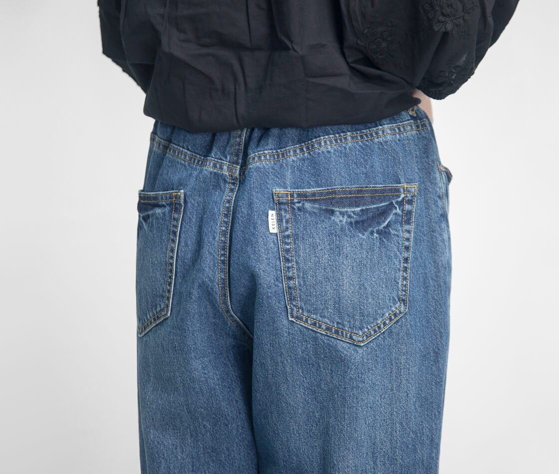 使用しているデニムは10.2オンスの程よい厚みで、丈夫さと柔らかさが絶妙なバランス。生地自体はしっかりとしており、耐久性に優れているため長く愛用いただけます。一方で、洗い加工を施すことで生地が自然に柔らかくなり、肌触りは非常に心地よく、着用感も快適です。さらに、ポケットや裾などにさりげなく色落ちやアタリ加工を施すことで、デニムに立体感と表情をプラスし、カジュアルながらもこなれた印象に仕上がっています。体に程よく馴染み、動きやすさも兼ね備えているため、長時間の着用でもストレスを感じさせません。また、厚みがある分型崩れしにくく、デニム本来の質感や表情を楽しみながら、きれいなシルエットをキープできるのも魅力です。