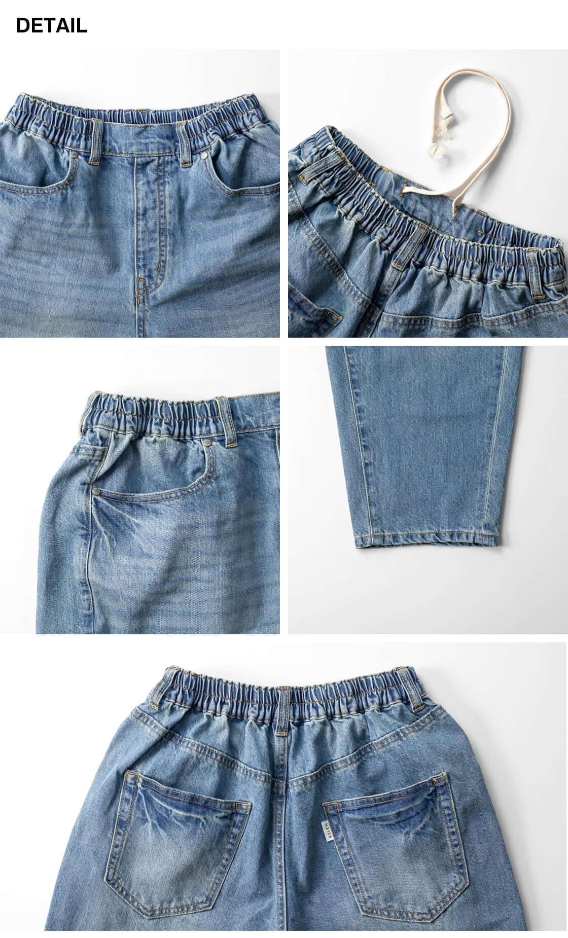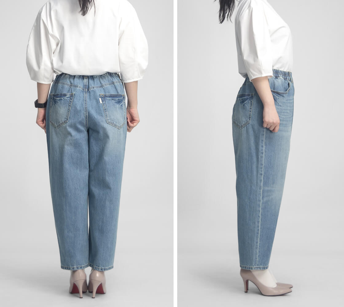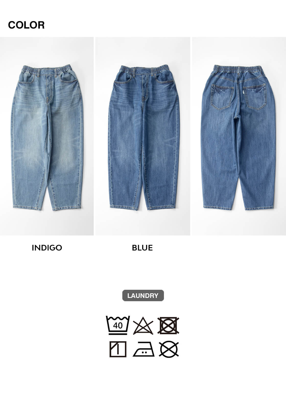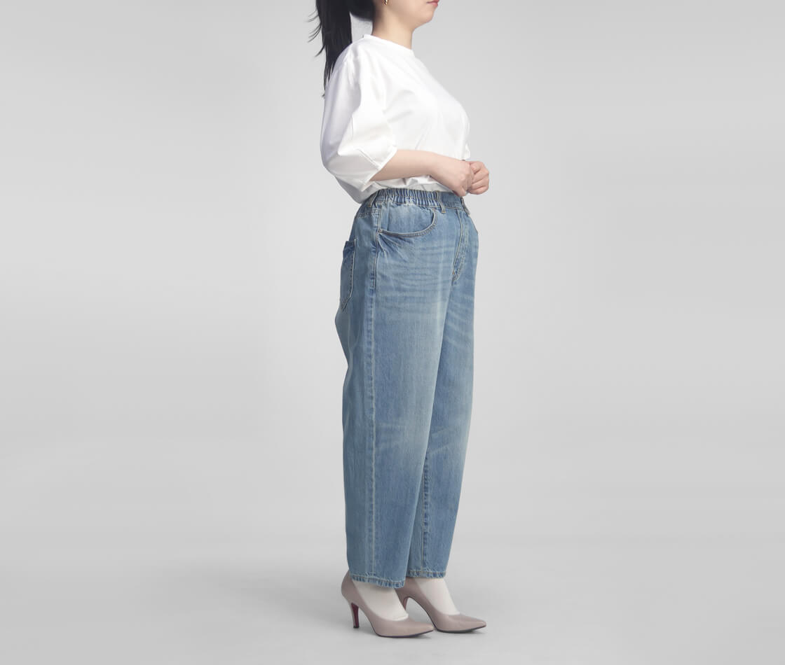 Sサイズを着用しました。 ウエストは総ゴムとドローコードで、脱ぎ着もスムーズで調節も簡単。長時間座っていてもストレスなく過ごせます。デニム生地ですが柔らかく、全体的にゆったりしているので、窮屈さや動きにくさを感じることもありません。丈はくるぶしくらいなので、私の身長でも足元がすっきり見えて、スニーカーやサンダル、パンプスなど、どんな靴にも合わせやすいです。リラックス感があるのに野暮ったくならず、大人っぽくきれいめに穿けるので、普段使いからお出かけまで幅広く活躍してくれそう。
