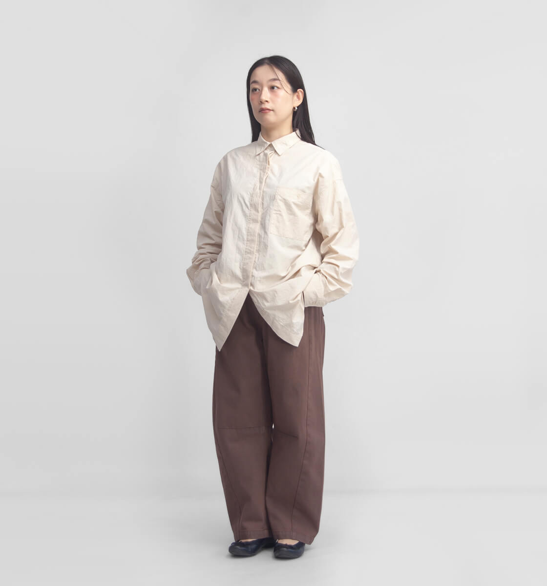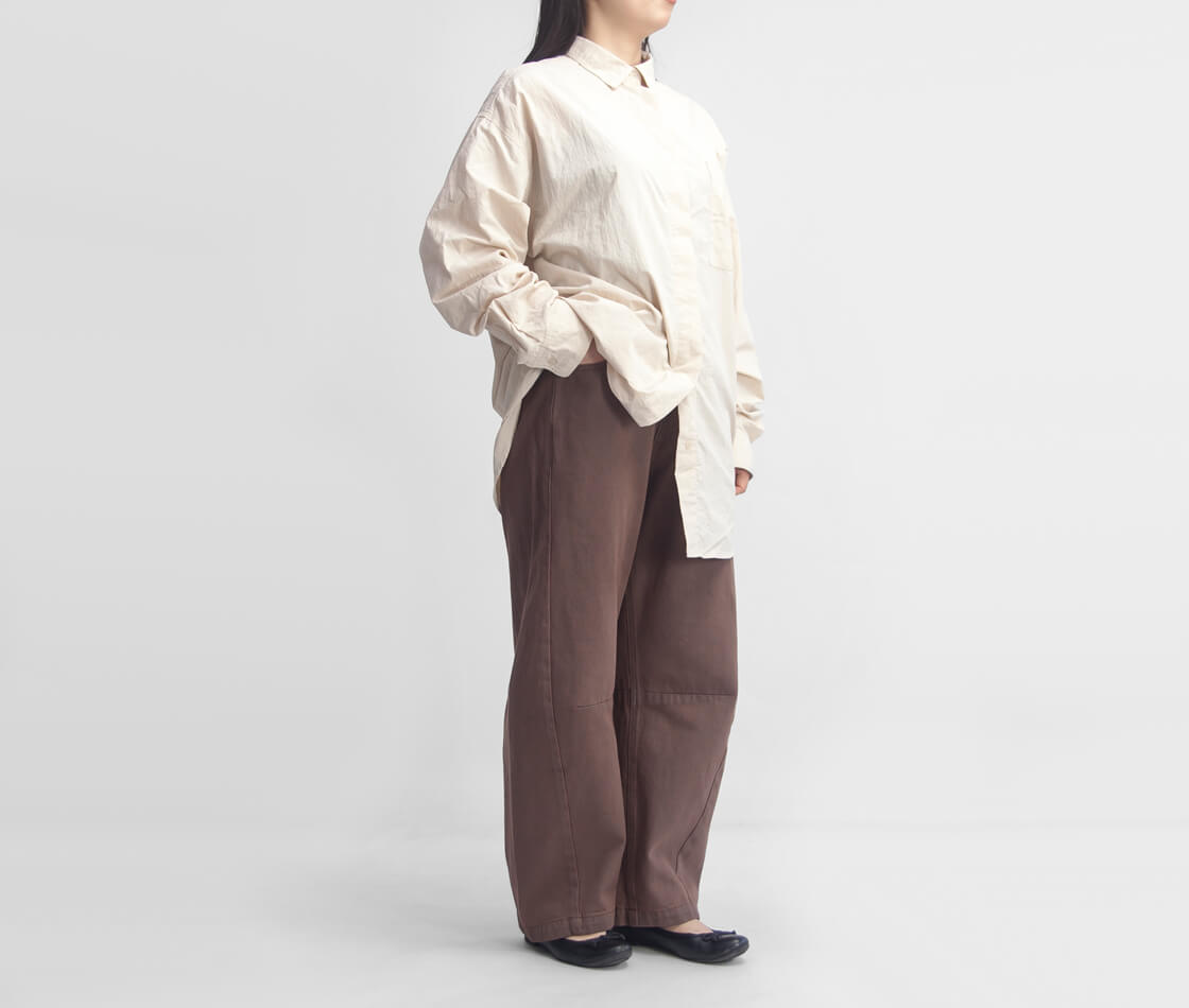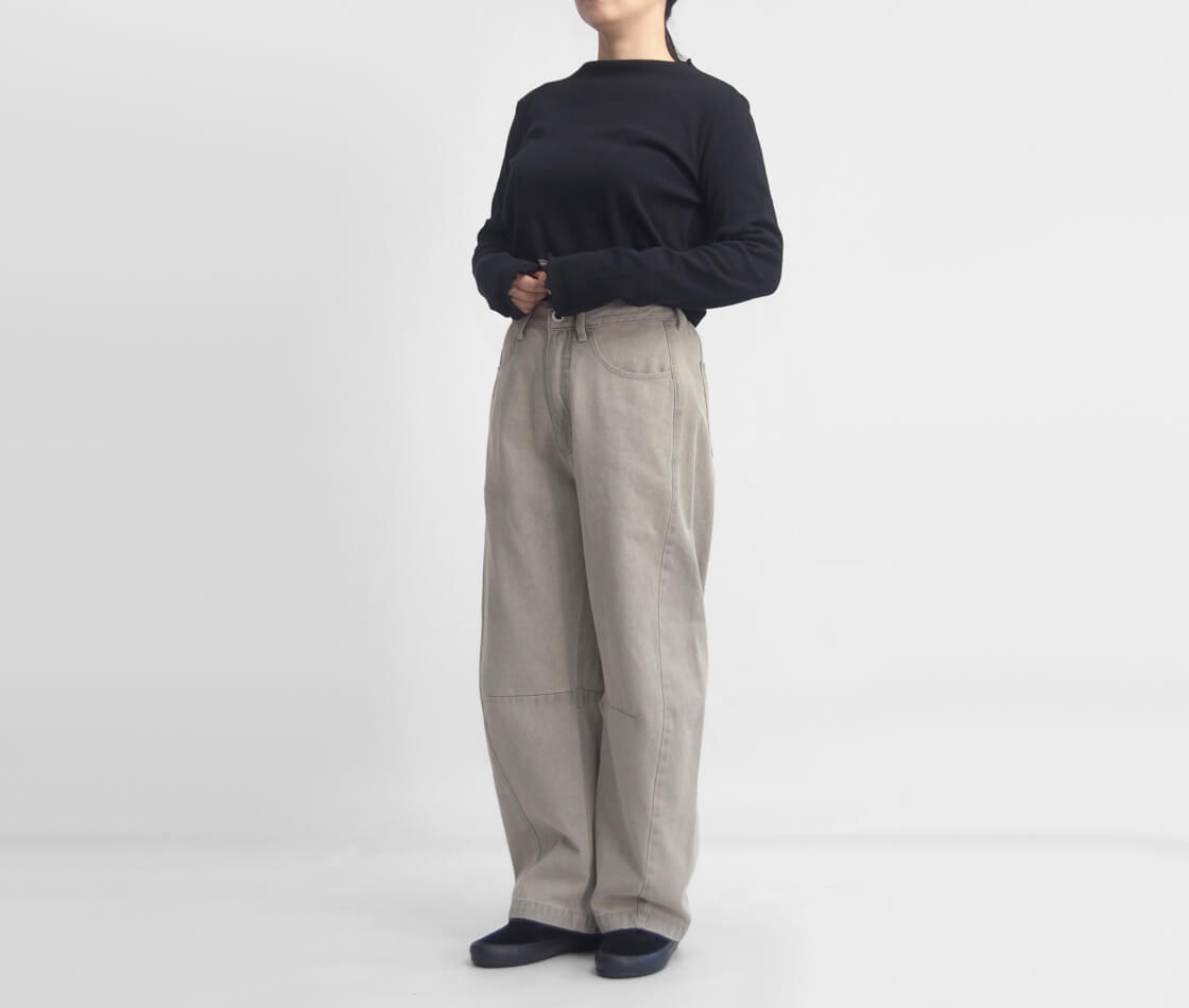 膝まわりに自然な立体感を生み出すよう設計された、こだわりのカーブラインが印象的な1本。裾にかけて脇のラインを前に振ることで、脚全体がすっきりと見え、より美しいバランスに。さらに内股にはダーツを施し、膝位置を立体的に見せることで、横からのシルエットにも抜かりのない仕上がりに。視覚的な脚長効果はもちろん、どの角度から見ても洗練された印象を与えてくれます。