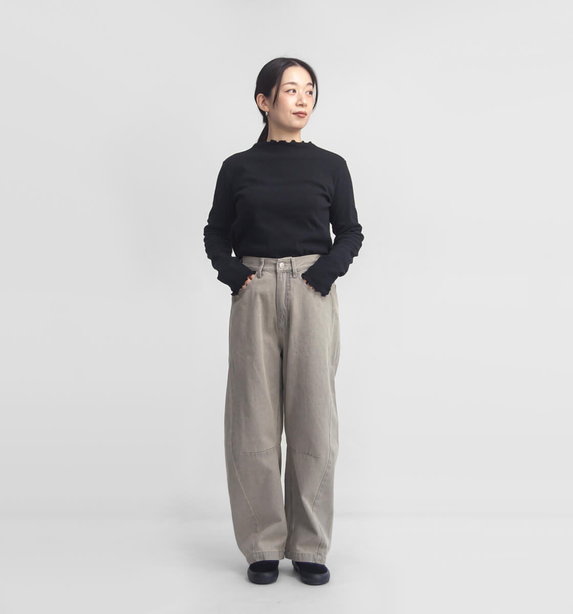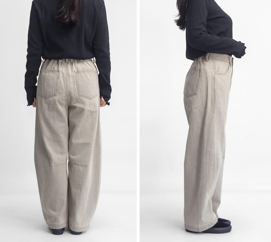 ウエストは前側がすっきりとしたフラット仕様で、トップスをインしたスタイリングもスマートに決まります。後ろはゴム仕様になっているため、動きやすく、長時間の着用でもストレスを感じにくい快適なフィット感。細部までこだわった仕様により、穿くだけで自然とスタイルアップが叶う、大人のための一本です。