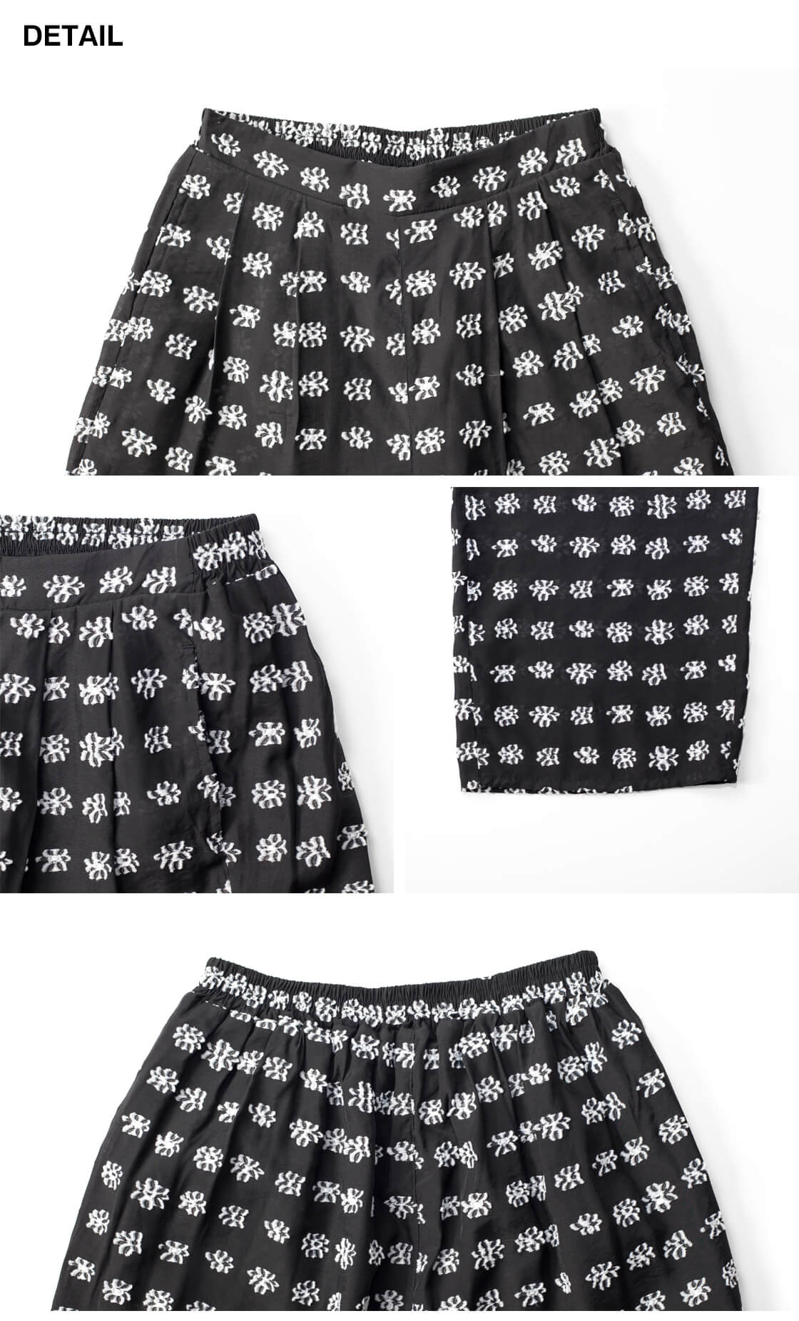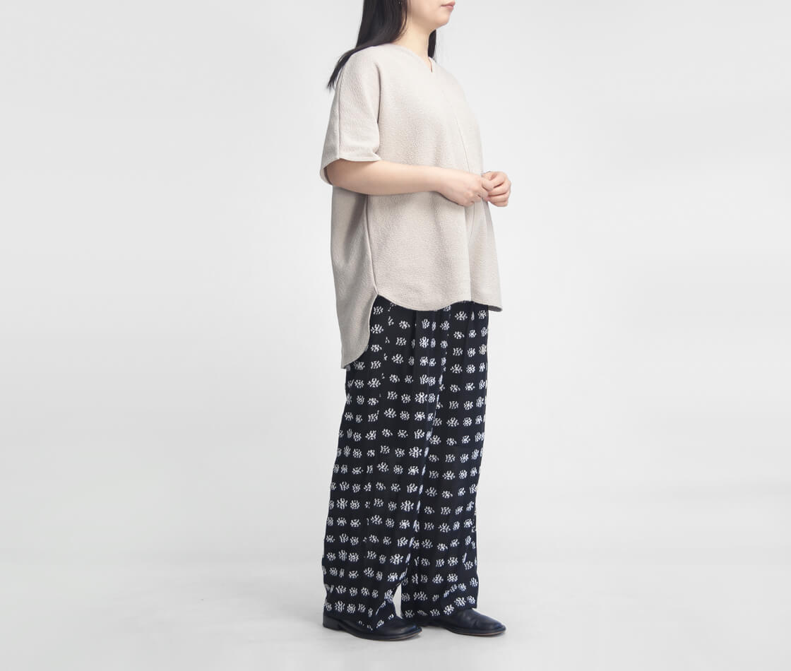レーヨンをベースにナイロンをブレンドした、柔らかいながらも形崩れしにくいジャカード生地を使用。表面の凹凸模様が、シンプルなトップスと合わせても存在感のあるコーデに。軽やかで涼しげな風合いの表地に加え、裏地はポリエステル生地を仕様しているので肌離れが良く、夏でも快適に着用できるのが嬉しいポイント。動くたびに美しく揺れ、上品な光沢感と滑らかな質感が華やかな印象をプラスします。総柄でも落ち着いた雰囲気で、大人のスタイルにぴったりの生地です。