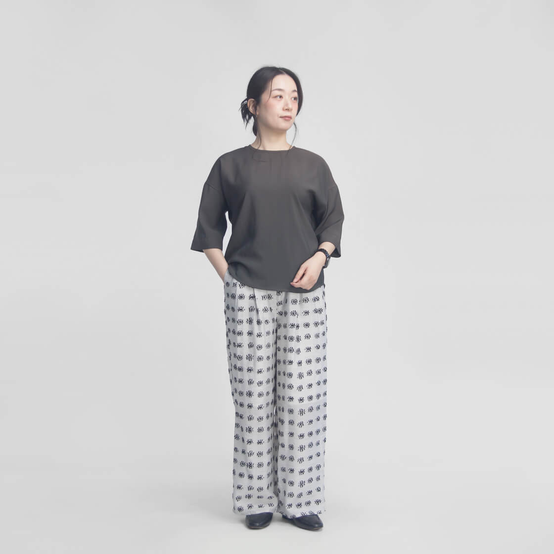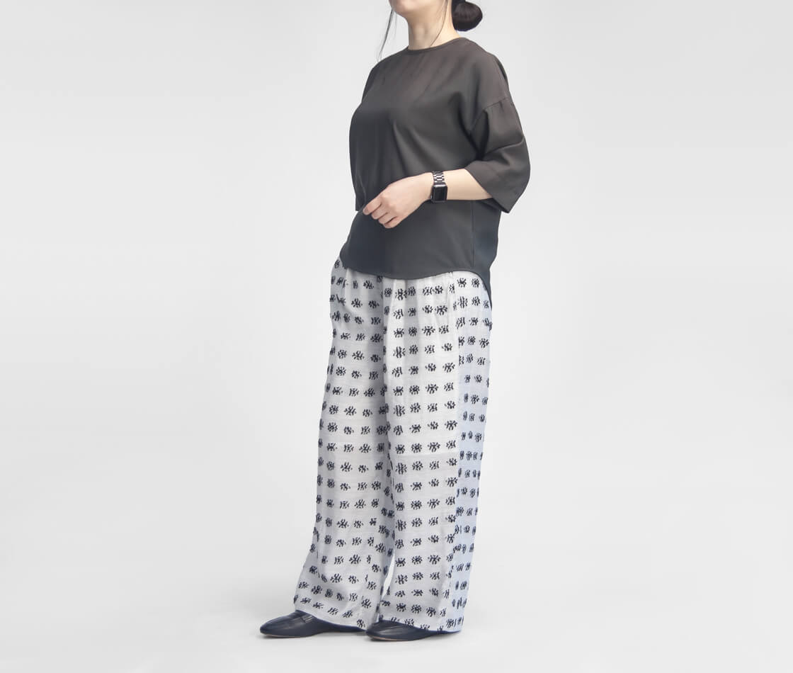 トップスはもちろん、パンプスやスニーカー、サンダルにもと足元も選ばないので、総柄ながら手持ちのアイテムに取り入れやすい一本に仕上がっています。