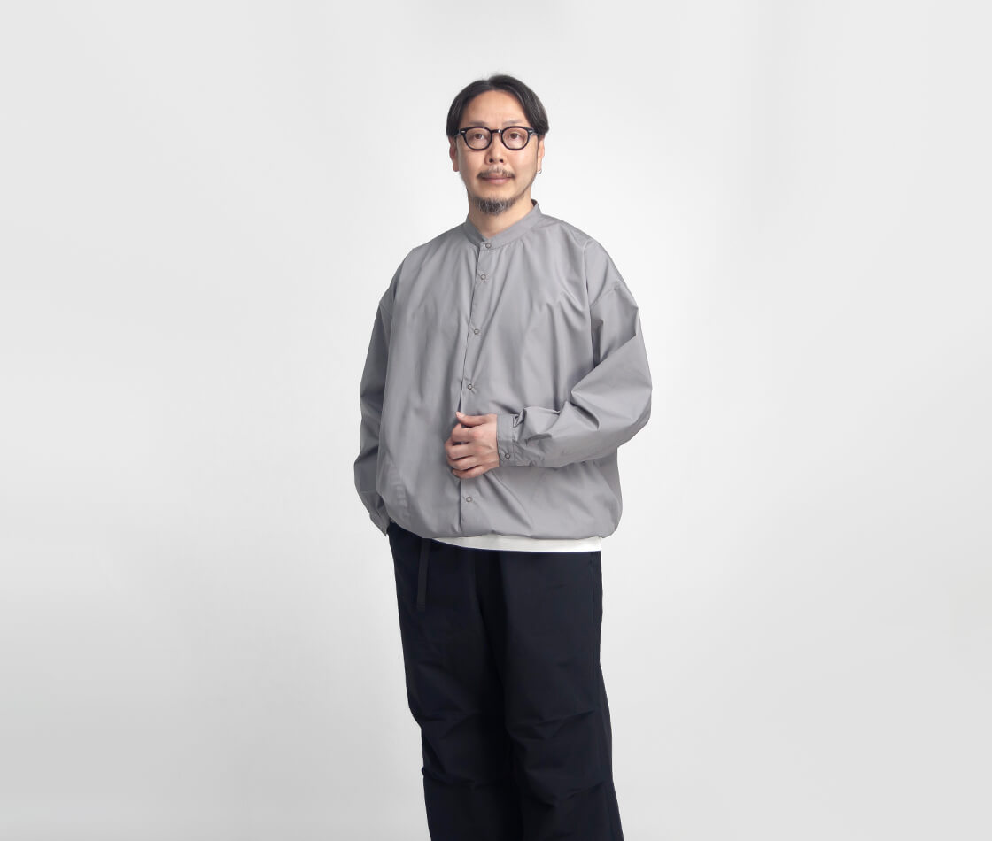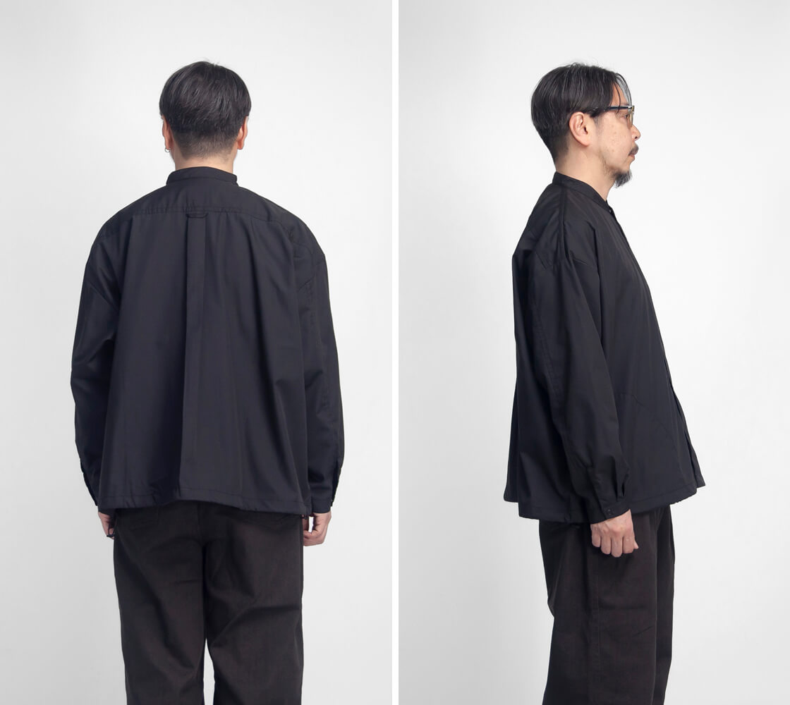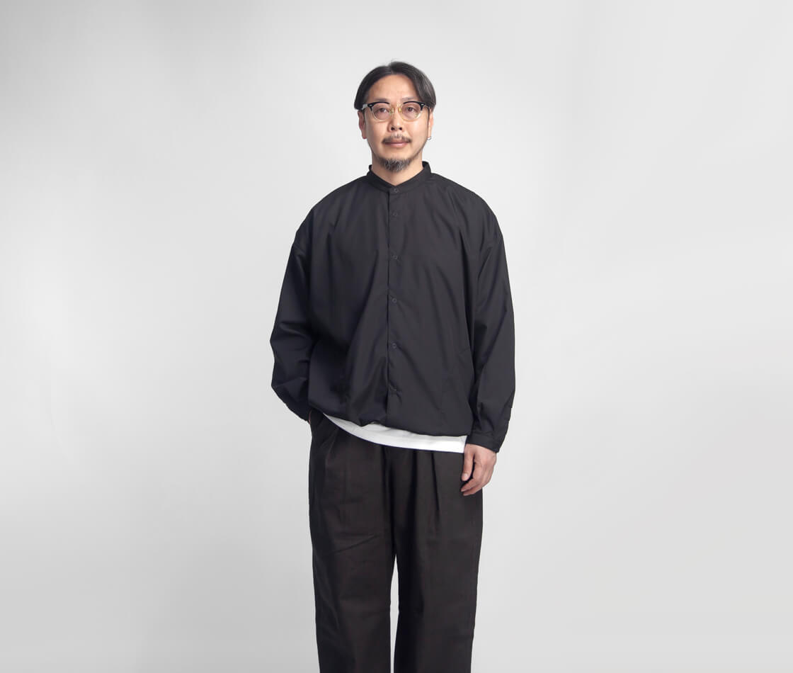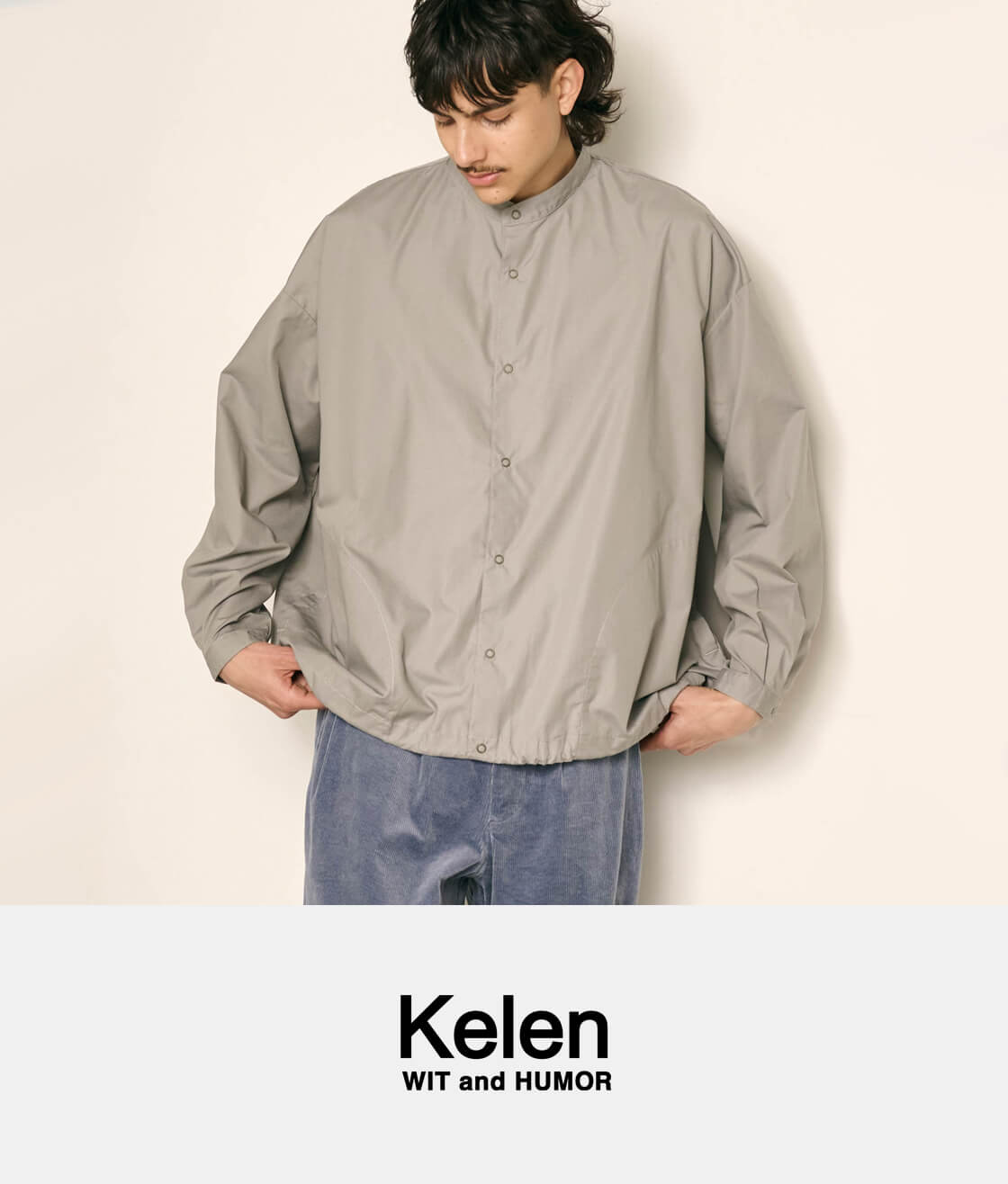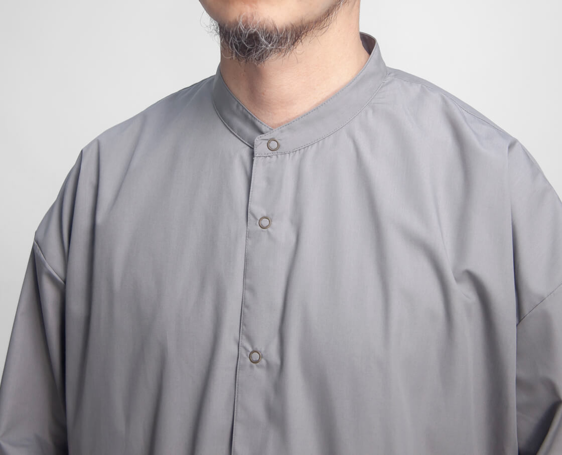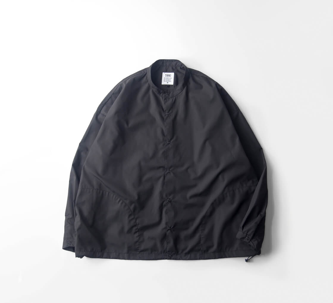 キメ細かなブロード生地を用いた、KELEN定番人気のバルーンシャツ「LIPMOA SOLID」。こなれた印象の襟が低めのバンドカラーで、フロントはスナップボタン開閉、脇にポケットが設けられたシャツアウター感覚で着用できる一着です。かなりたっぷりとさせた幅広な身幅は、裾に通されたドローコードをギュッと絞ることで、ブルゾンのようなバルーンシルエットへ変化させて着用することが可能。というか、このギュッと絞ったスタイルが気に入って仕入れを決定したのですが。もちろん裾を絞らなくても雰囲気良しですが、個人的には裾をギュッと絞って、首元もボタンを2・3個開けてラフに着崩して欲しい。クリーンな生地感もワイドなシルエットにマッチしてるし、羽織りにもインナーにもと使いまわしやすいのもポイント。