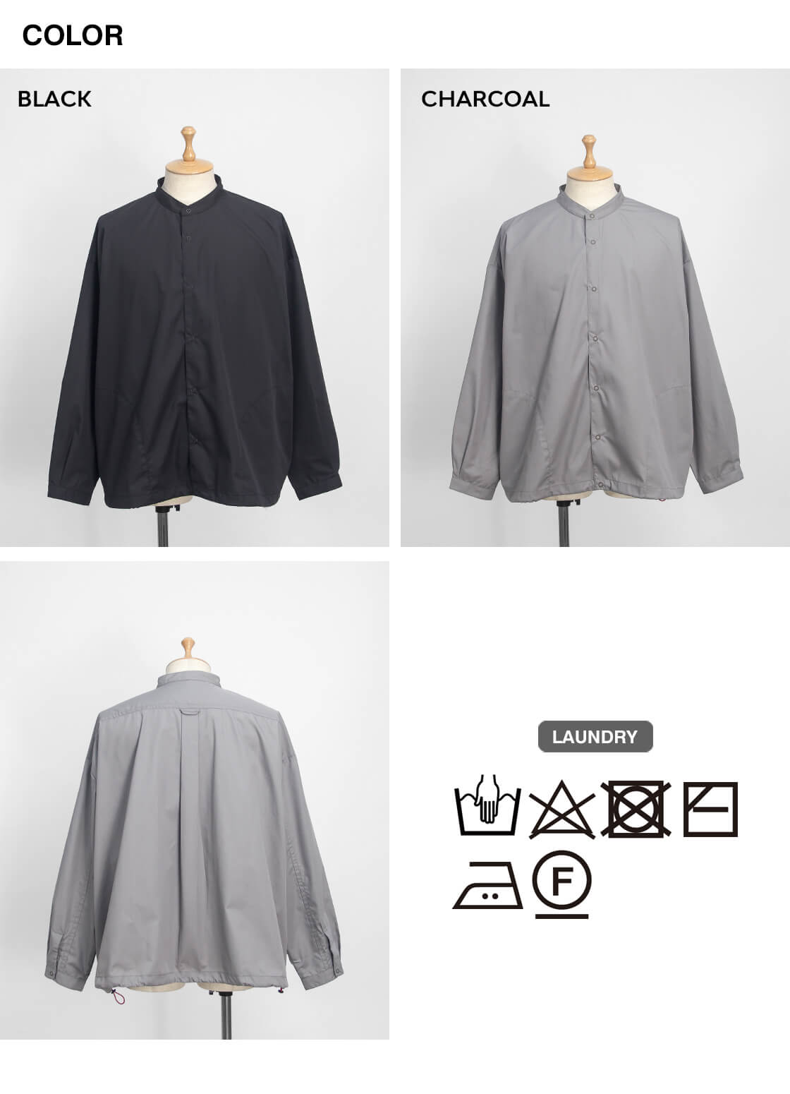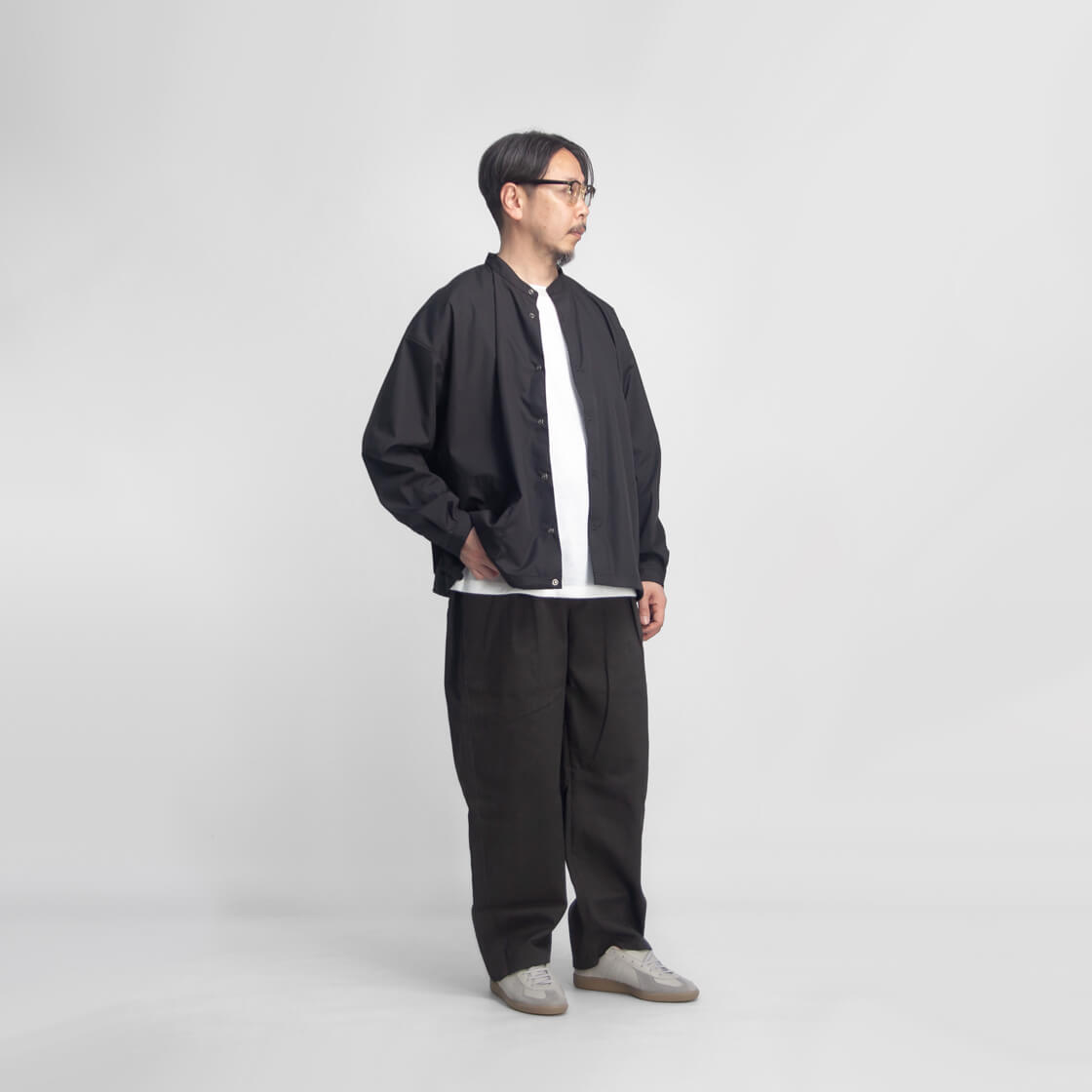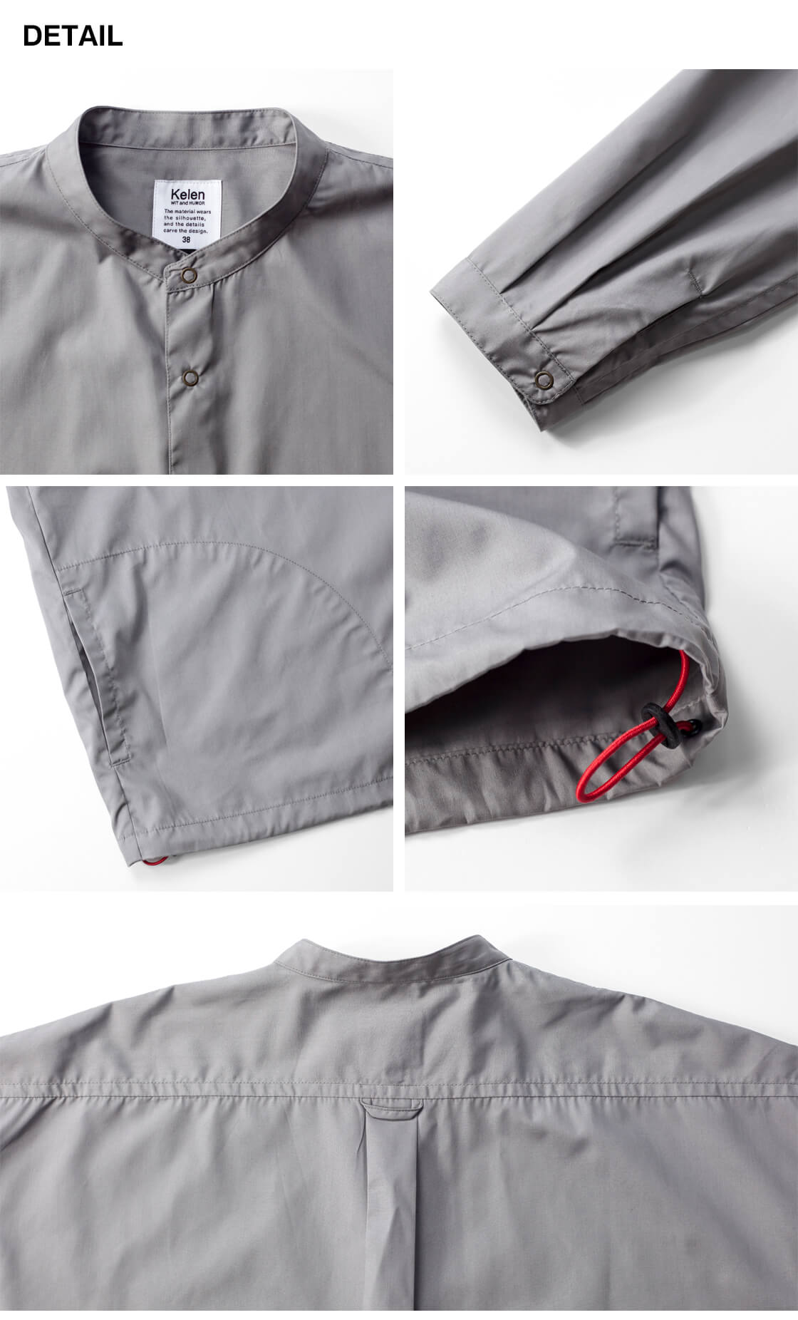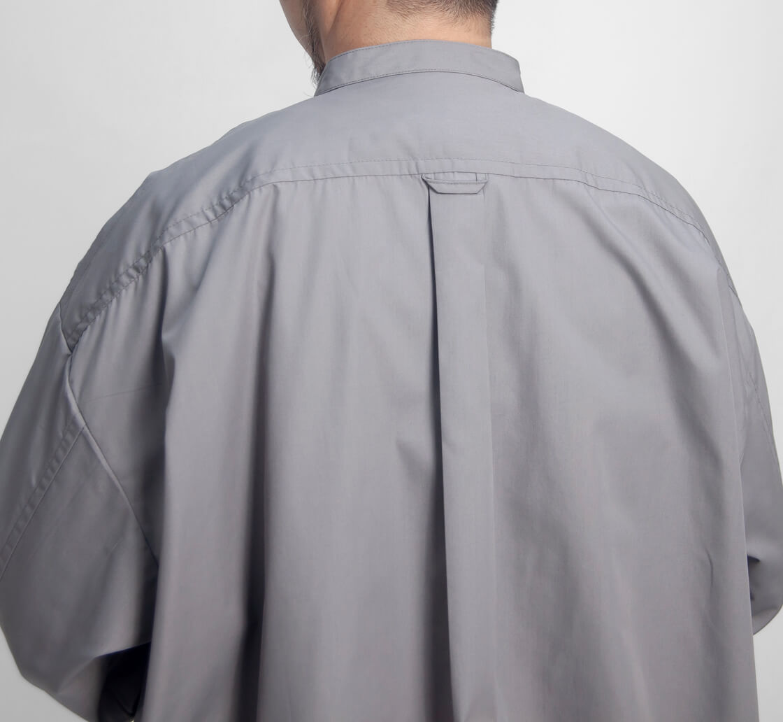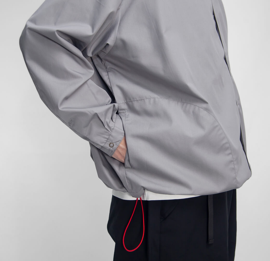 キメ細かなブロード生地を用いた、KELEN定番人気のバルーンシャツ「LIPMOA SOLID」。こなれた印象の襟が低めのバンドカラーで、フロントはスナップボタン開閉、脇にポケットが設けられたシャツアウター感覚で着用できる一着です。かなりたっぷりとさせた幅広な身幅は、裾に通されたドローコードをギュッと絞ることで、ブルゾンのようなバルーンシルエットへ変化させて着用することが可能。というか、このギュッと絞ったスタイルが気に入って仕入れを決定したのですが。もちろん裾を絞らなくても雰囲気良しですが、個人的には裾をギュッと絞って、首元もボタンを2・3個開けてラフに着崩して欲しい。クリーンな生地感もワイドなシルエットにマッチしてるし、羽織りにもインナーにもと使いまわしやすいのもポイント。