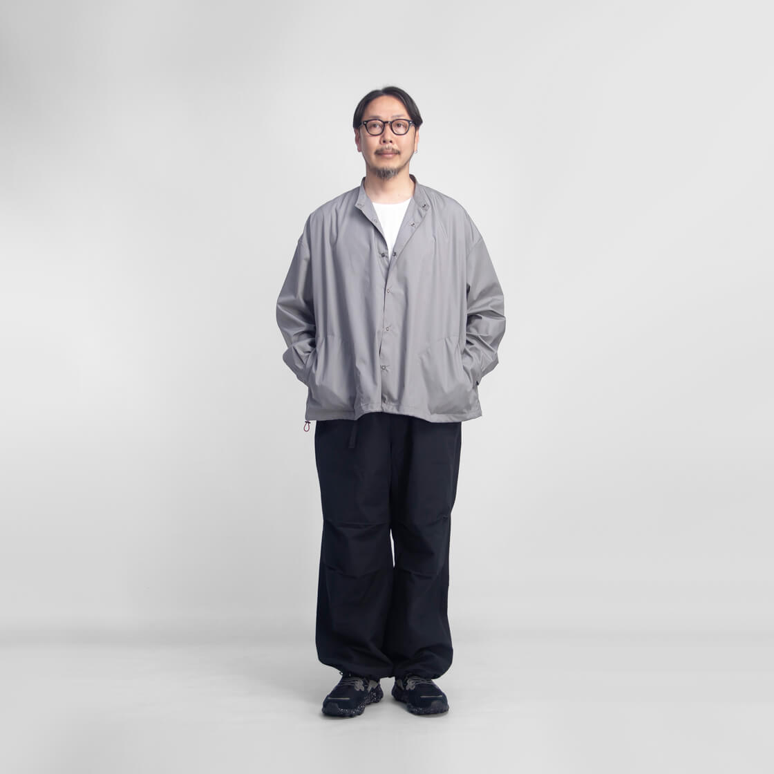38サイズを着用しました。ゆったりとしたオーバー気味なシルエットで、身幅もまだまだ余裕が感じられました。生地に伸縮性はありませんが生地が突っ張るような部分も無く着心地もノンストレスです。着丈のバランスも良く、裾も絞れるので違和感はありません。僕の場合、38サイズで十分ゆったりとしているので、特にサイズアップの必要はないかなと思います。