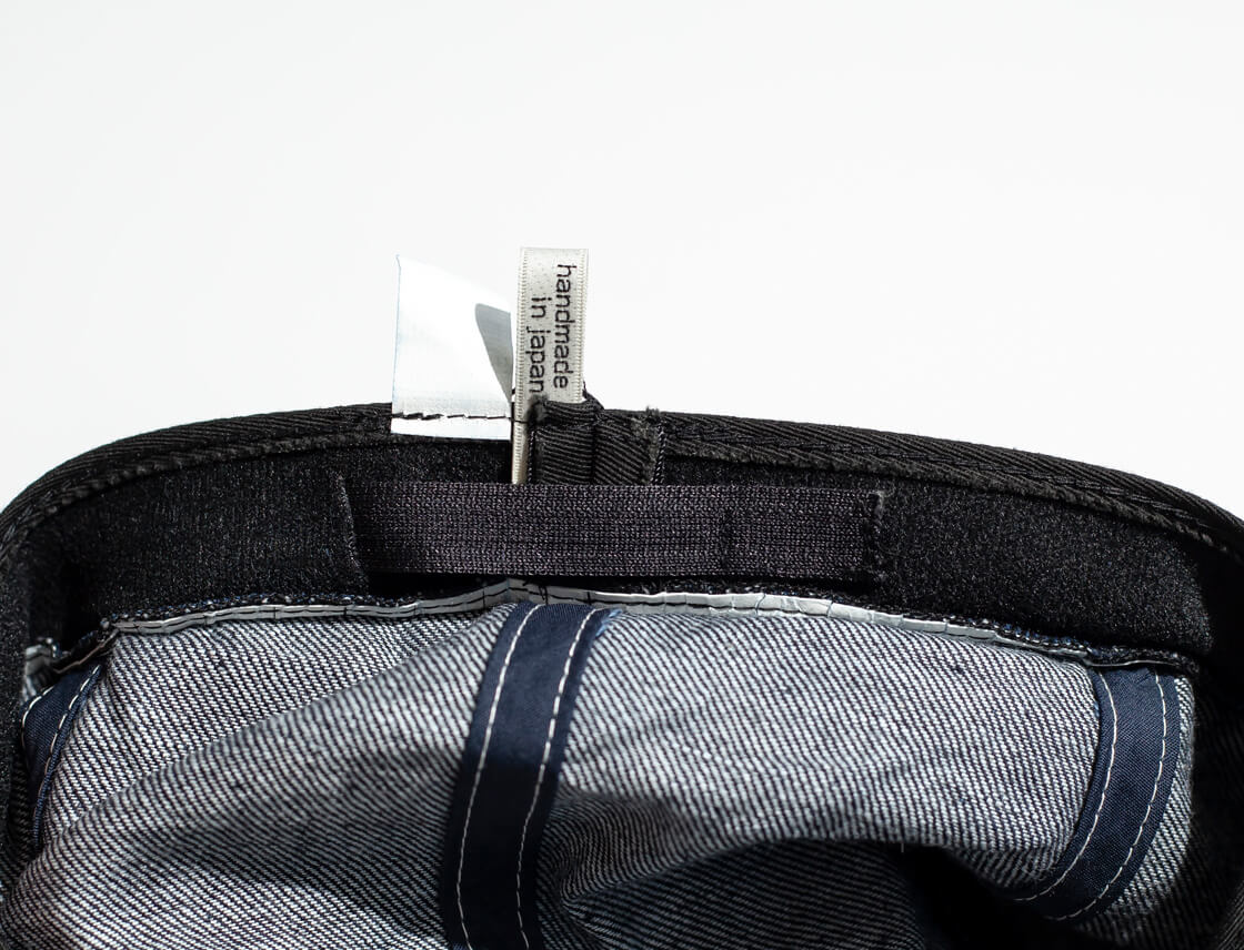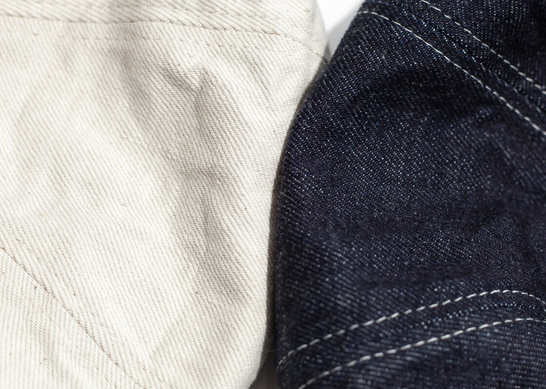 本体の素材に用いているのは、デニムの聖地、岡山県井原で製作された12オンスのムラ糸デニム生地。12オンスといえば、パンツに使うほどの高いオンスのデニム生地なのですが、ゴワつき感はなく、軽さも感じられる被り心地です。そして生地の表情がとっても豊か。糸そのものがランダムなムラ糸を使用しているため、インディゴ糸と未晒し糸の色差で遠くから見ると光沢があるようなシャープさがあります。色落ちした際もムラが強く生まれ、ヴィンテージ感のあるタテ落ちが期待できるデニム生地です。生成りカスを生地に残した、素朴な風合い・粗野感が感じられるECRUカラーの表情も魅力です。