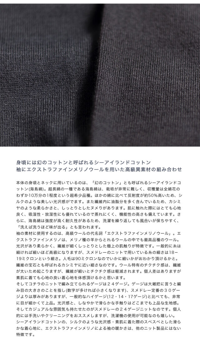 シーアイランドコットンの、シルクのような光沢感・素肌に着た際のスベスベとした滑らかな着心地に、エクストラファインメリノによる袖の暖かさは、他のニット製品では表現できない特徴とデザイン性が楽しめる特別な1枚です。