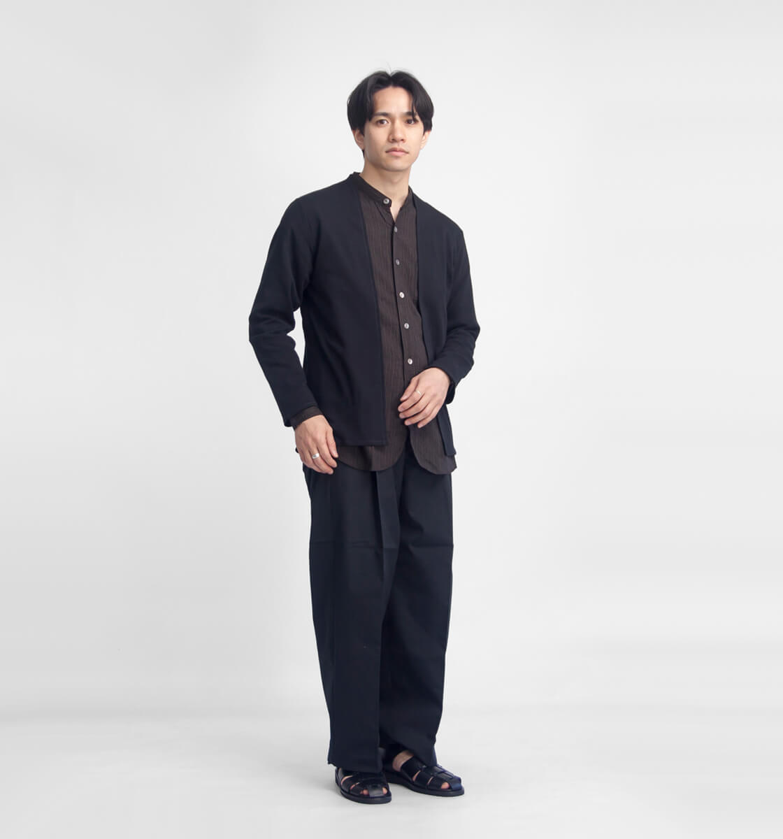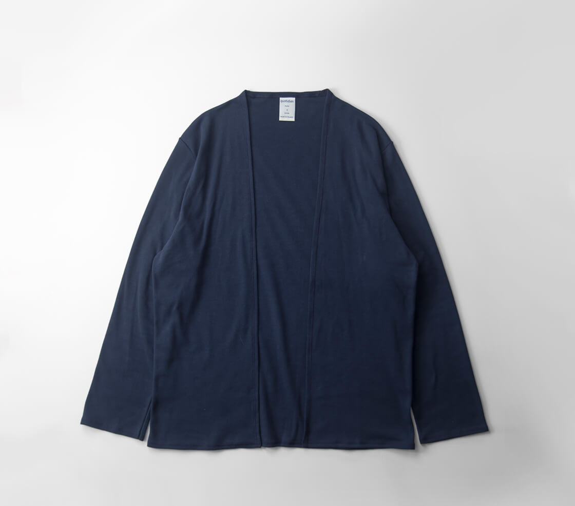 ふわっとした柔らかさと、抜群の伸縮性を兼ね備えたフライス生地で仕立てた、quotidianのボタンレスカットソーカーディガン。肌着にも用いられる両面リブ編みならではの、なめらかでやさしいタッチは、ずっと着ていたくなる心地よさです。デザインはごくシンプル。ボタンや袖口のリブを省いたミニマルな仕様は、すっきりと軽やかな印象で、生地のしなやかさと自然な落ち感が引き立つ作りです。体にすっと沿う細身のシルエットで、腕まわりも細身ではありますが、生地がしっかり伸びてくれるので窮屈さはなく、体を包むようなフィット感に。生地の良さをダイレクトに体感していただけます。微光沢のある表面がラフになりすぎず、Tシャツやシャツの上からさっと羽織るだけで、程よく品のあるスタイリングに。薄手でかさばりにくく、バッグに入れても邪魔にならないため、夏場の冷房対策や朝晩の気温差のある時期に重宝します。旅行や出張の際にも一枚あると安心で、シーンを問わず気軽に使えるのも魅力です。また、同素材のTシャツと合わせて、アンサンブルで着こなすのもおすすめです。