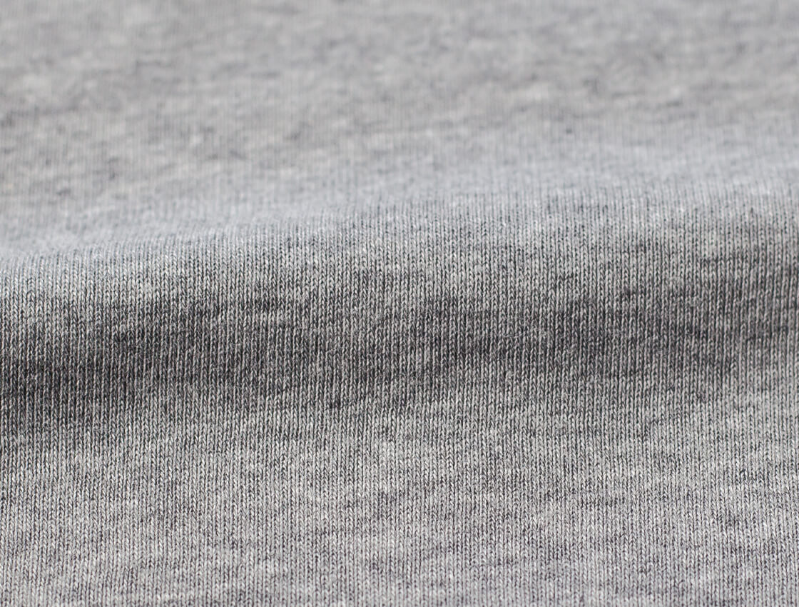 生地には、横方向にぐっと伸びるリブ編みのフライス素材を採用。Tシャツに良く用いられる天竺生地にはない、やわらかさと適度な厚み、そして優れた伸縮性が特長です。1×1のリブ編み組織で、両面とも表地としても使える両面編み(スムース編み)で仕上げることにより、表面はなめらかでやさしい光沢感に。肌あたりが非常にやさしく、それでいて型崩れしにくく、シワにもなりにくい扱いやすさも備えています。ベビー服にも用いられるほどやさしいタッチで、モチっとしながらもふんわりと軽い着心地。一度袖を通すと、その快適さに納得していただけるはずです。