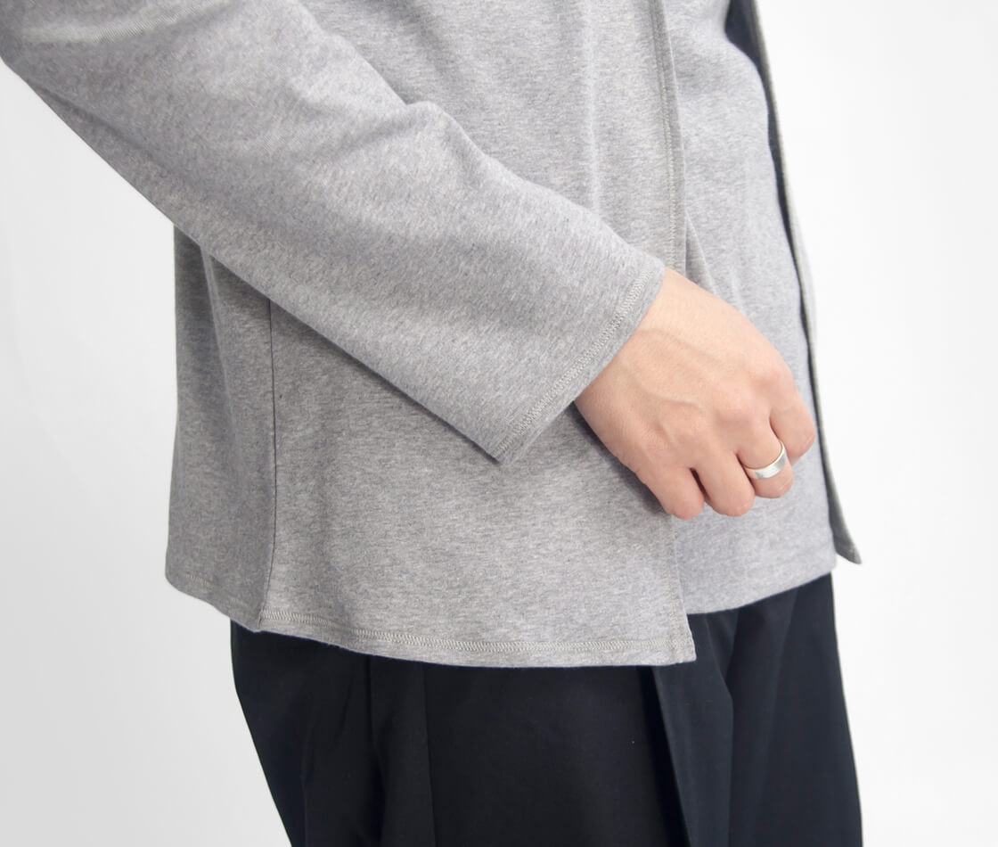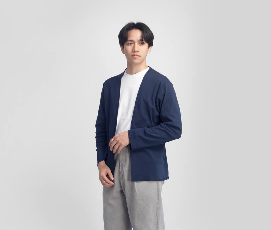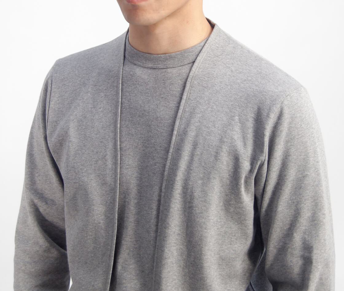 上質なフライス生地で体を包むような着心地。さっと羽織れる、薄手でしなやかなカーディガン。
