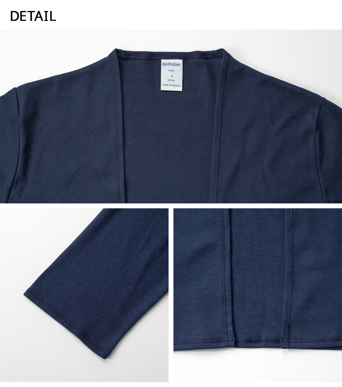 フランス語で「日常の」という意味を持つquotidien(コティディアン)は1973年にフランス・シャンパーニュ地方にて創業しました。エルメスなどのハイブランドのカットソーの生産を受け持った実績もあり、上質な素材と縫製面や品質管理でも信頼性が高く、100%フランス製でありながらもコストパフォーマンスに優れたフランスブランドです。